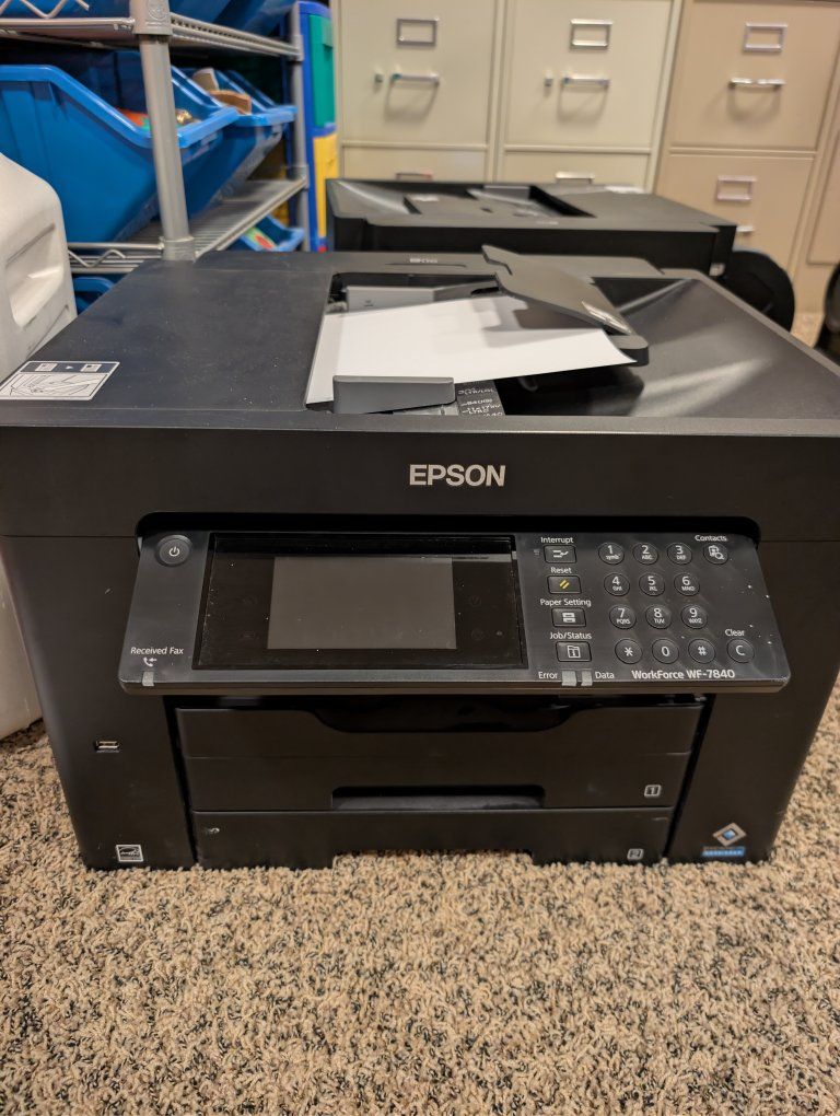 ZelleEpson workforce pro WF 7840 wide format all in one printer. power cord and extra black ink included. short on blue yellow and magenta ink. works great recently removed from office renovation. 2 total, cost is $120 each.