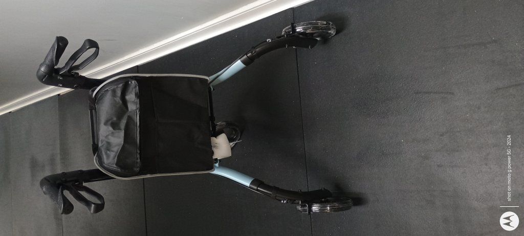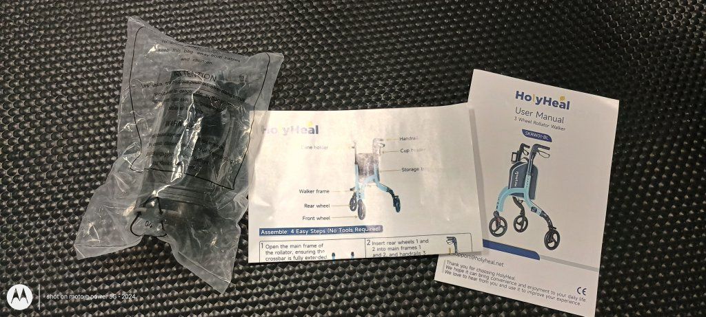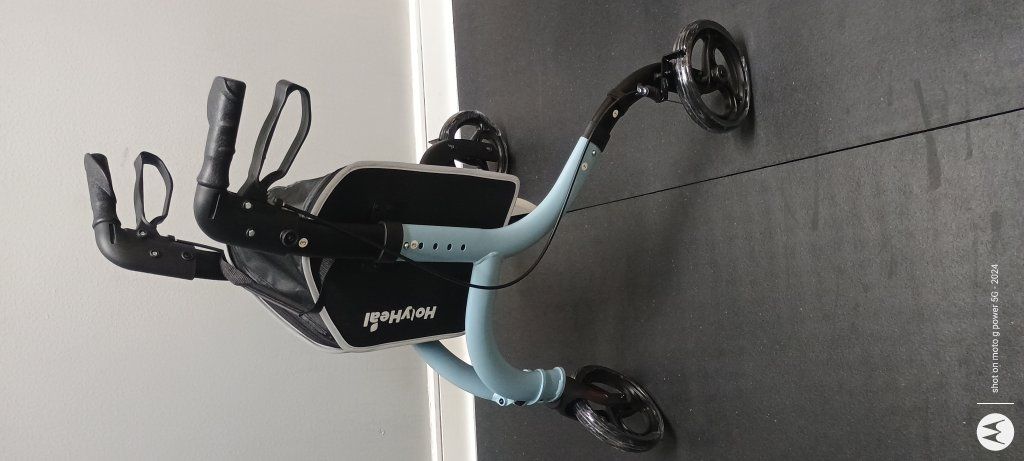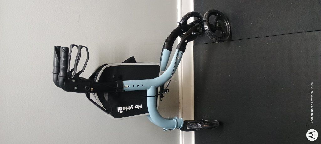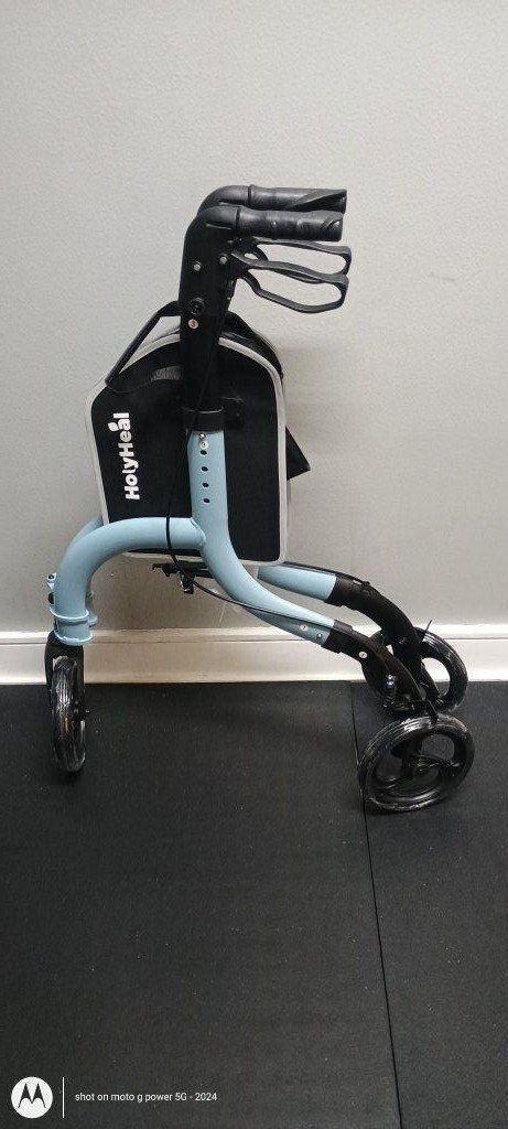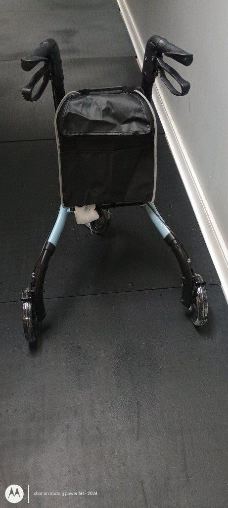Brand new freshly out of the box and ready to be used by you or your loved one! Lightweight HolyHeal 3-wheel rollator walker is light blue with black accents. It has adjustable height handles with hand brakes and a large black storage bag on the front. Comes with a cup holder and cane holder. Frame is sturdy metal with a 350lb weight capacity and wheels still have the plastic wrapping on. Folds up in half very easily for convenient storage.