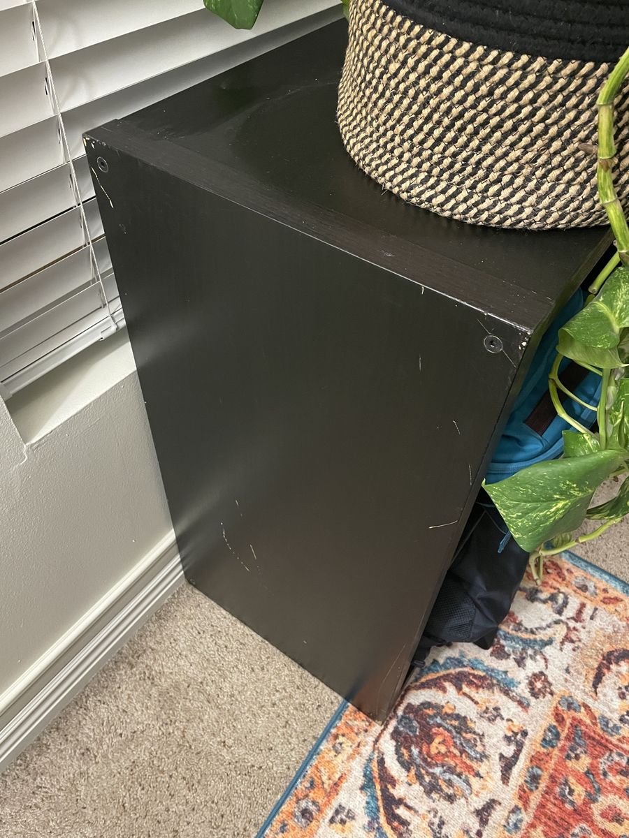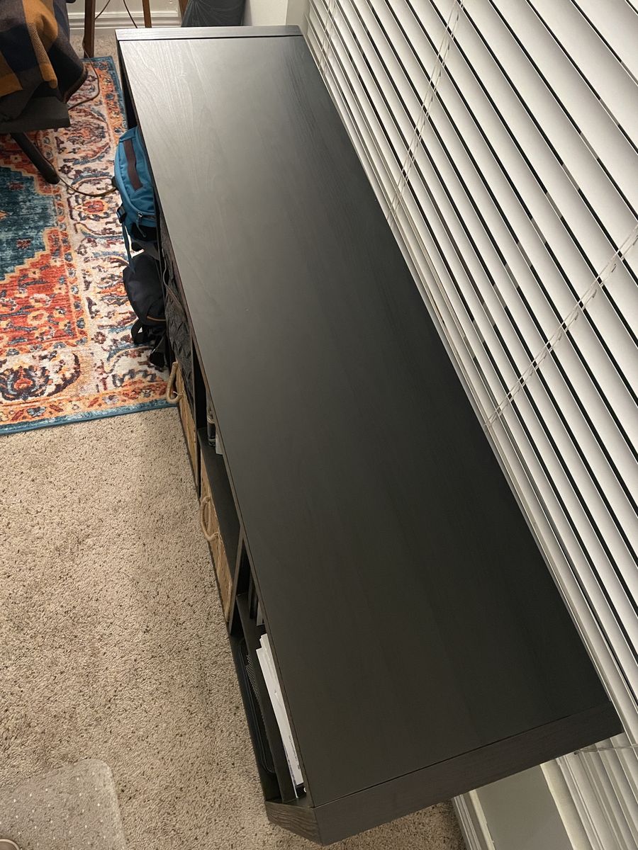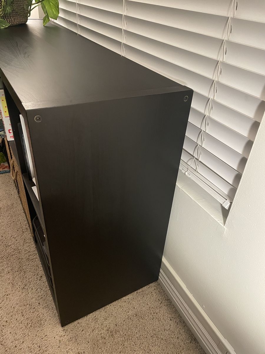 VenmoBlack wood storage cube shelving dimensions 58” x 30” x 15.5” Great for a media console, bookshelf, gear cubby. It’s sturdy and in great shape except for a few scratches on one of the 30” sides. Each interior cube is 13” x 13”. Storage baskets not included.