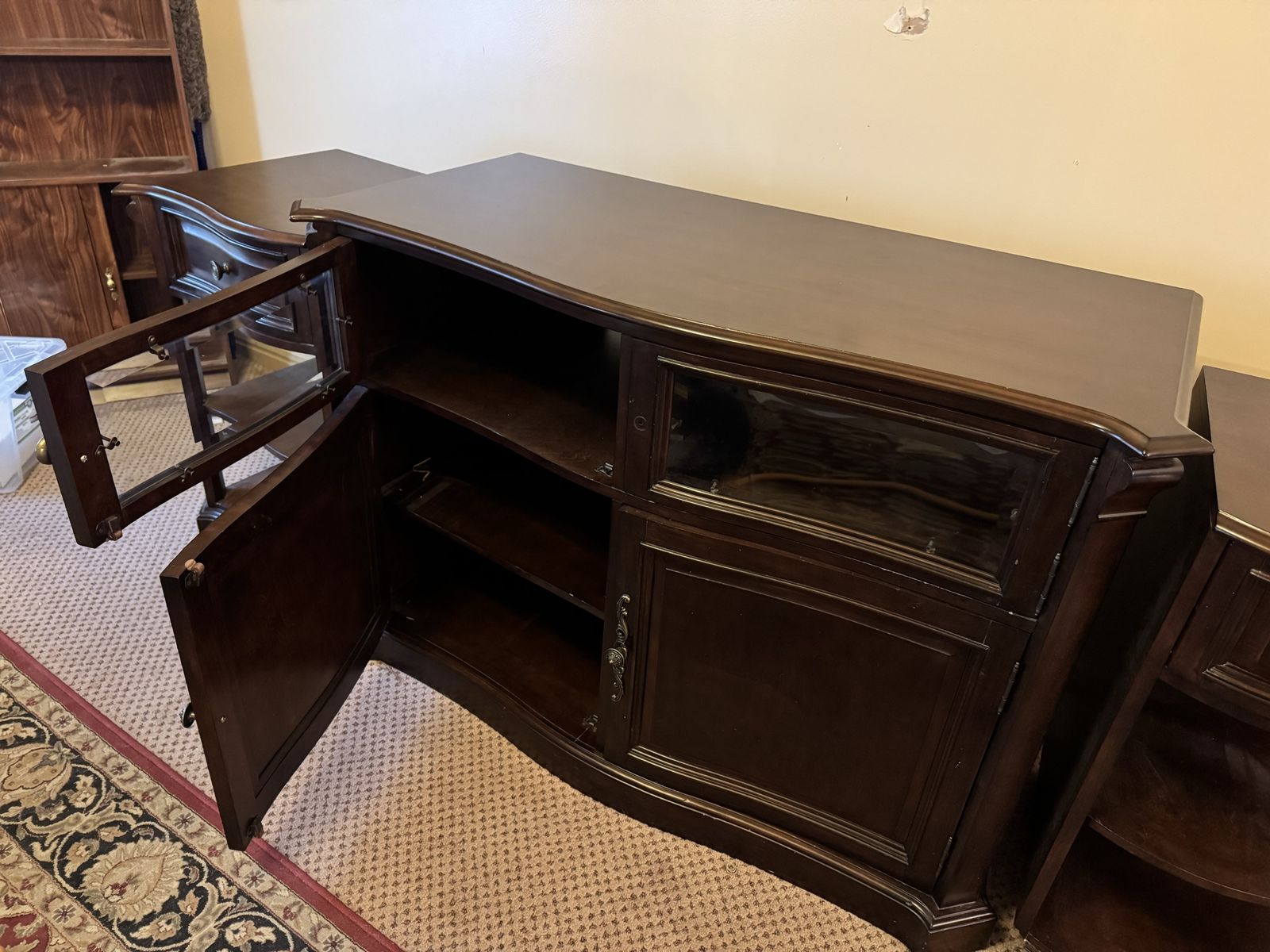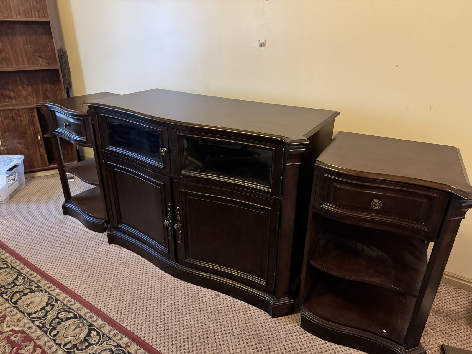 VenmoSolid in good shape, great for under a large tv. It’s about 7’ wide when all set together, and 33”, 36” respectively.