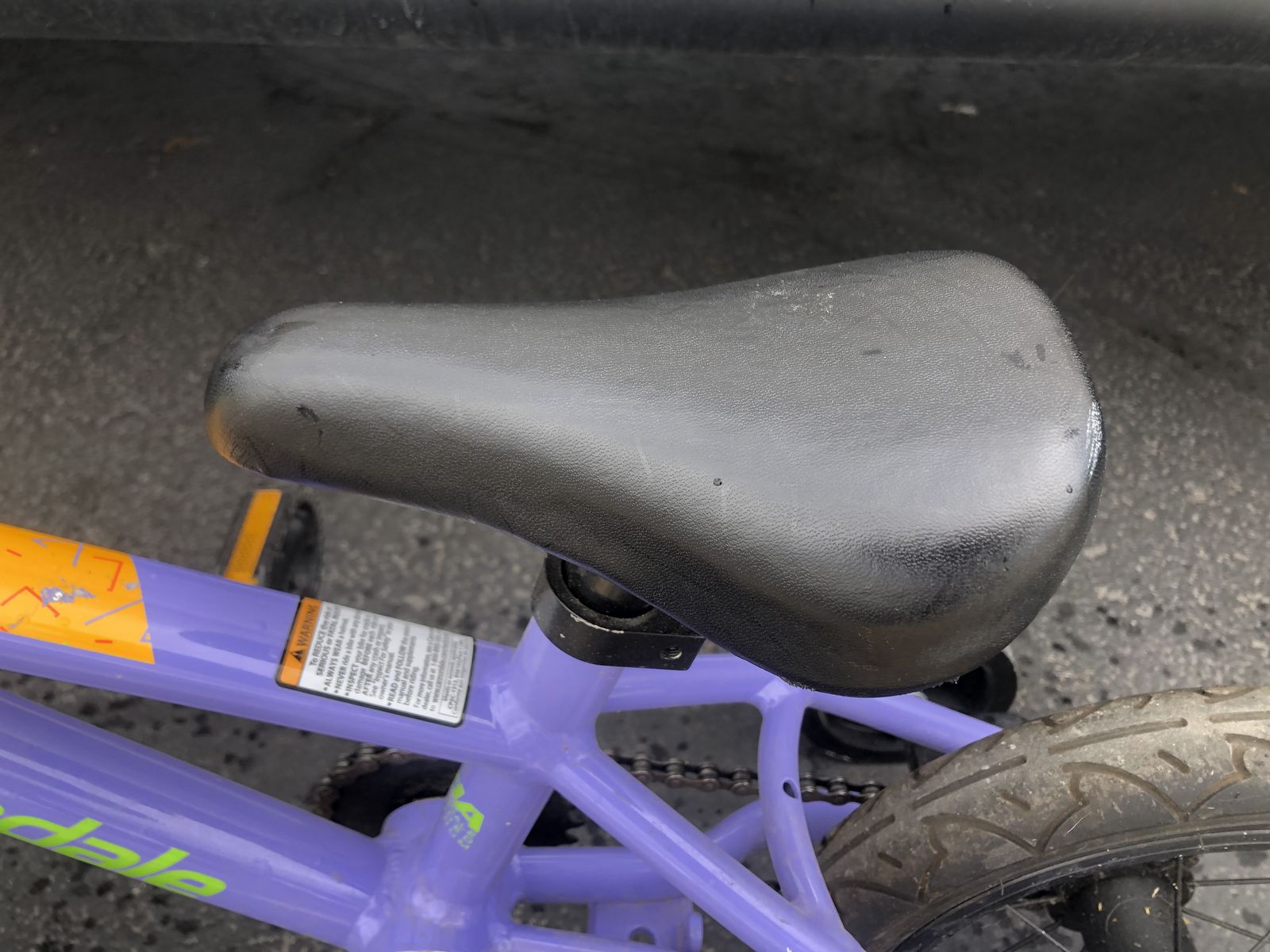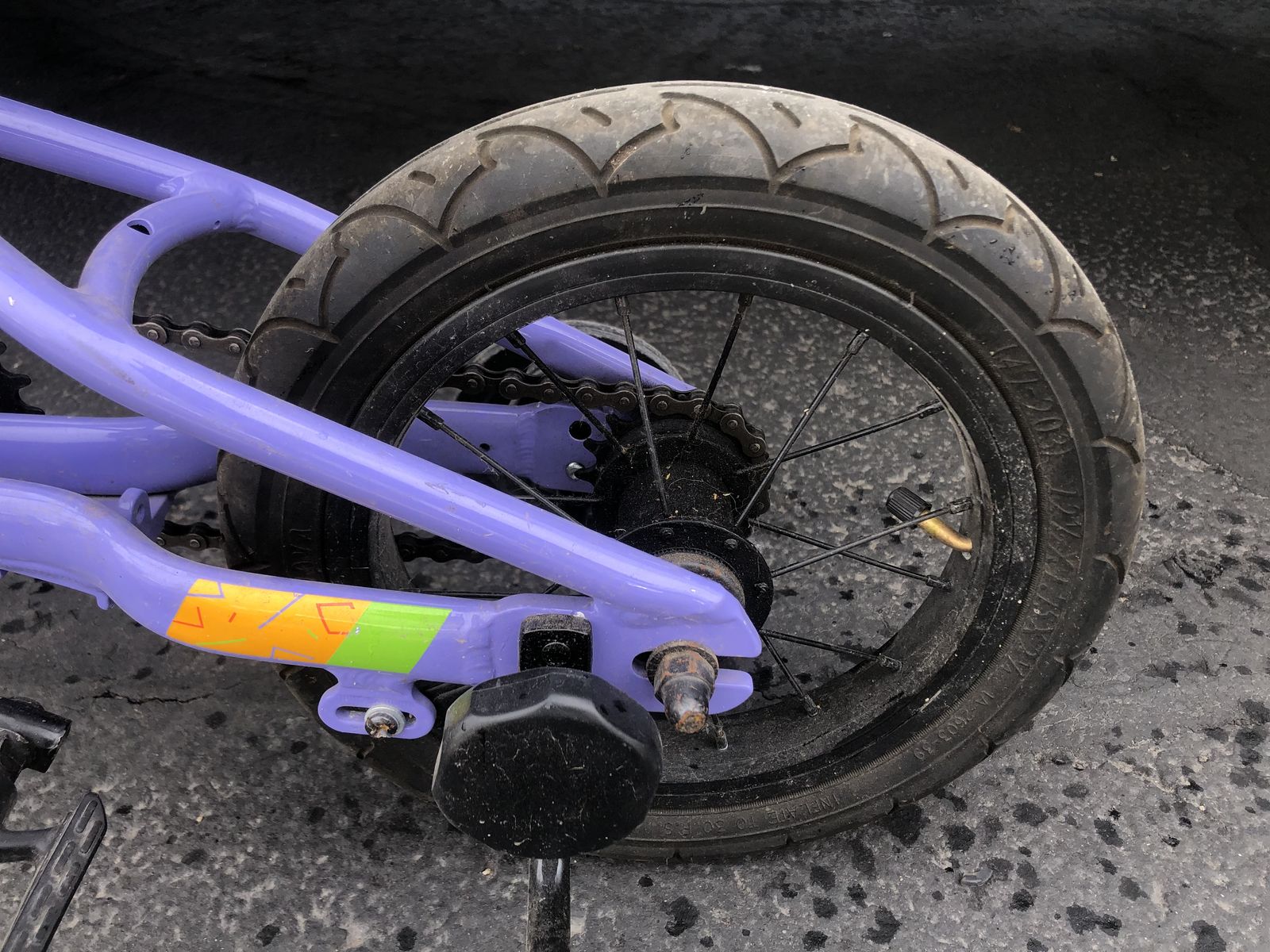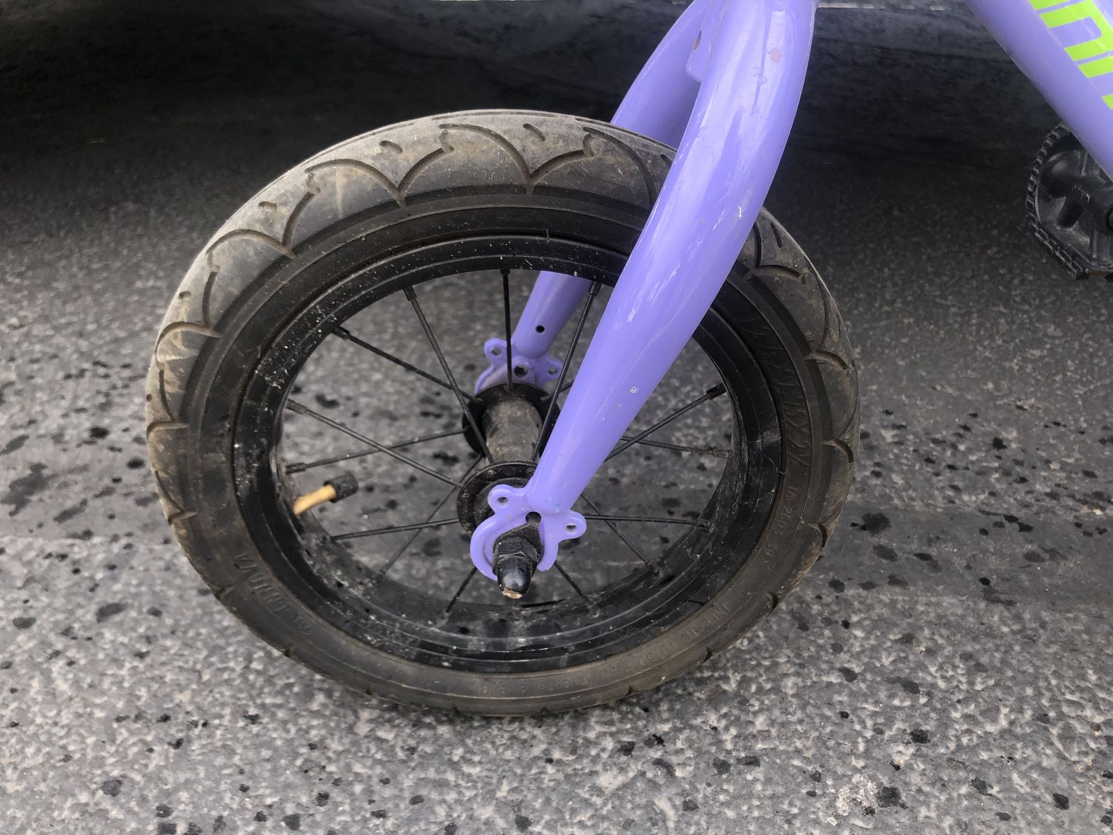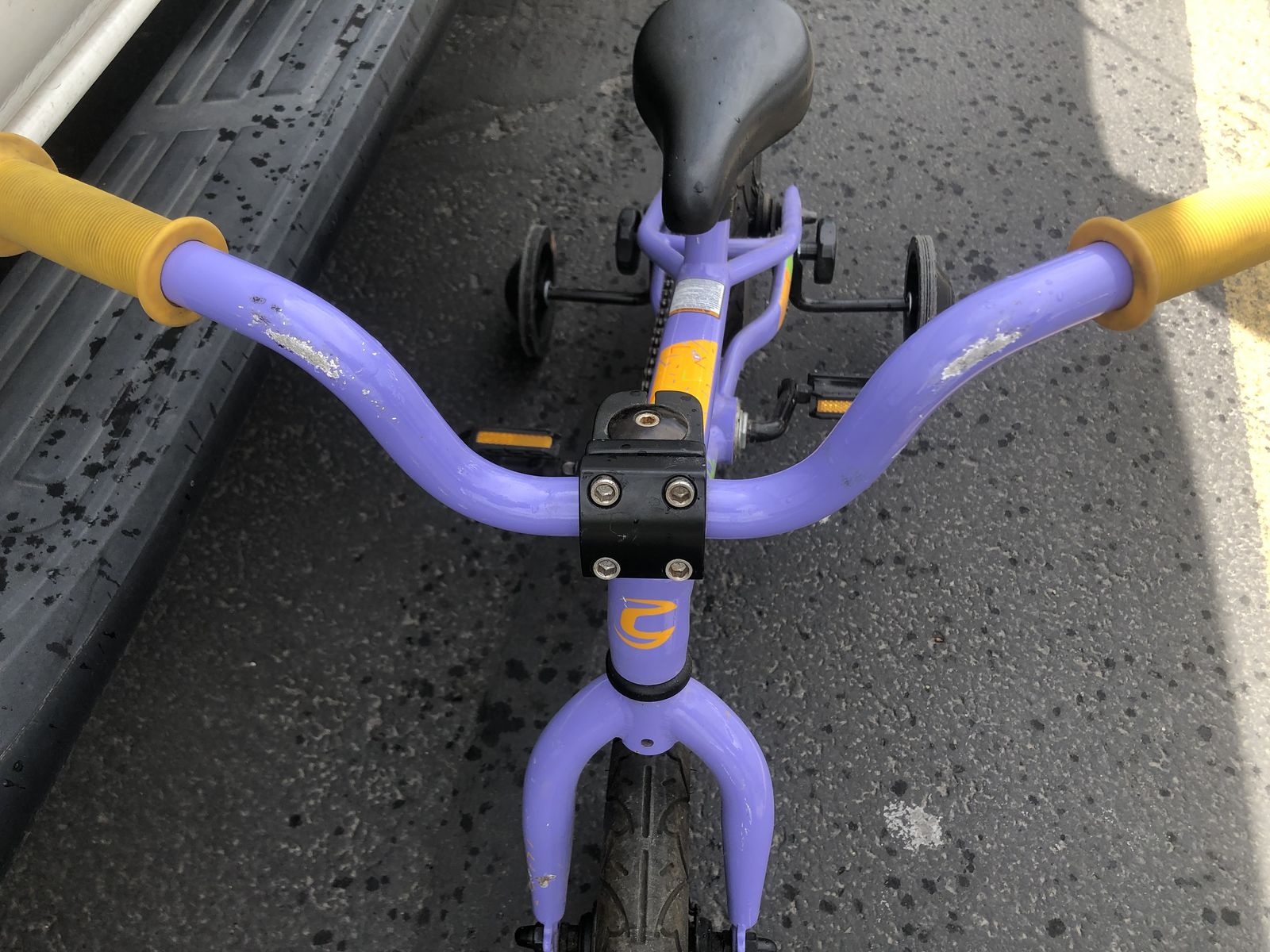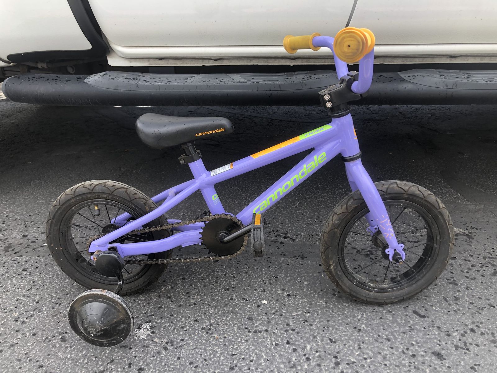 12 inch wheels. Training Wheels Included. Adjustable Seat. Recommended for Height 2'6" to 3'3" Tall. In Overall Great Condition Including Seat, Grips and Tires. Some scratches on the handlebars (as shown). No Mechanical Issues Clean Bike Ready To Go.