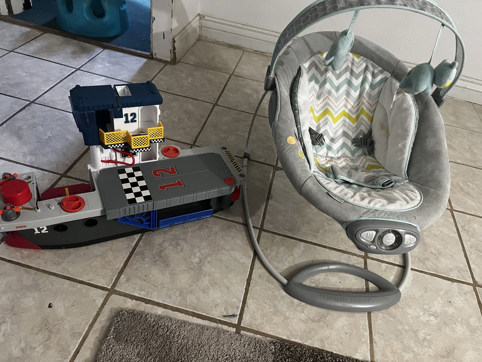 Basketball toy - has sounds, registers when a ball goes through the hoop. Also has a soccer ball trigger which I haven’t dig out yet. $10 OBO Baby walker - great walker, can adjust to different heights, toy works great, $10 OBO Aircraft carrier - fun little toy, we just need to down size on the amount of toys we have! $5 Baby bouncer - in great shape, has music and 2 different vibration/bouncing settings. $15 OBO Greco click to connect Stroller - wonderful stroller! Can work with any click to connect car seat or switch the seat from forward facing to backward facing. $30