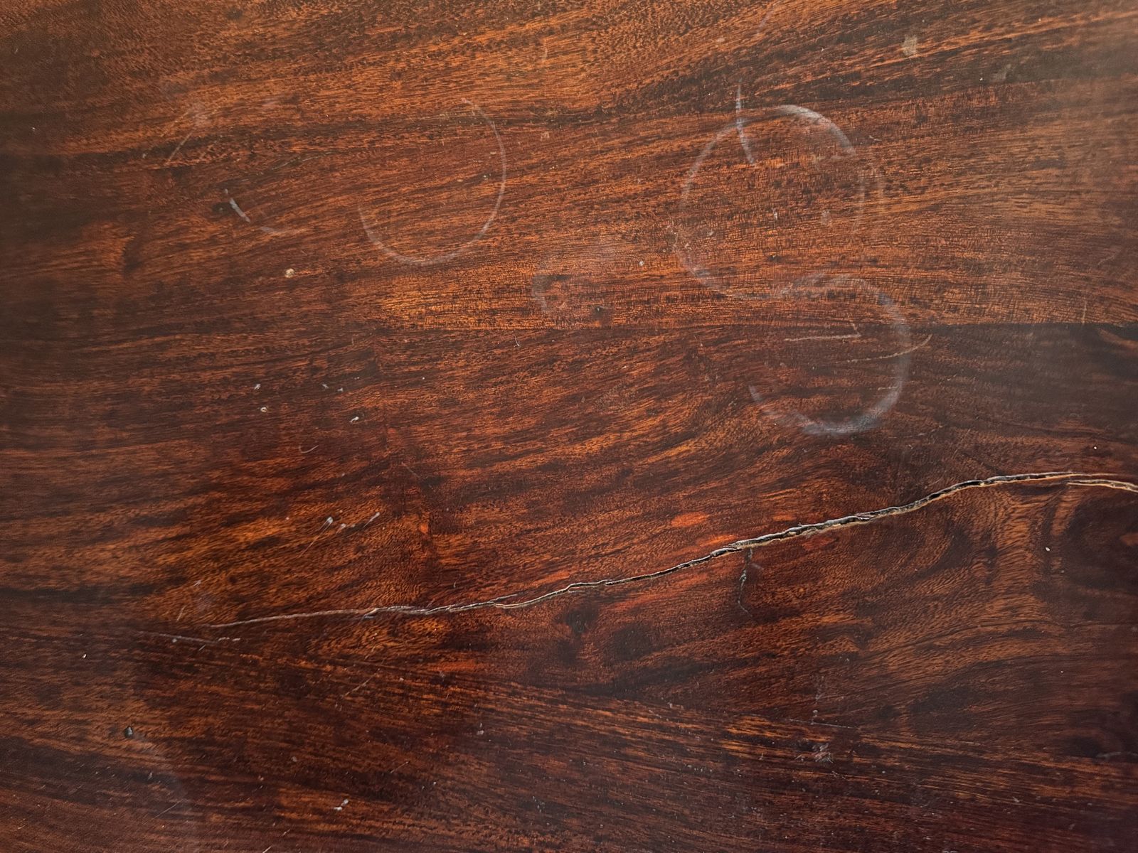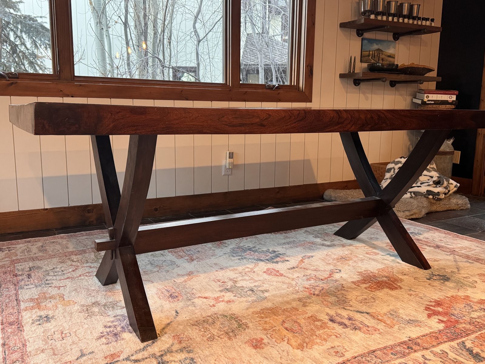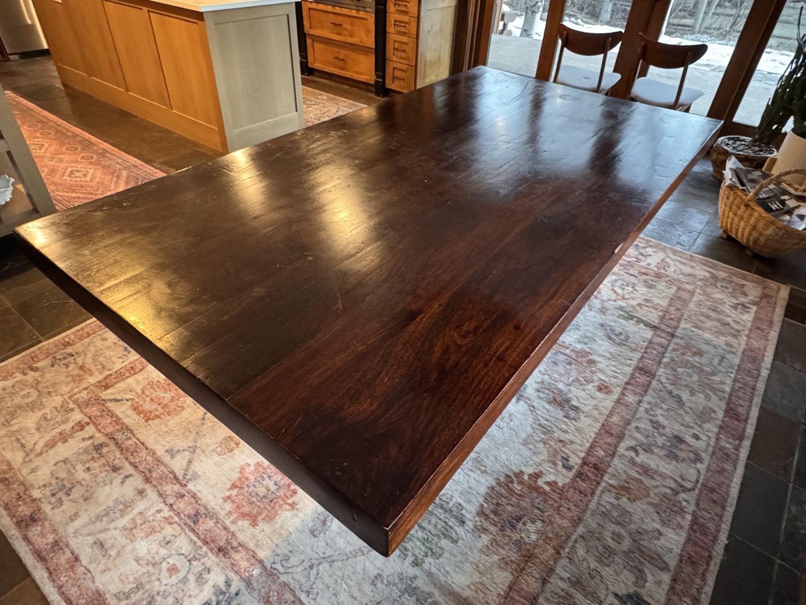 Wood dining table with wood veneer top. Very sturdy and comfortably seats 6 people. Size is 82.5” long x 43.5” wide x 30.5” high. No chairs included. Overall good condition but has a couple of water stains. Cash or Venmo only.