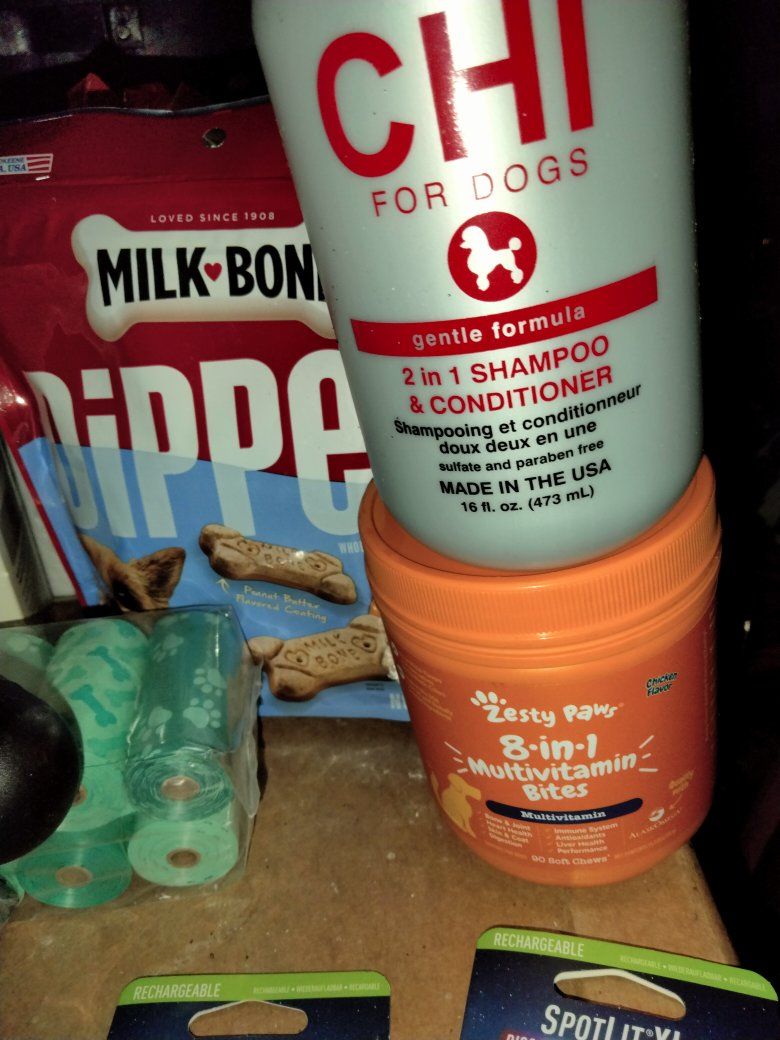 PayPalbunch of brand new dog stuff!! *Milkbone dipped treats 12oz bag unopened *Shank Bone 6oz still in plastic new 2 of them *CHI 2in 1 shampoo and conditioner 16oz *Zesty Paws 8 in 1 multivitamin bites 90 soft chews *Top Paw double dog coupler *Spotlit xl collar light 2 of them *ANDIS quiet pet nail care cordless nail grinder *Top Paw waste bag dispenser *Top Paw waste bags 120 bags All is brand new unopened make offer need gone!