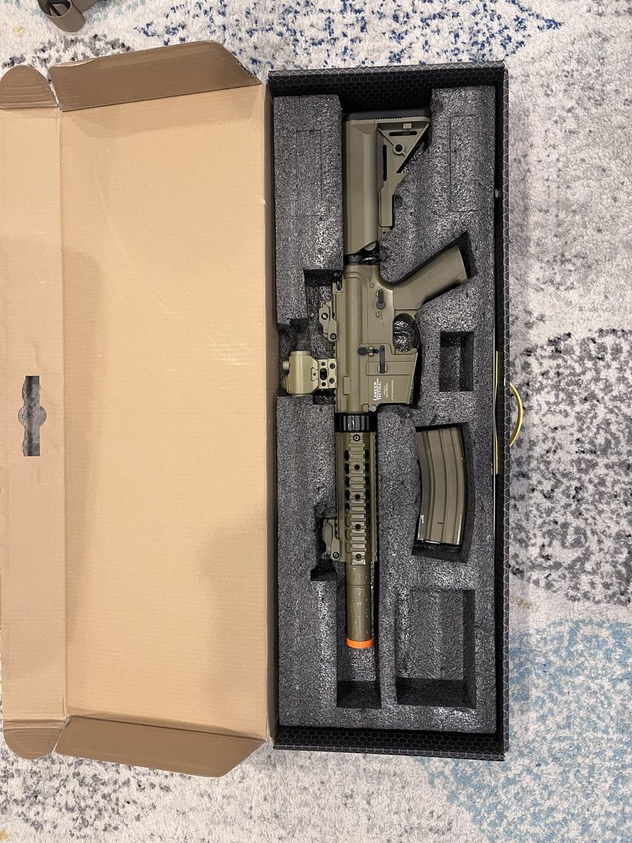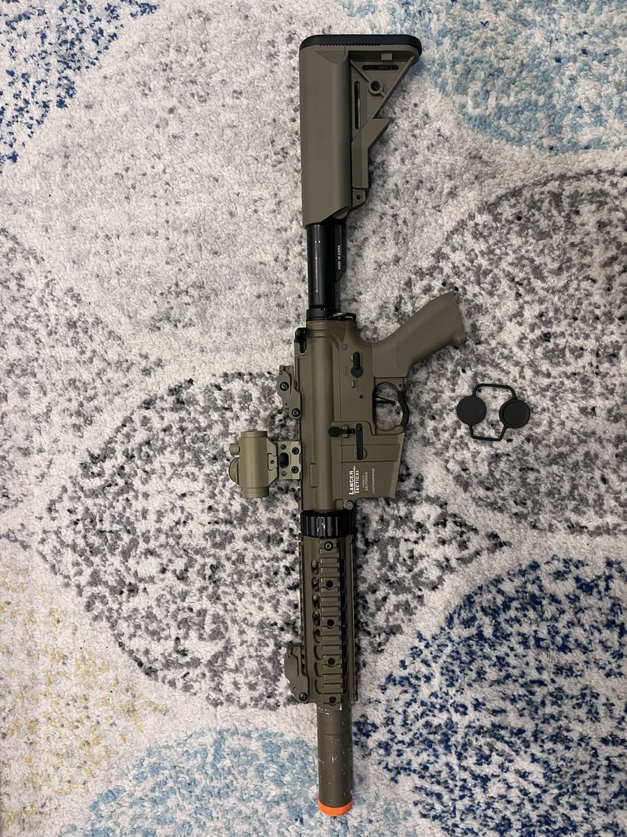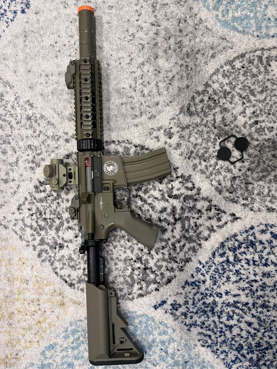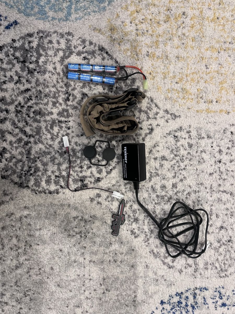 ApplePayElectric airsoft gun about 330-350 fps with .20 gram bbs, has fair wear to it charging handle is broken, warning it breaks easily! I’ve replaced it like 3 times So be gentle with it. I have been maintaining and cleaning it the whole time I’ve had it. Comes with a 9.6V 1600mah nimh battery and comes with a smart charger to not have battery catch fire. Also comes with a sling and a Scope but battery needs to be replaced also comes with a patch.