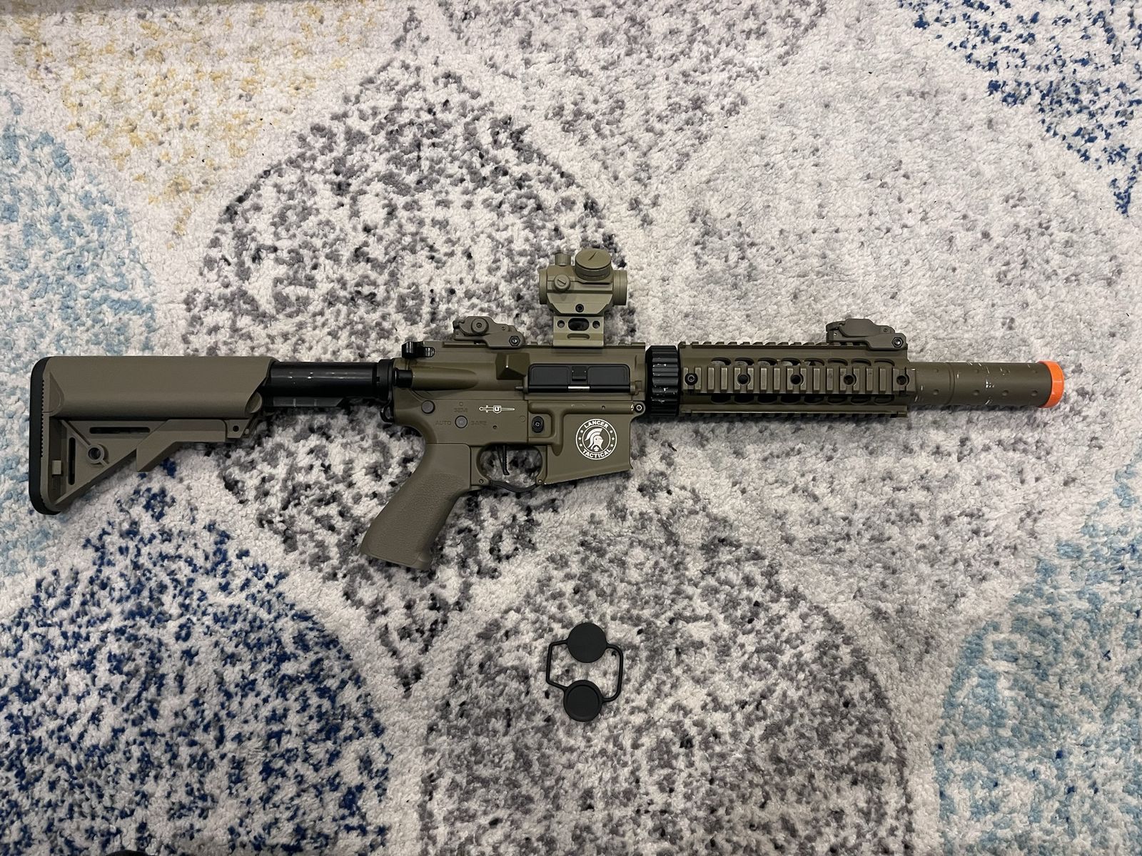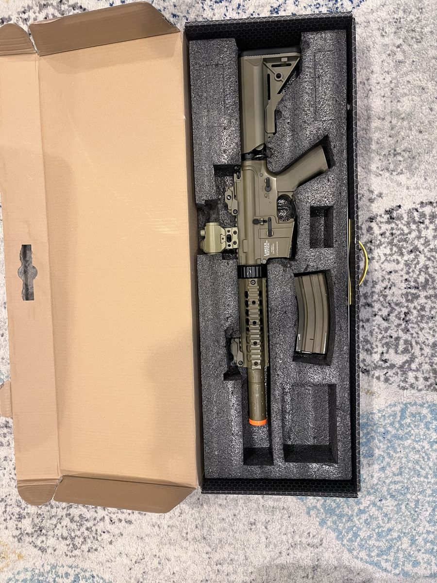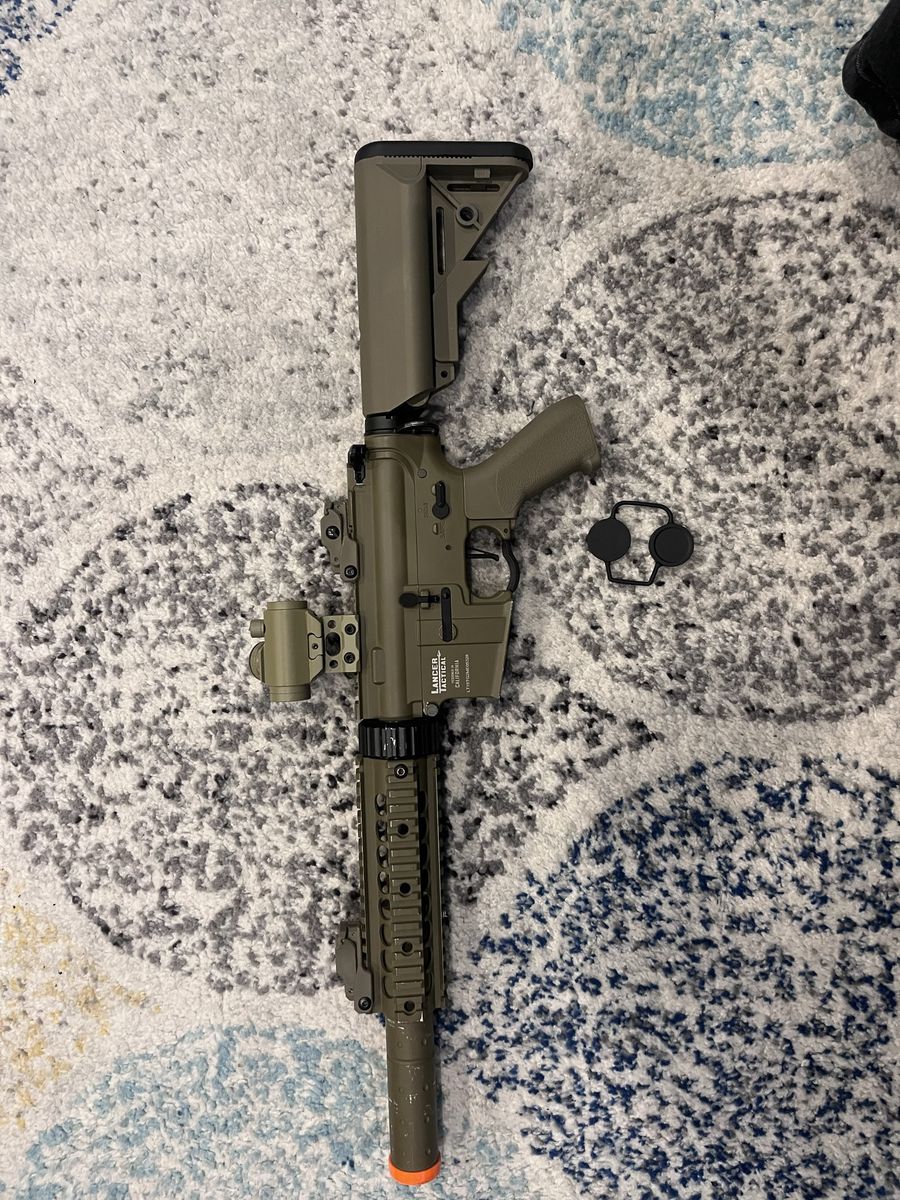 ApplePayElectric airsoft gun about 330-350 fps with .20 gram bbs, has fair wear to it charging handle is broken, warning it breaks easily! I’ve replaced it like 3 times So be gentle with it. I have been maintaining and cleaning it the whole time I’ve had it. Comes with a 9.6V 1600mah nimh battery and comes with a smart charger to not have battery catch fire. Also comes with a sling and a Scope but battery needs to be replaced also comes with a patch.