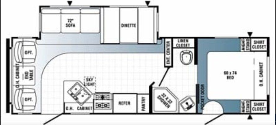 *two entry doors (one into the bedroom and one into the living area) *queen bed with new mattress (2025) *five new tires (2024) *rocking chairs in the rear *pull out couch *full size stand up shower *porcelain toilet *huge slide out (dinette and couch pull out) *new batteries (2025) *new awning (2025) *equalizer hitch included *lots of windows with blinds *good air conditioner