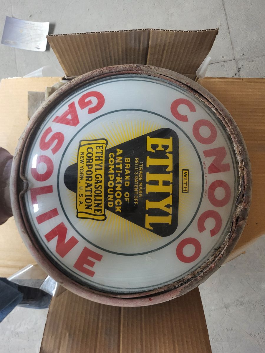 This is a very tall antique gravity feed gas pump in need of restoration. Glass is in good shape but cracked not broken out. Includes an original Conoco GLASS dome, both sides dirty but in great shape. Metal ring for dome will need repair or replacement. We are accepting offers at 801-368-6642 call or text