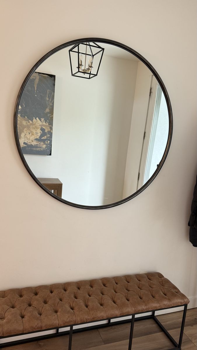Venmo47” Large Round Black Metal Frame Mirror Stunning oversized heavy round mirror with a sleek black metal frame — perfect for entryways, living rooms, or bedrooms. Adds light and visual depth to any space. 47” diameter Black metal frame Great condition — no chips, cracks, or damage Modern/contemporary style Pairs beautifully with a bench or console table Buyer must be able to transport. Local pickup only. Asking $200 OBO