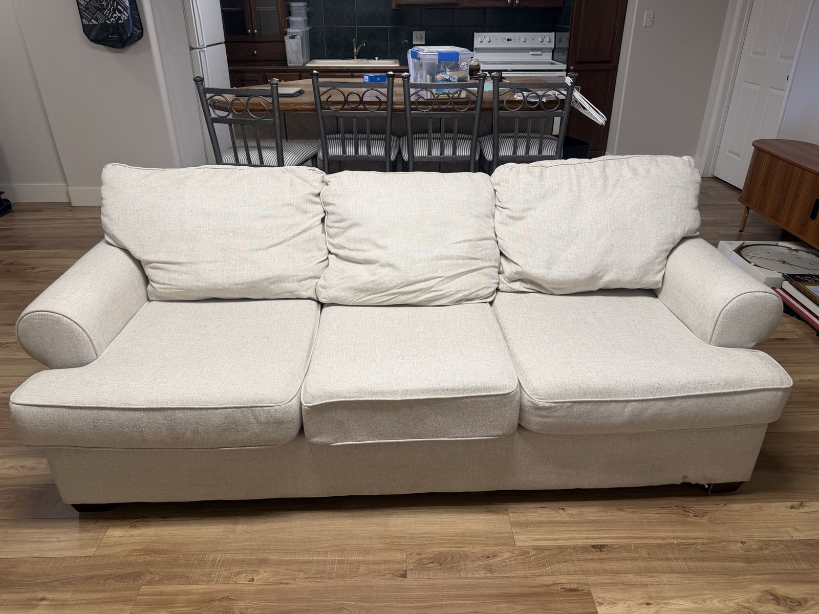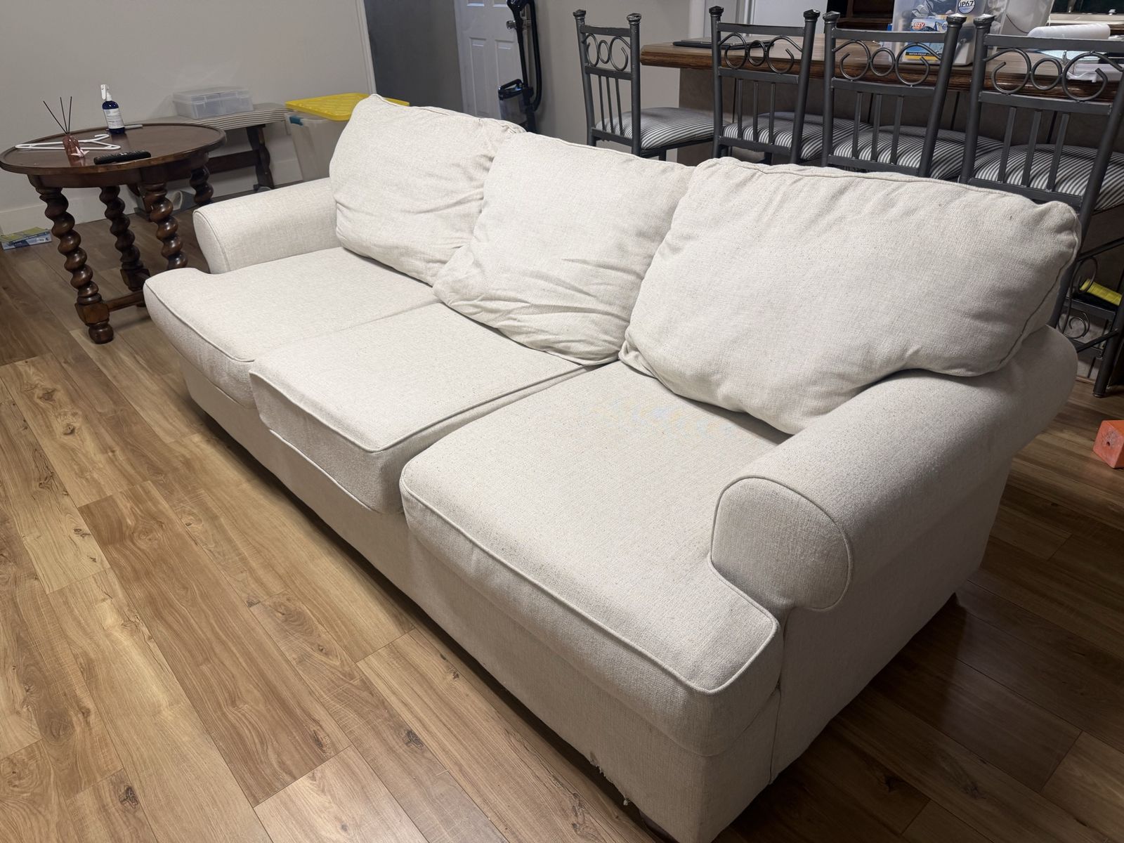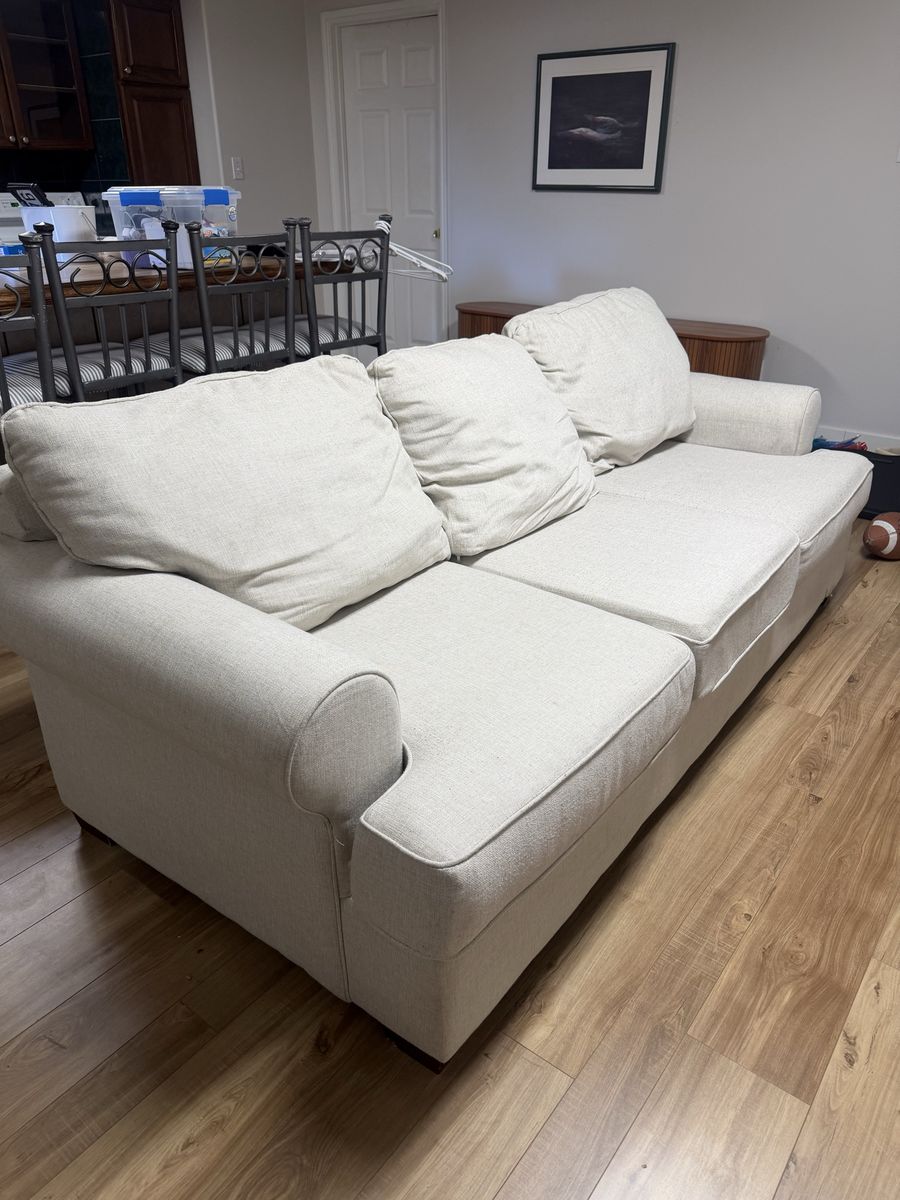 Nice white couch, has been cleaned multiple times and doesn’t have any stains. All the legs are in good condition. Cushions are in good shape. Super comfy text if interested!