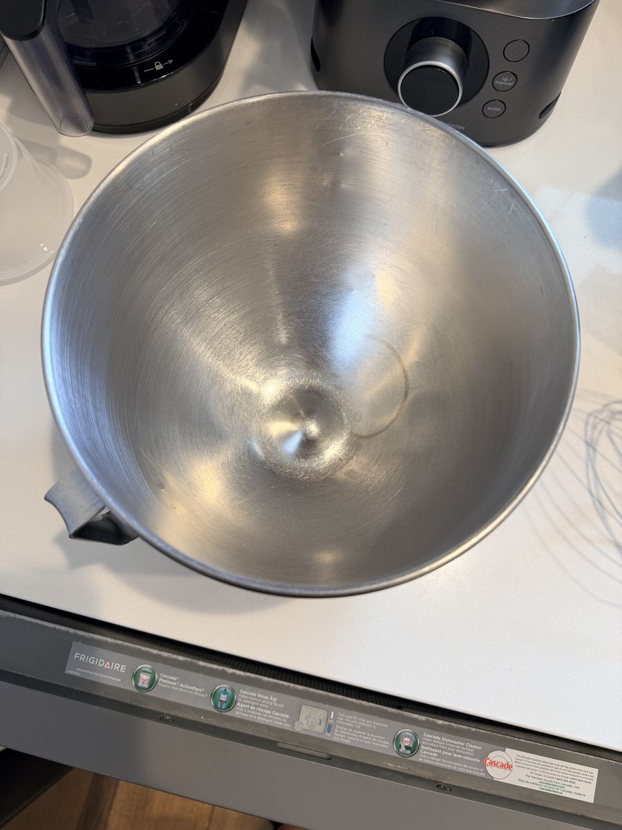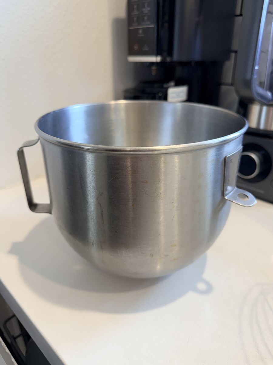 This is one of the heavier-duty models with the bowl-lift design (more stable and powerful than the tilt-head versions). The bowl is 5 quarts, I believe. Includes stainless steel bowl + full attachment set (wire whisk, paddle, and dough hook).