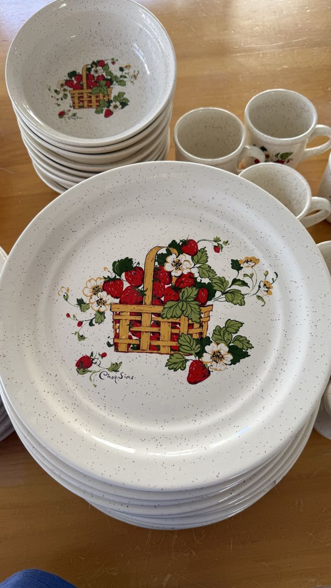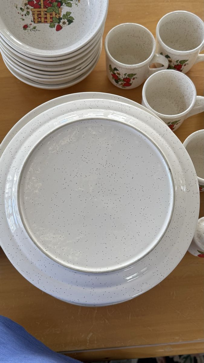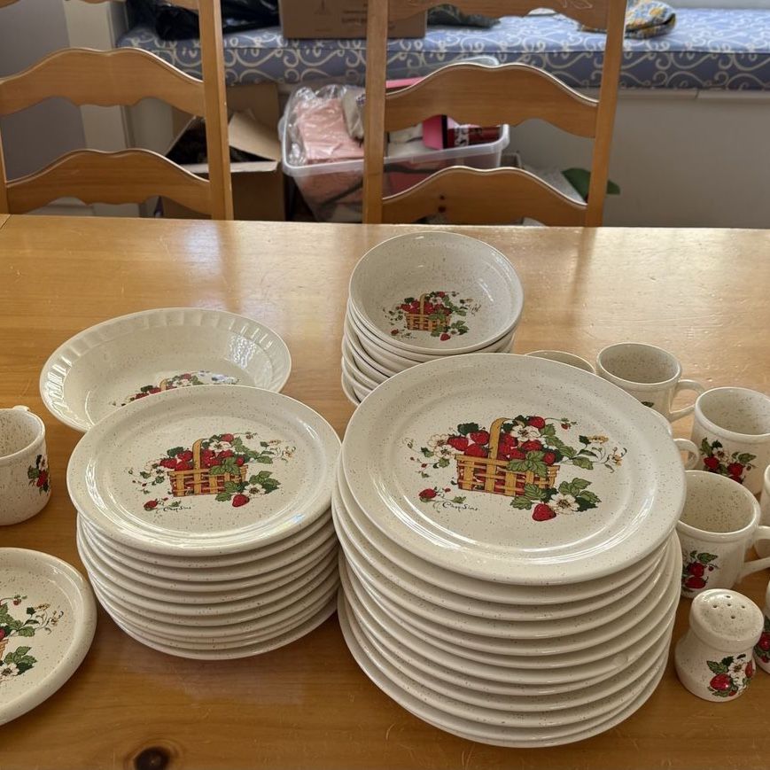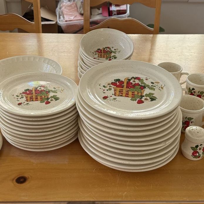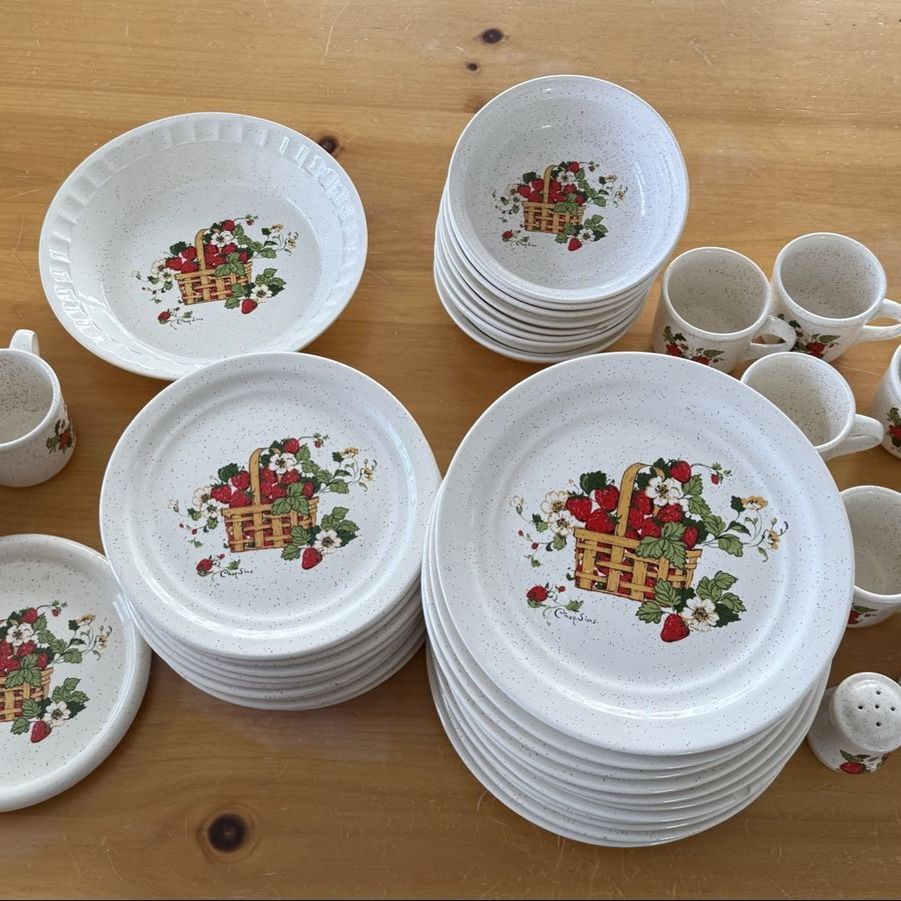 VenmoRare 48 Piece stoneware dinner set that is Treasure Craft’s Basket of Strawberries pattern by artist Cindy Sims. The set includes: 12 dinner plates, 11 salad plates, 8 bowls, 2 sets of salt & pepper shakers, I pie plate, I trivet and 11 mugs. The set is in excellent condition. There are small chips on the edge of a few salad and dinner plate. I have showed it in the photos.
