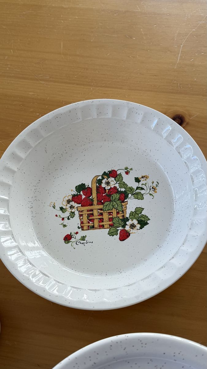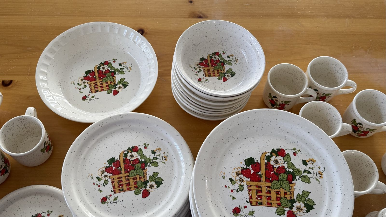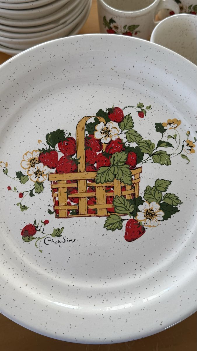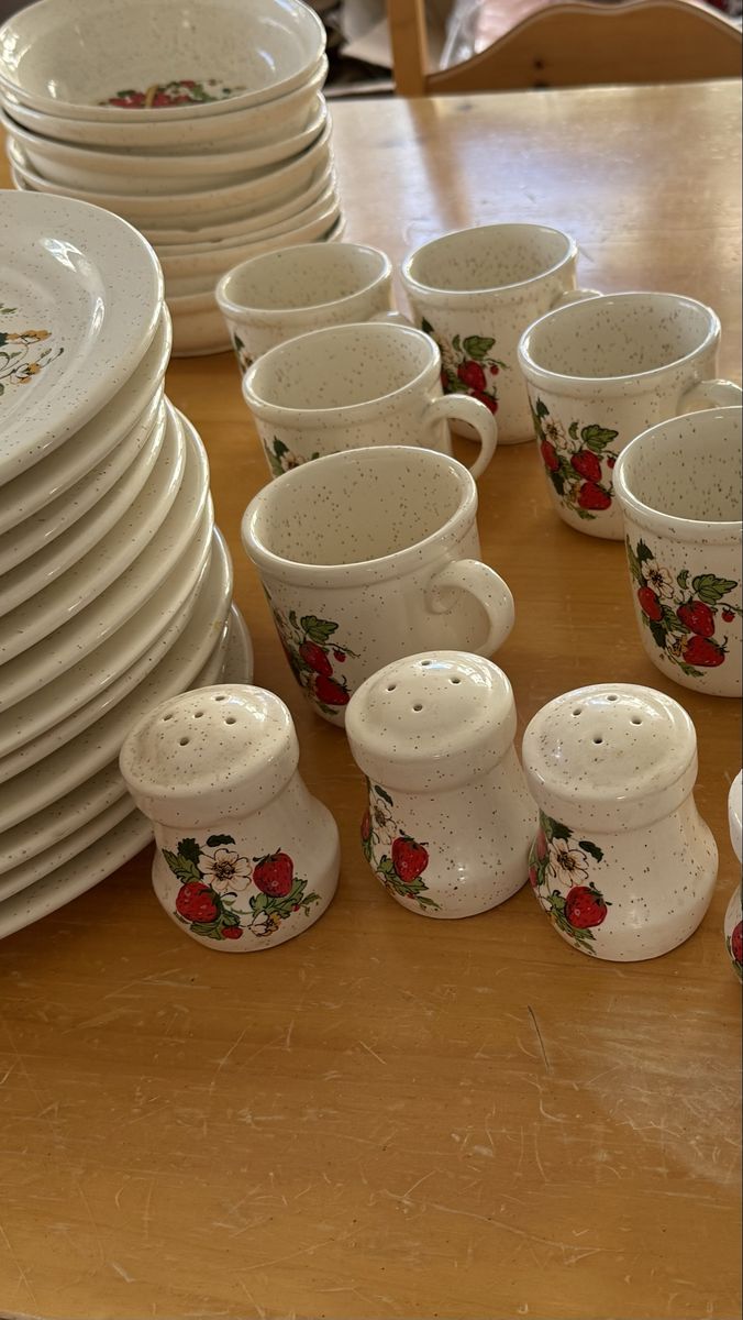 VenmoRare 48 Piece stoneware dinner set that is Treasure Craft’s Basket of Strawberries pattern by artist Cindy Sims. The set includes: 12 dinner plates, 11 salad plates, 8 bowls, 2 sets of salt & pepper shakers, I pie plate, I trivet and 11 mugs. The set is in excellent condition. There are small chips on the edge of a few salad and dinner plate. I have showed it in the photos.