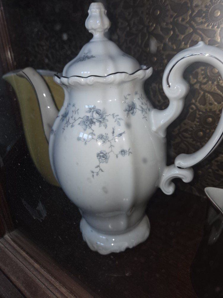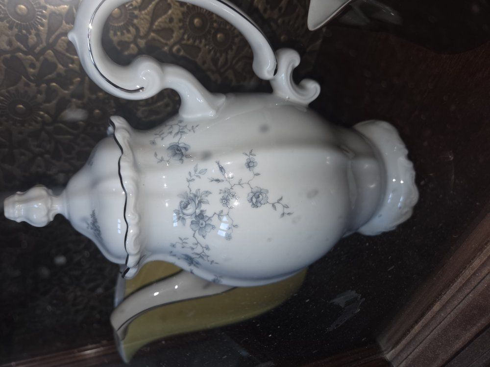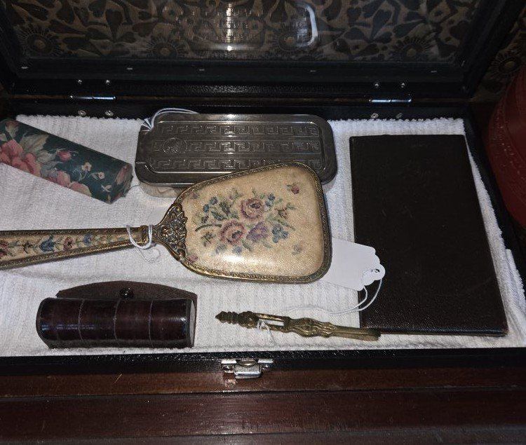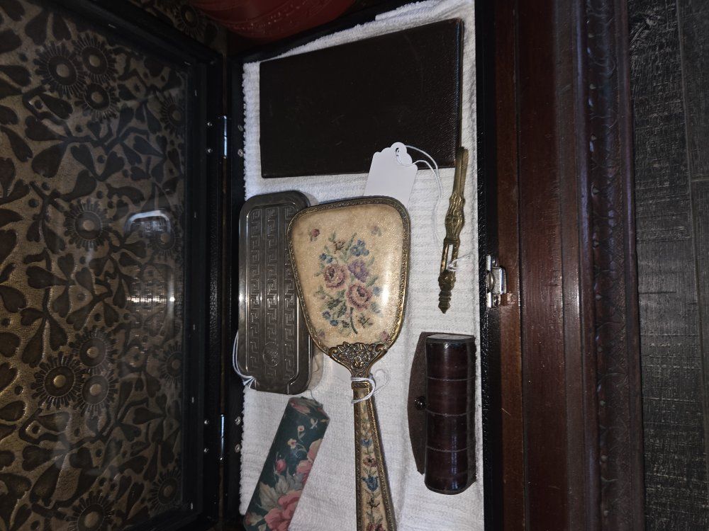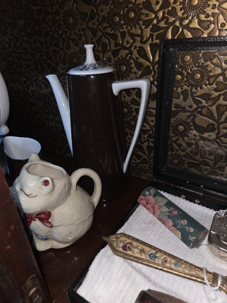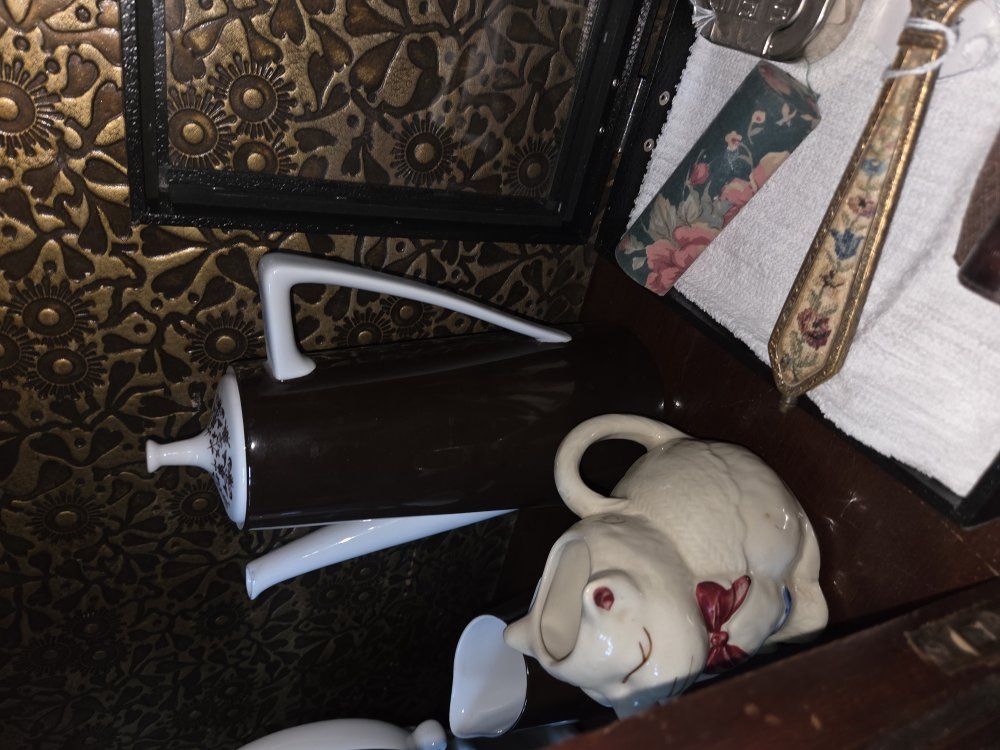 metal decor, books, glassware, china,