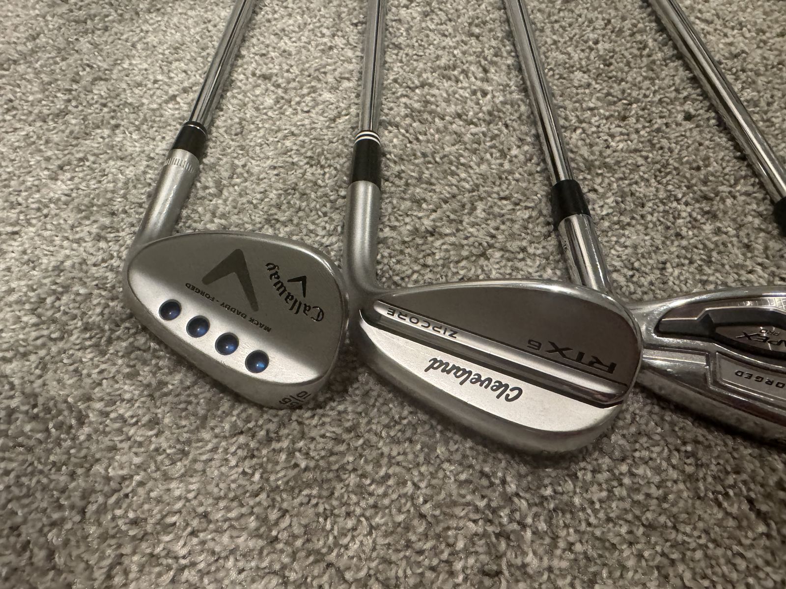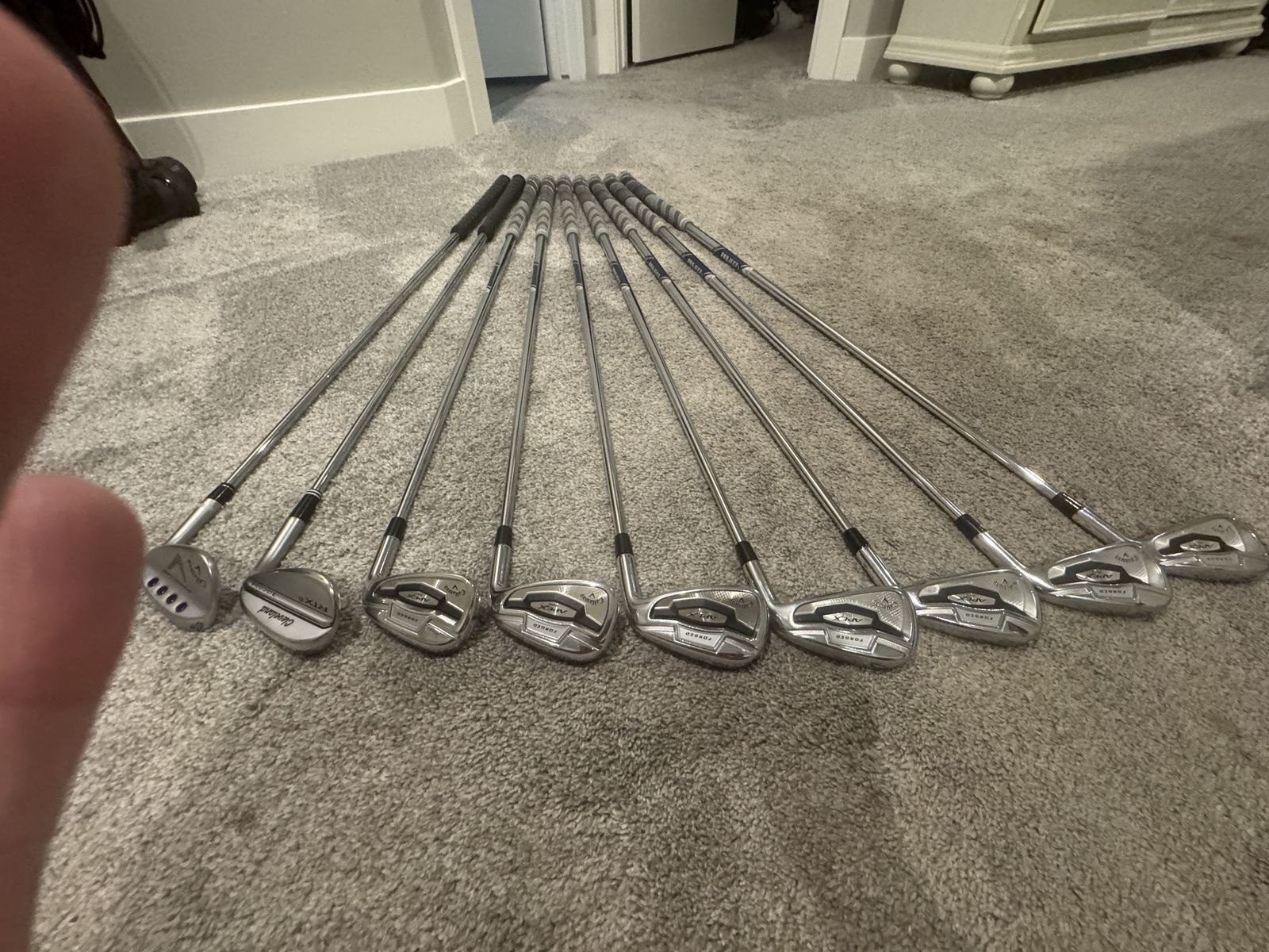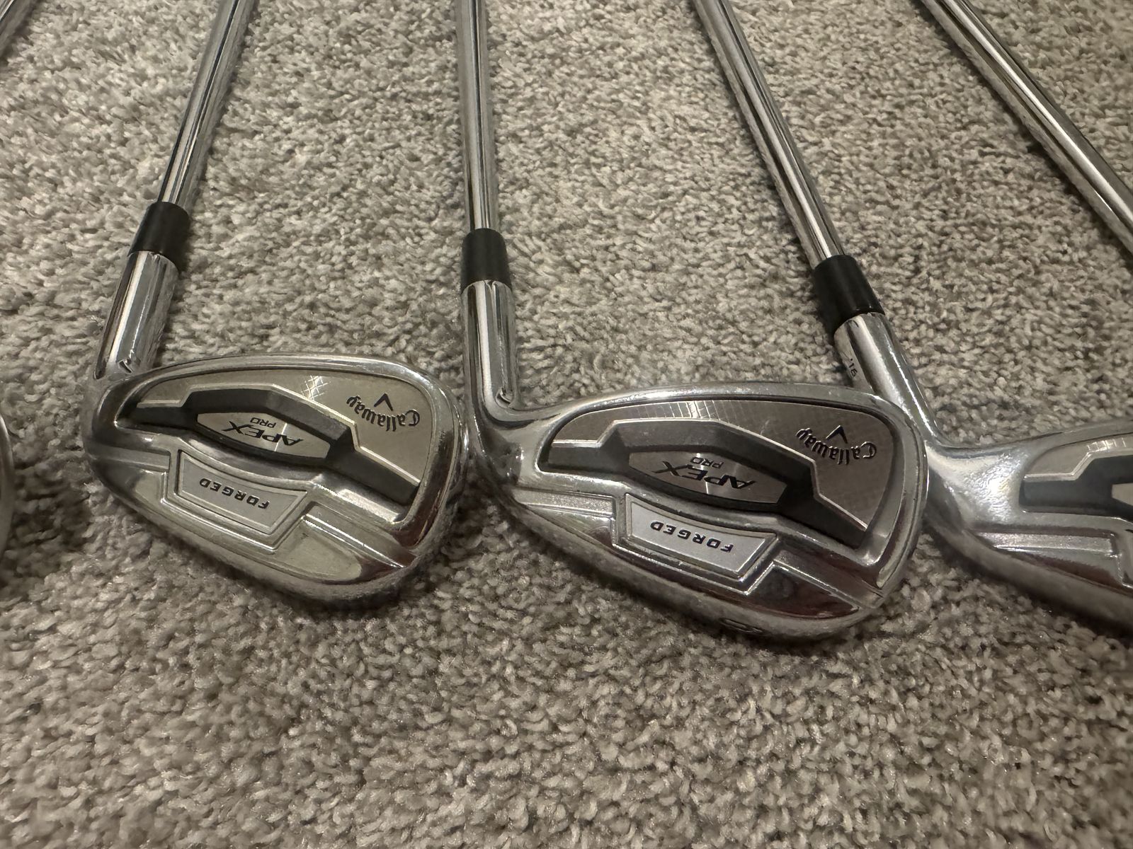 ApplePayCallaway apex pro irons. 4- Pw plus 52 degree 10 bounce Cleveland rtx, and 56 degree 10 bounce mac daddy wedges. New grips on all.