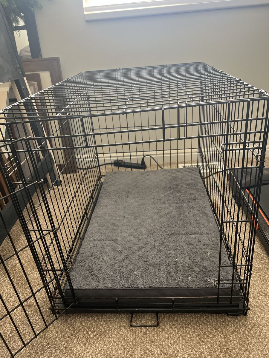 VenmoSturdy wire dog crate with front door, includes a comfortable memory foam crate pad. This is a medium/36-inch crate measuring approximately 36” deep x 24” wide x 28” tall.