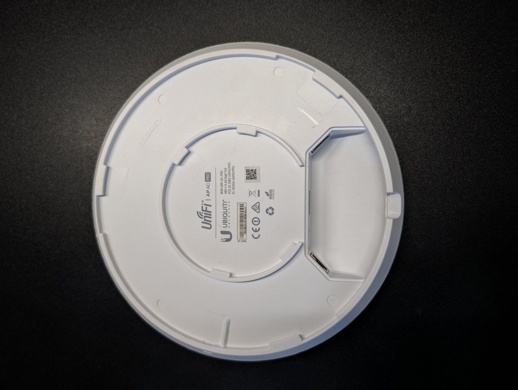 The white plastic housing shows minor surface scuffs and the center Ubiquiti logo shows some fading/wear consistent with previous professional use.