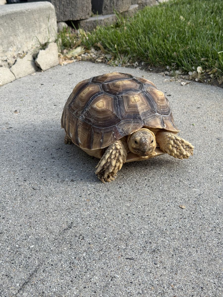 Rehoming my 4-year-old Sulcata tortoise. She is about 10 lbs and roughly 12” long. Very active, alert, and a great eater.