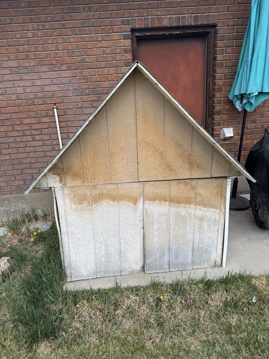 Heated, insulated, and big enough for two large dogs. Outside could be redone. Two pieces, roof and base. Very heavy. Will need two to four people and a truck to move.