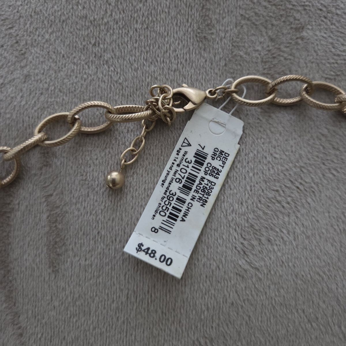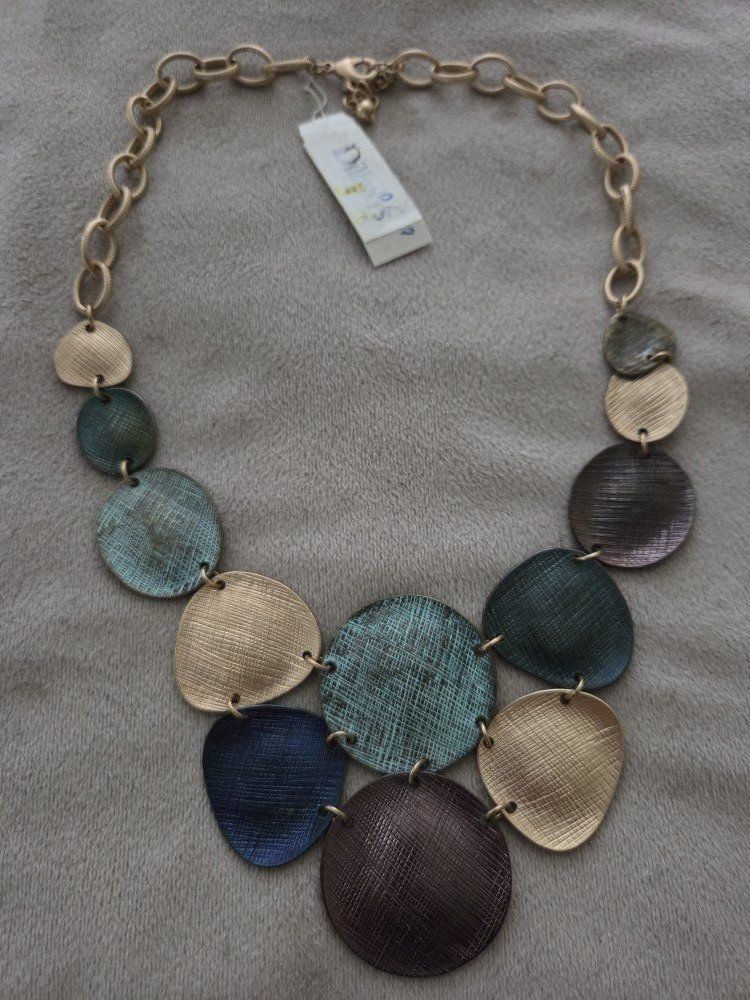 Bought at Dillard's, never wore. Still has tag, retailed $48. Very unique. Pieces are all joined together with metal round links that allows for movement, so a very solid necklace yet not that heavy and lays well.