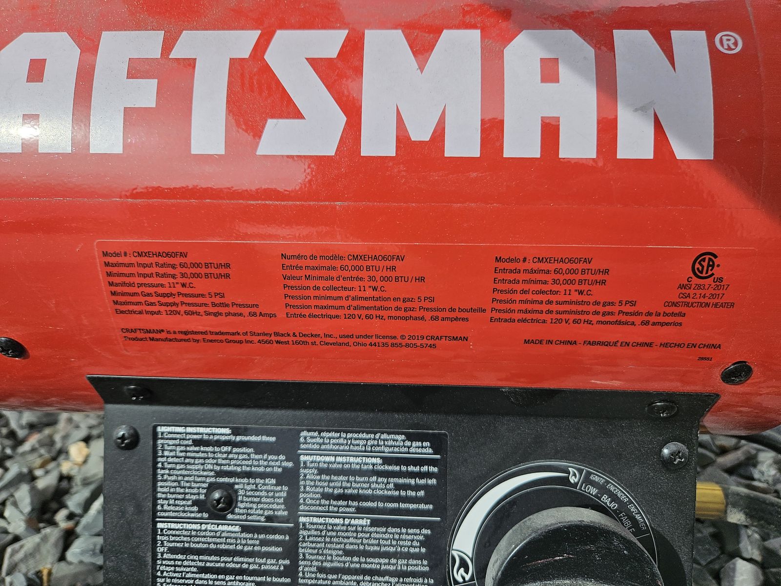 Whether you are using in a garage, workshop, on the job site, or on the farm, the Craftsman 60,000 BTU portable forced air propane heater is the perfect heating solution. Variable heat output from 30,000 to 60,000 BTUs heats up to 1,500 square feet with an adjustable heat angle allowing for greater control. Approximate 14 hour run time on a 20 lb. propane tank, for comfortable warmth day or night. Designed with continuous electronic ignition for quick and reliable starting, and equipped with an overheat detection system and thermo-electric safety valve that shuts off gas flow if the flame goes out, you can focus on the task at hand with no worries.