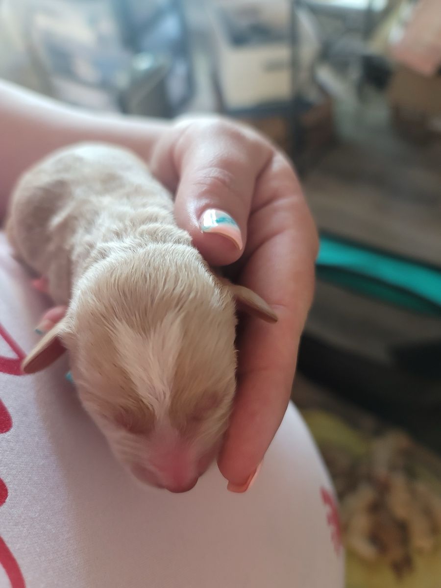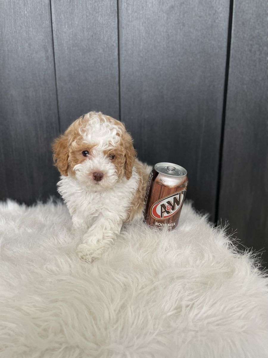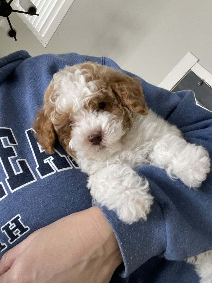 VenmoIntroducing Boomer Baller The CHAMP our AKC Parti toy poodle stud! Weighing in at a whopping 6 lbs Boomer is the Stud of your girl’s dreams! What a sweet little guy!! He is so cuddly, loving and playful. Everyone who meets him falls in love with him! He has the very desirable & gorgeous Parti markings (white, red, & apricot) and a stunning red symmetrical mask with pie bald markings. These are dominant traits which will be passed on to his offspring. Boomer carries two copies of sp/sp genotypes which results in a nearly solid white parti, or piebald coat color. Boomer is a real live teddy bear with a full, fluffy face, short muzzle & soft, full, curly, coat. His furnishings include two copies of Krt71 for a beautiful, fluffy, curly coats with a beautiful beard, mustache & eyebrows RSPO2.