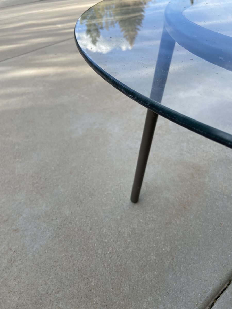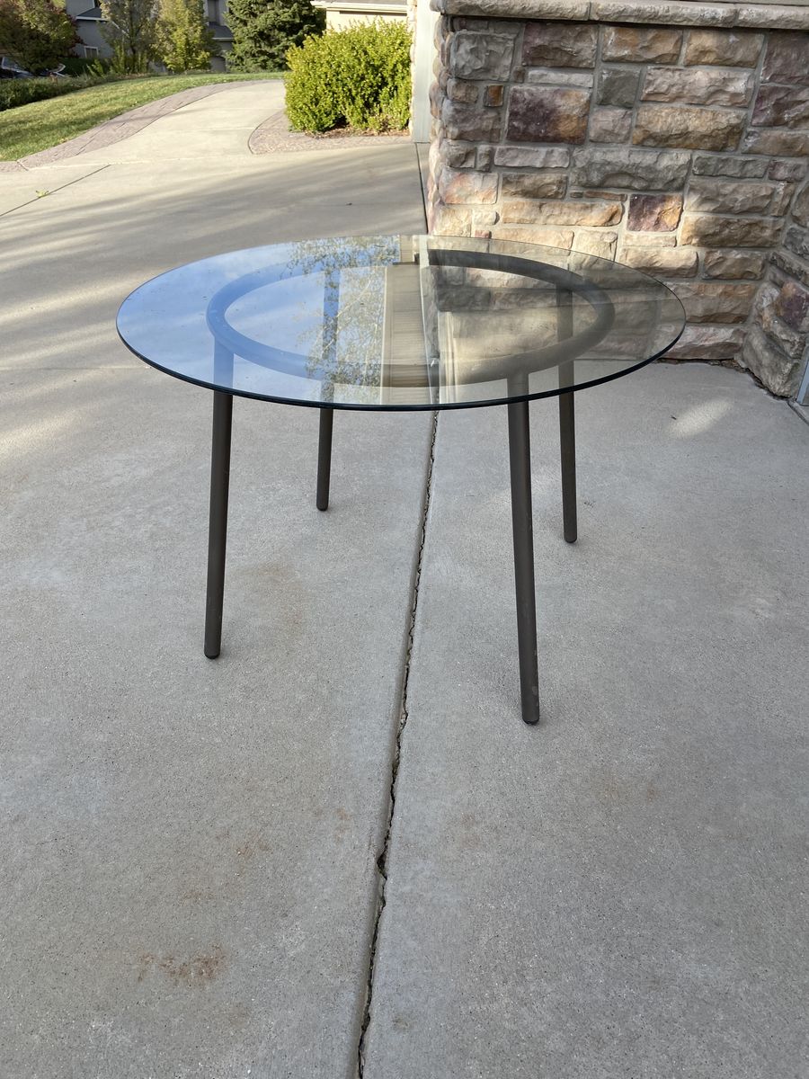Round glass top table with metal legs. The tabletop is 41" wide. The glass top is in good condition, just needs to be cleaned. Cash only. Please text James at 801-707-5616.