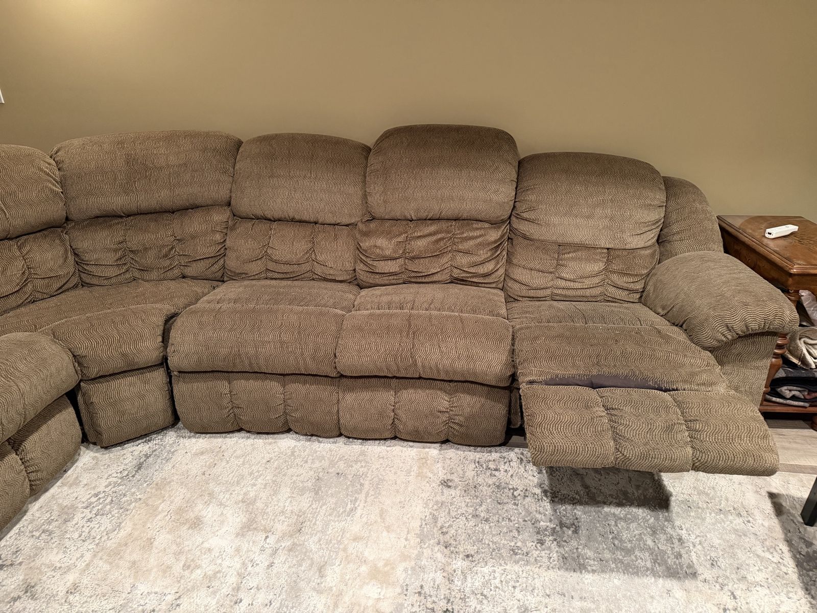 Large lazy boy sectional with recliner and a sofa sleeper. Recliner side is 125 inches. Sofa sleeper side is 117 inches.