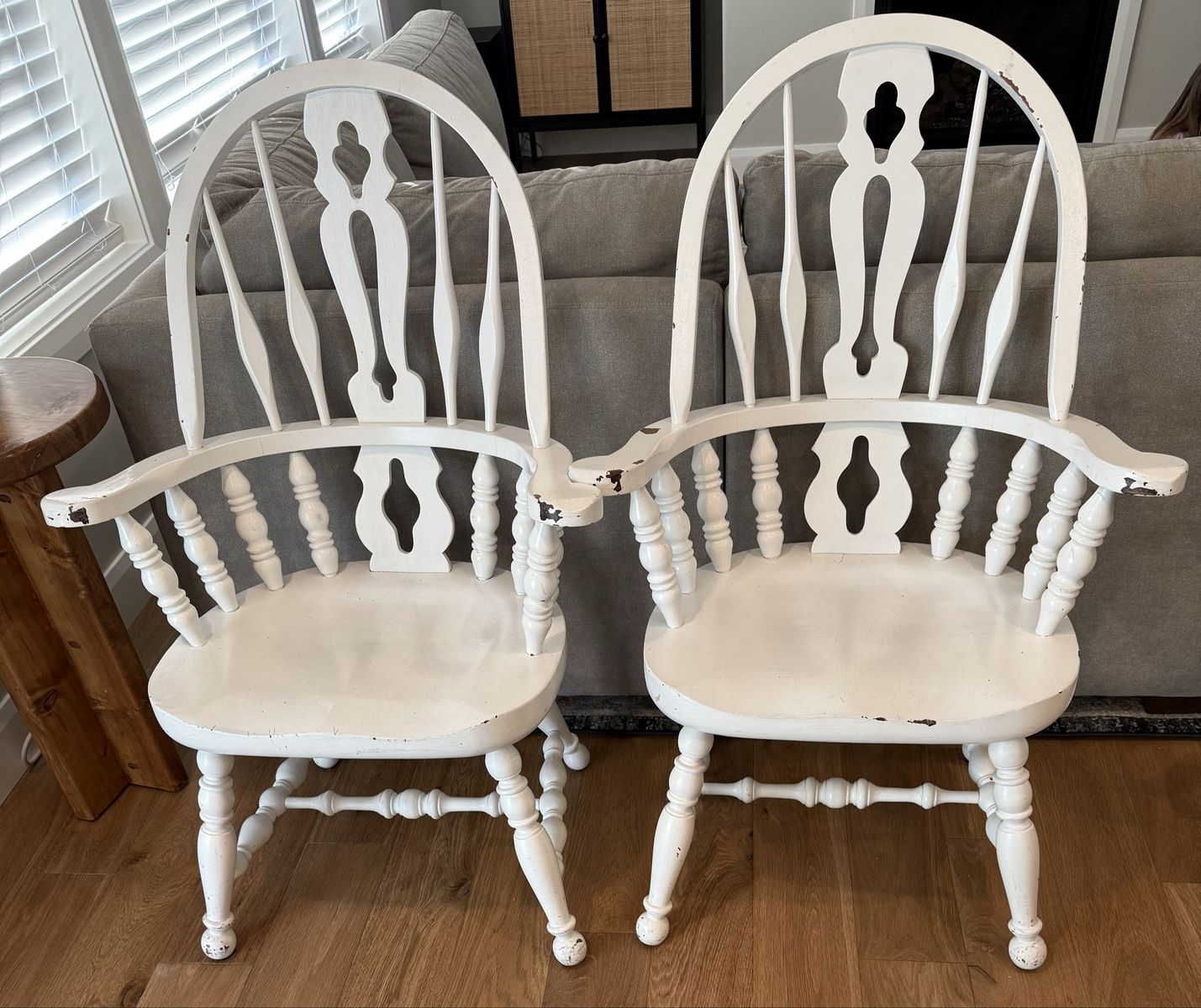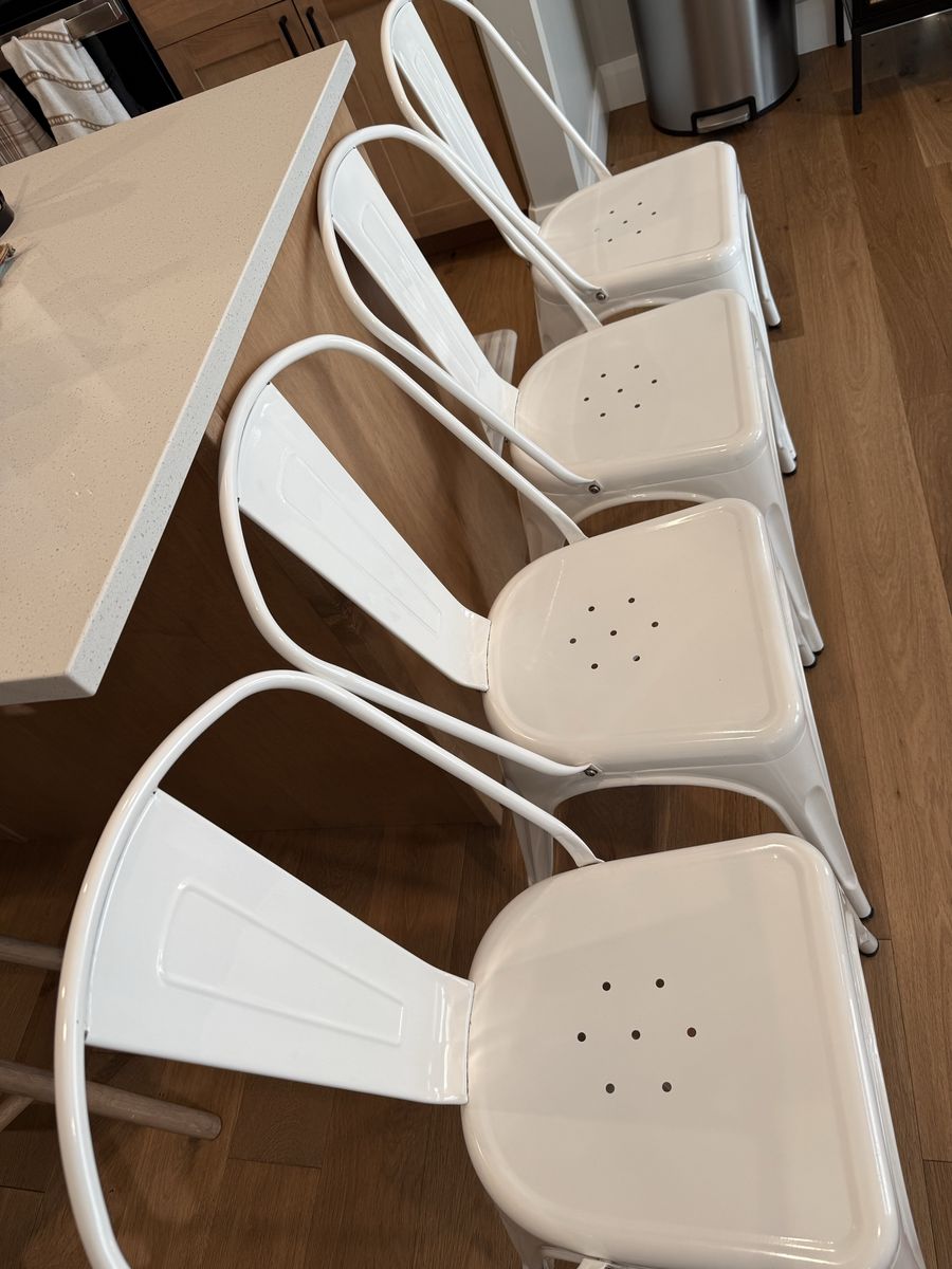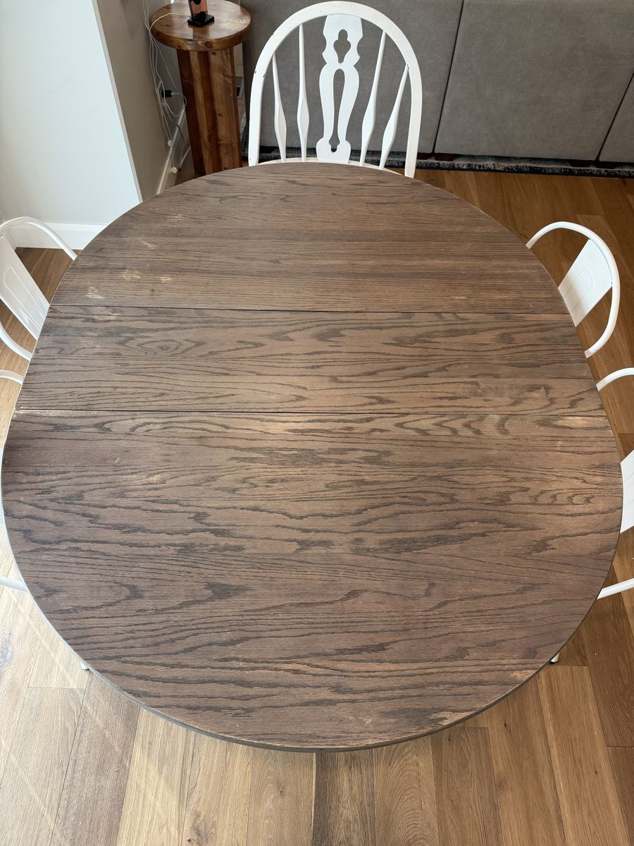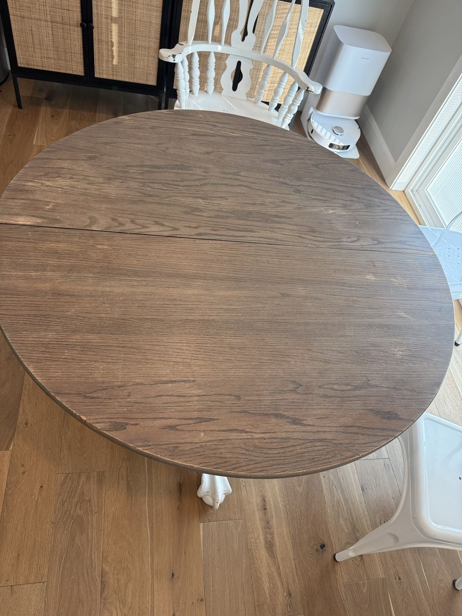ApplePayAntique round table set with six chairs. The table comes with four white metal chairs and two antique wood chairs. The table and chairs were purchased refurbished and still look great. The set could use some touch ups on paint and stain, but there are no harsh gouges in the wood. Only light scratches that removed some stain or paint.