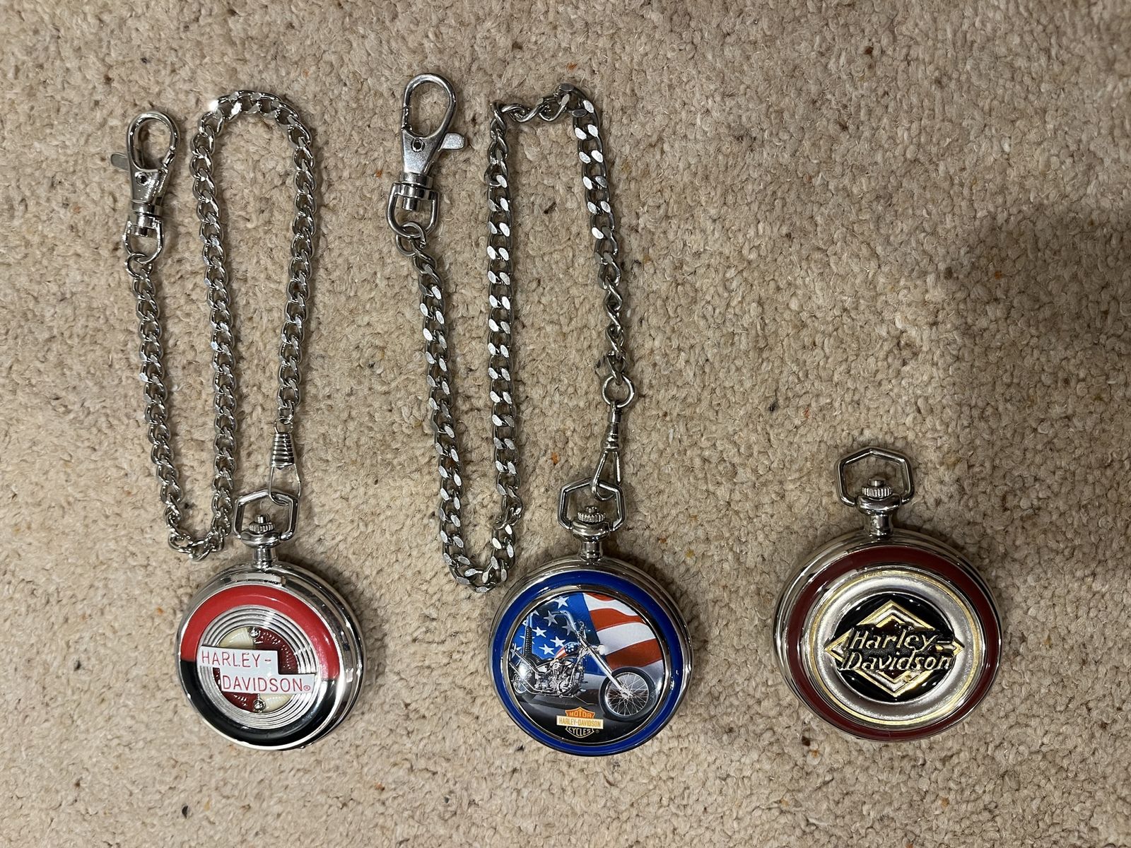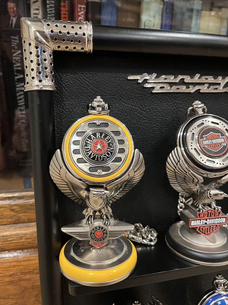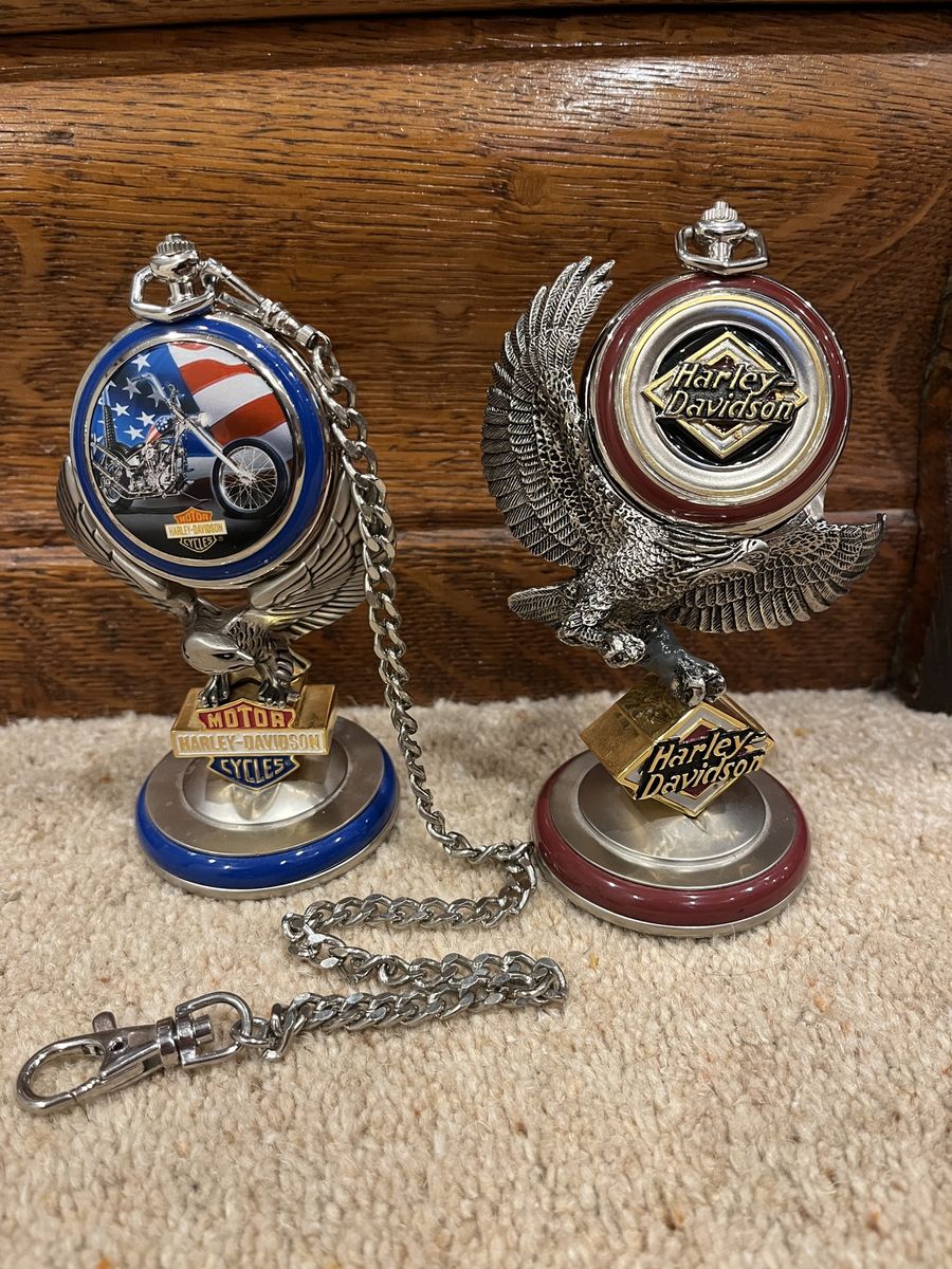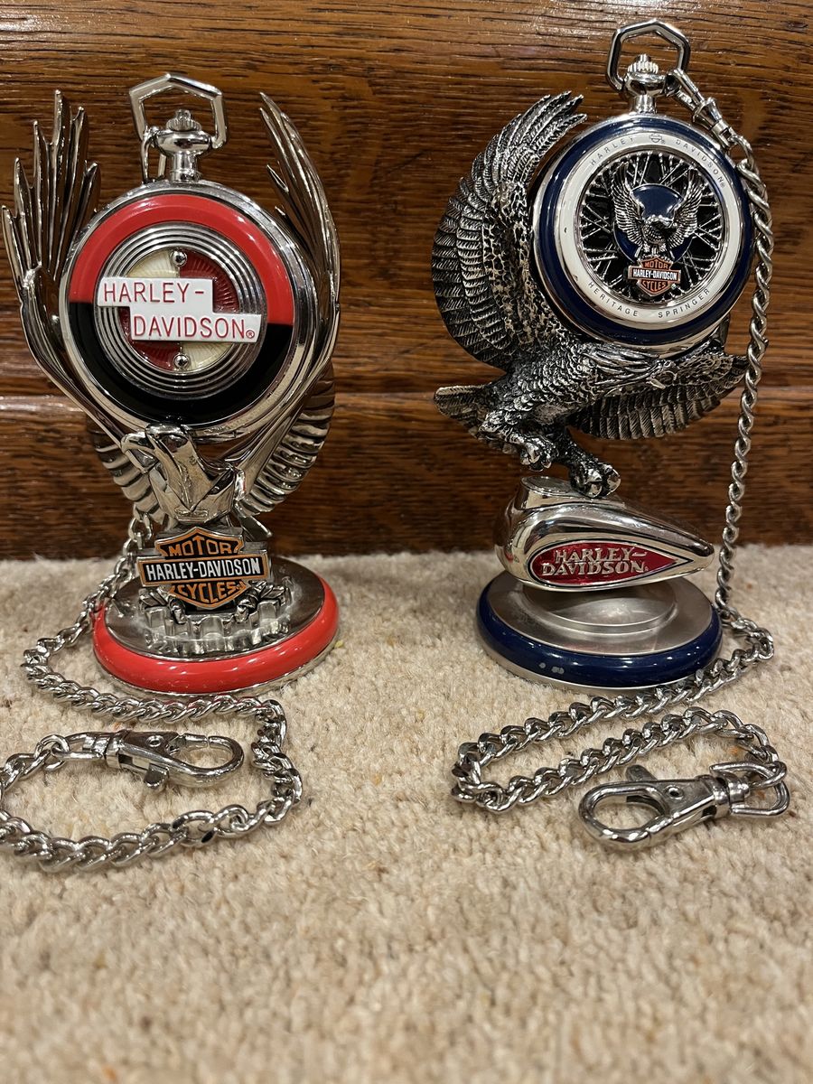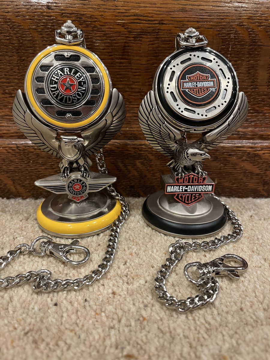 VenmoThis set comes with six pocket watches, six holders for the pocket watches, two belt holders, And the display case that hangs on your wall. The case shows them off nicely. The case is 12 wide by 15 tall. I have shown a corner picture of the holder also, so you can see the detail. The yellow one is the Fat Boy, the rust color is the Electra Glide, Blue is the Chopper, Dark Blue is the Springer, Red & Black is the Sportster, Black is the Softtail. When you open them up they have a picture of the bike and a unique face on each watch. Each watch is different, for a different bike. I have replaced the batteries in 2 of them, and they work perfect. They come with 5 chains that hook onto the holder that goes on your belt. Chains are 13 inches long. I have two holders that go with this set. One is a matte finish and one has a gloss look to it. One stand has been repaired otherwise they are in excellent condition. No trades. Sold as a set only. Pefect gift or great addition to a Harley Davidsons enthusiast's collection. Thanks for looking. Must see! Price is firm.
