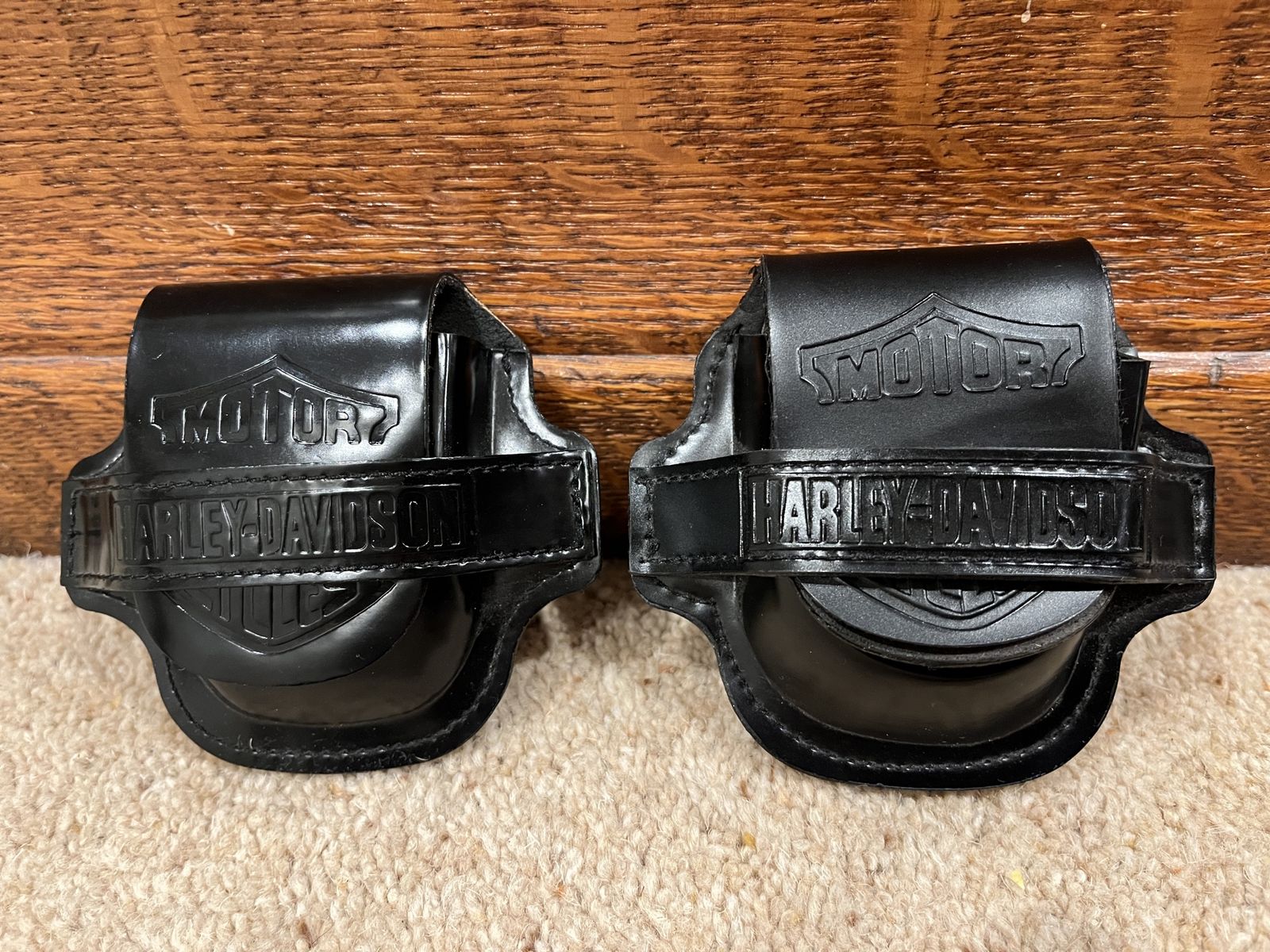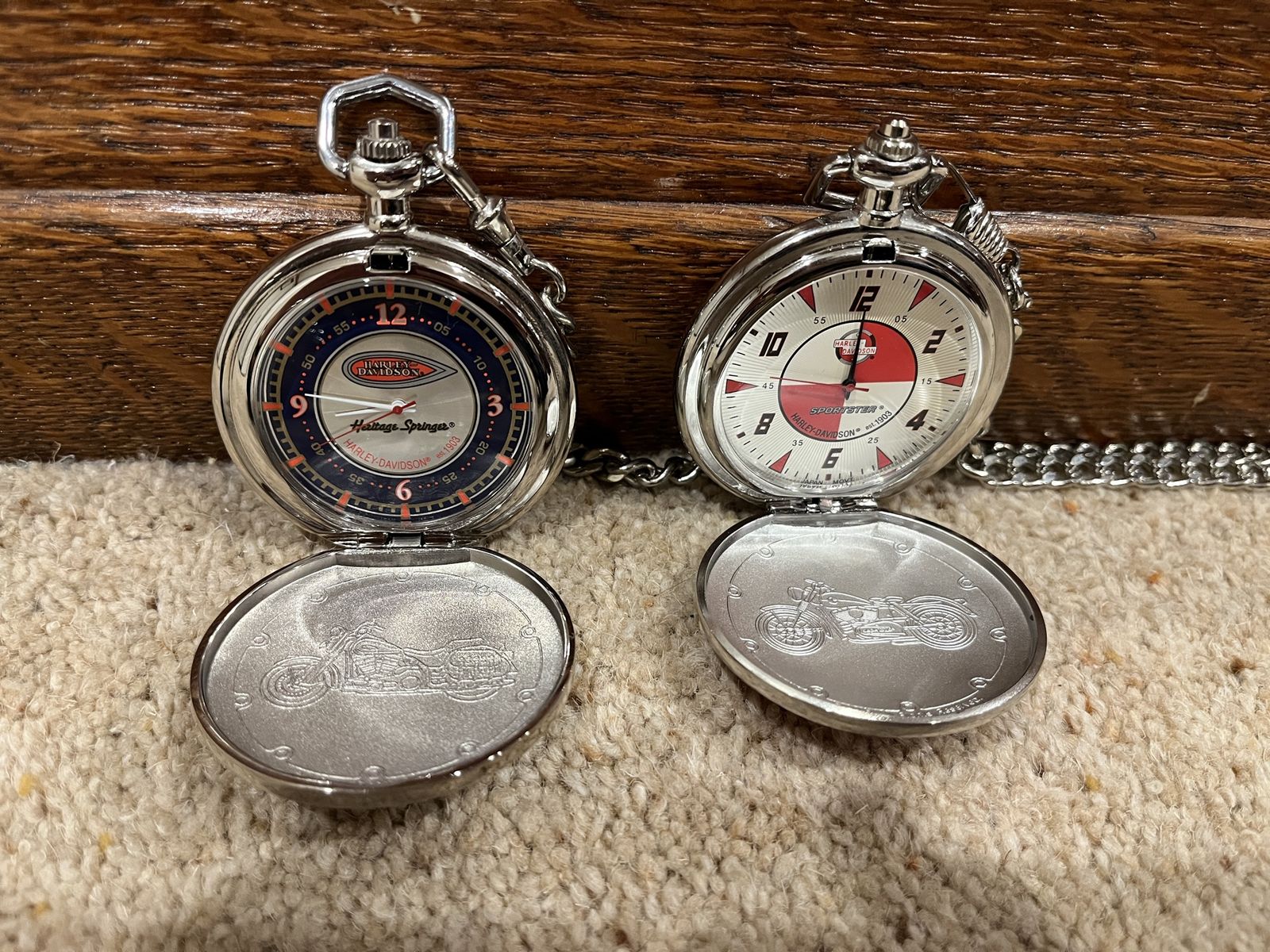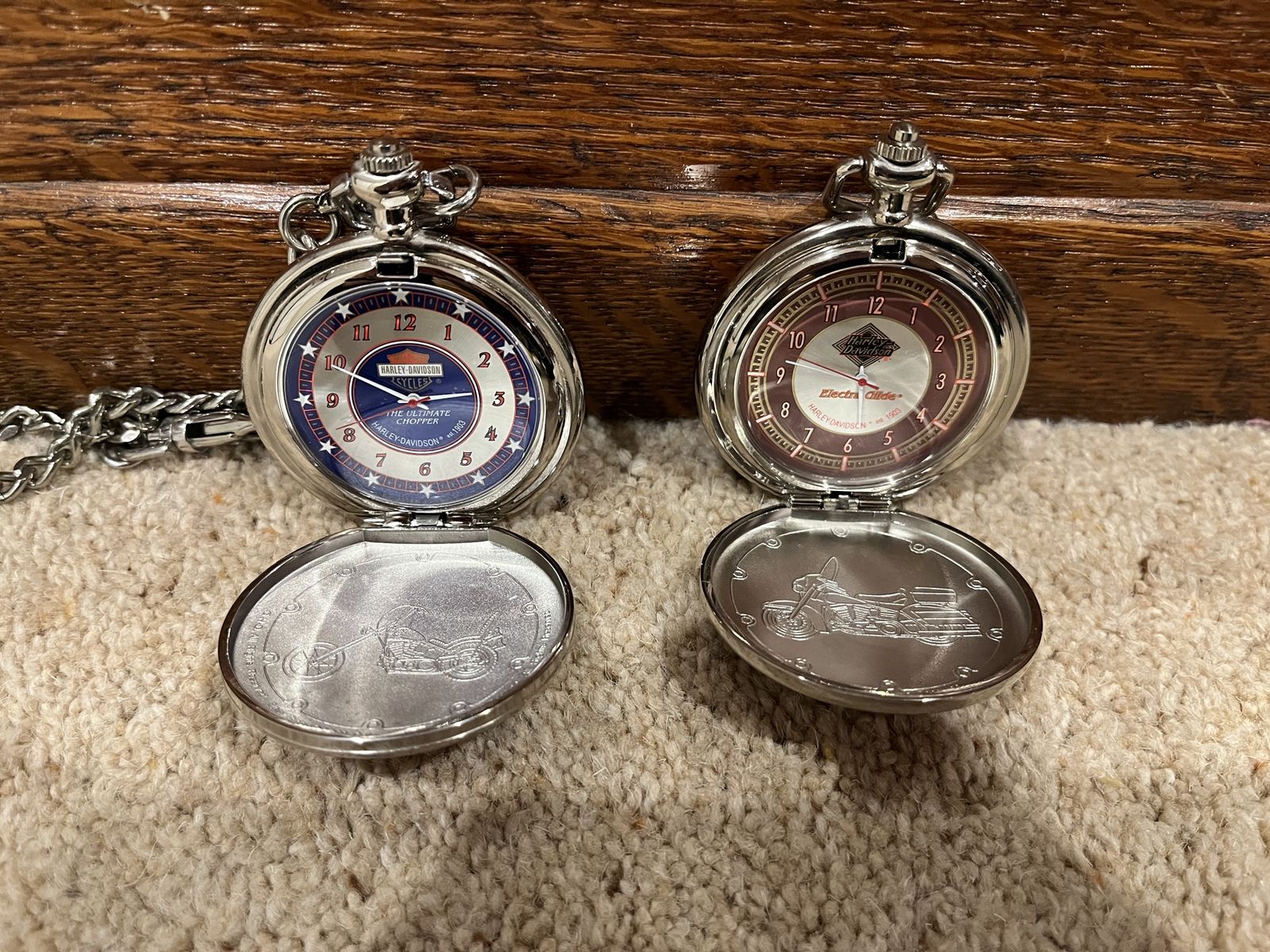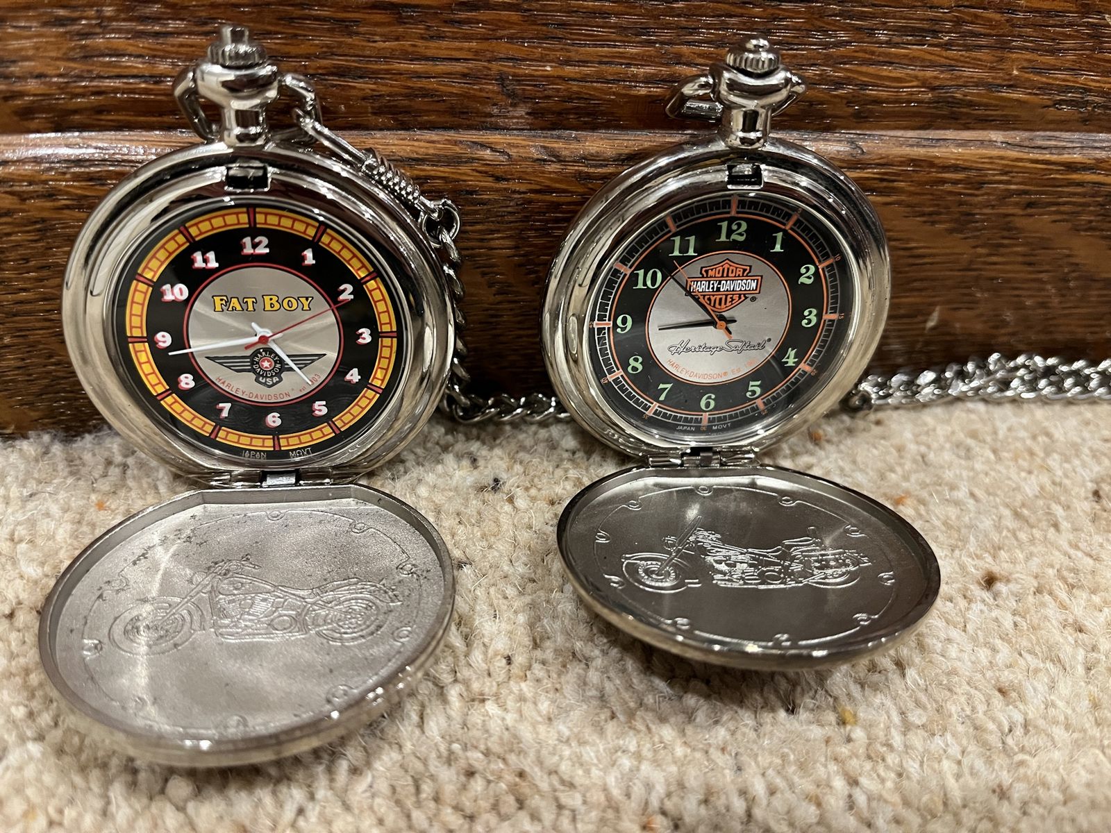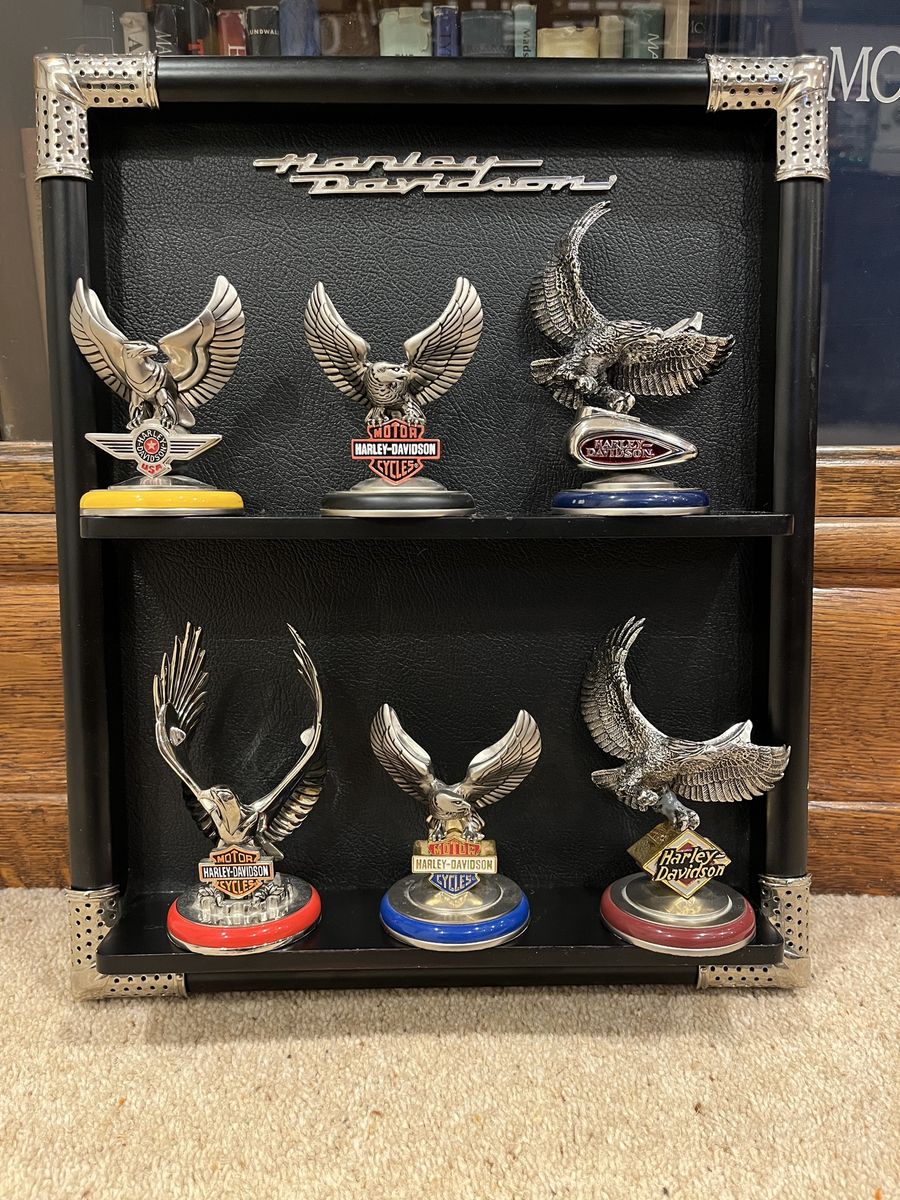 VenmoThis set comes with six pocket watches, six holders for the pocket watches, two belt holders, And the display case that hangs on your wall. The case shows them off nicely. The case is 12 wide by 15 tall. I have shown a corner picture of the holder also, so you can see the detail. The yellow one is the Fat Boy, the rust color is the Electra Glide, Blue is the Chopper, Dark Blue is the Springer, Red & Black is the Sportster, Black is the Softtail. When you open them up they have a picture of the bike and a unique face on each watch. Each watch is different, for a different bike. I have replaced the batteries in 2 of them, and they work perfect. They come with 5 chains that hook onto the holder that goes on your belt. Chains are 13 inches long. I have two holders that go with this set. One is a matte finish and one has a gloss look to it. One stand has been repaired otherwise they are in excellent condition. No trades. Sold as a set only. Pefect gift or great addition to a Harley Davidsons enthusiast's collection. Thanks for looking. Must see! Price is firm.