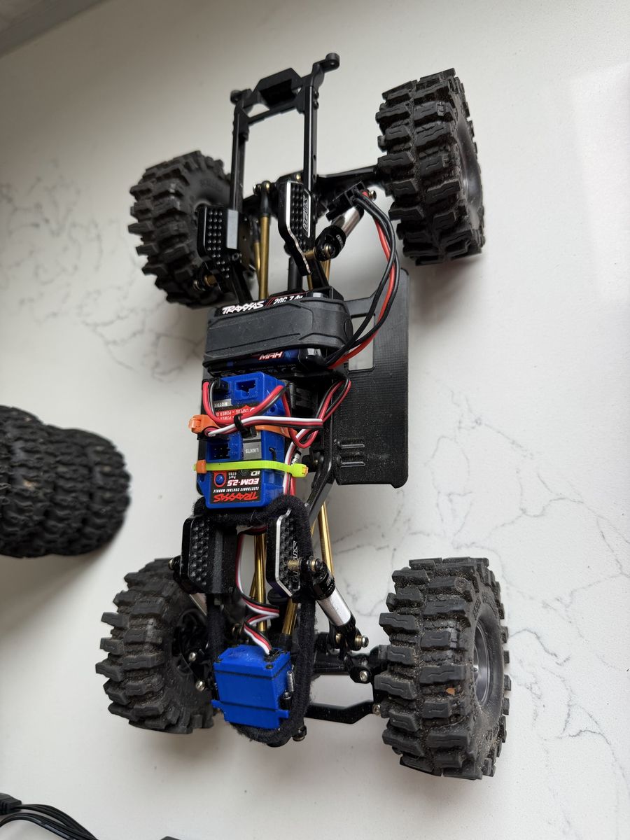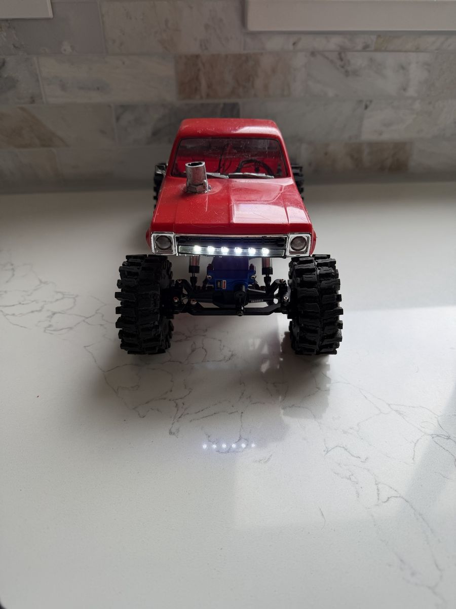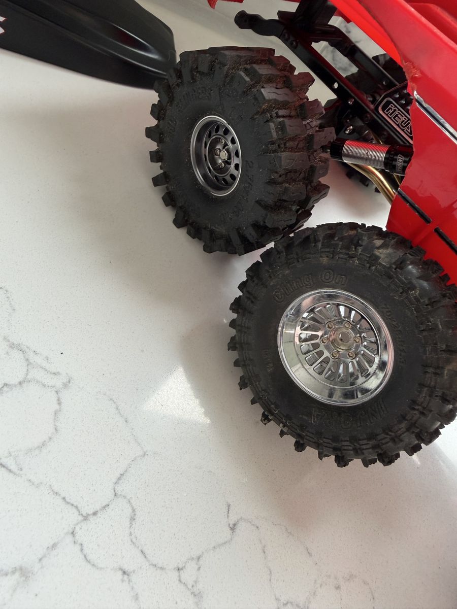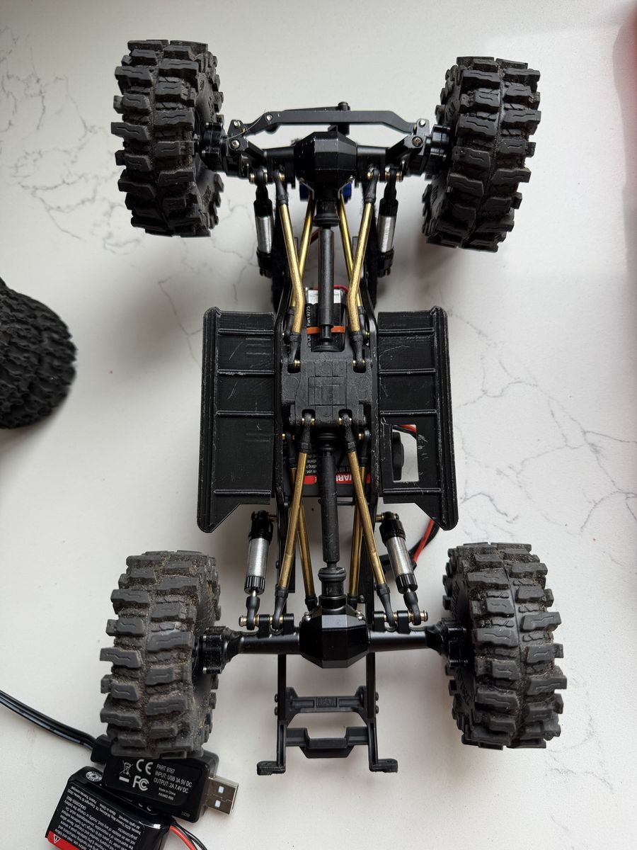 Has injora axles, shocks, links, wheels, and meus chassis. Comes with two batteries, charger, and an extra set of wheels/ tires.