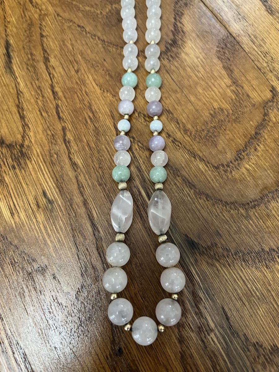 VenmoThis is a very pretty necklace with gold beads in between each quarts bead. The clasp is detailed and holds well. This was made between the 1960's to the 1970's. The stones are real and are cold to the touch. There are several colors of quarts pinks, purples, white, and even green. It is 23 inches long. Must see!