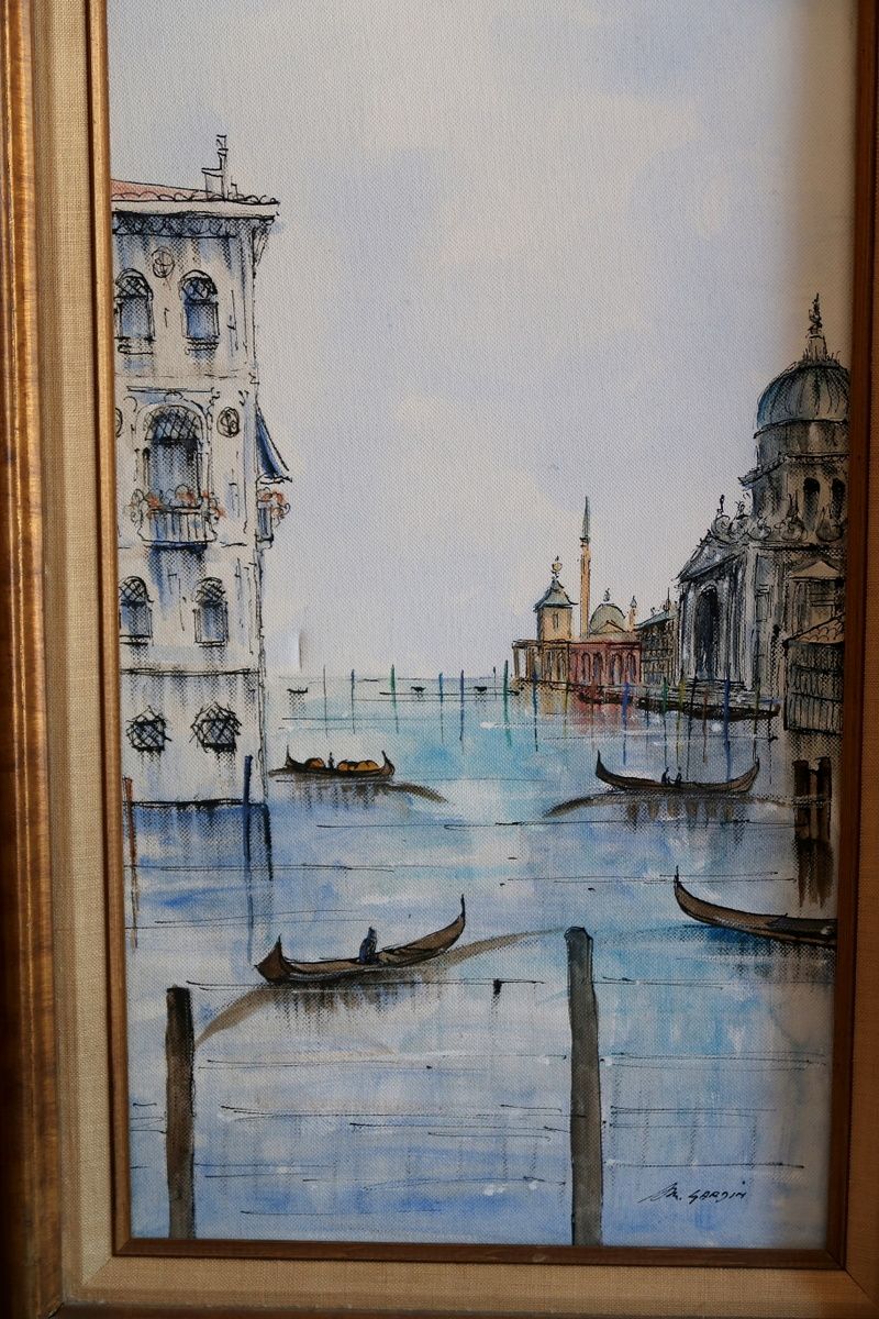 PayPalThis artwork is a painting depicting a scenic moment in Venice, Italy, specifically showcasing a view of the Grand Canal. The painting features iconic Venetian architecture, including historic buildings and a distant dome, possibly of the Santa Maria della Salute. Several gondolas are depicted floating on the calm water, capturing the quintessential atmosphere of the city. Such paintings reflect the city's unique architectural and aquatic environment.