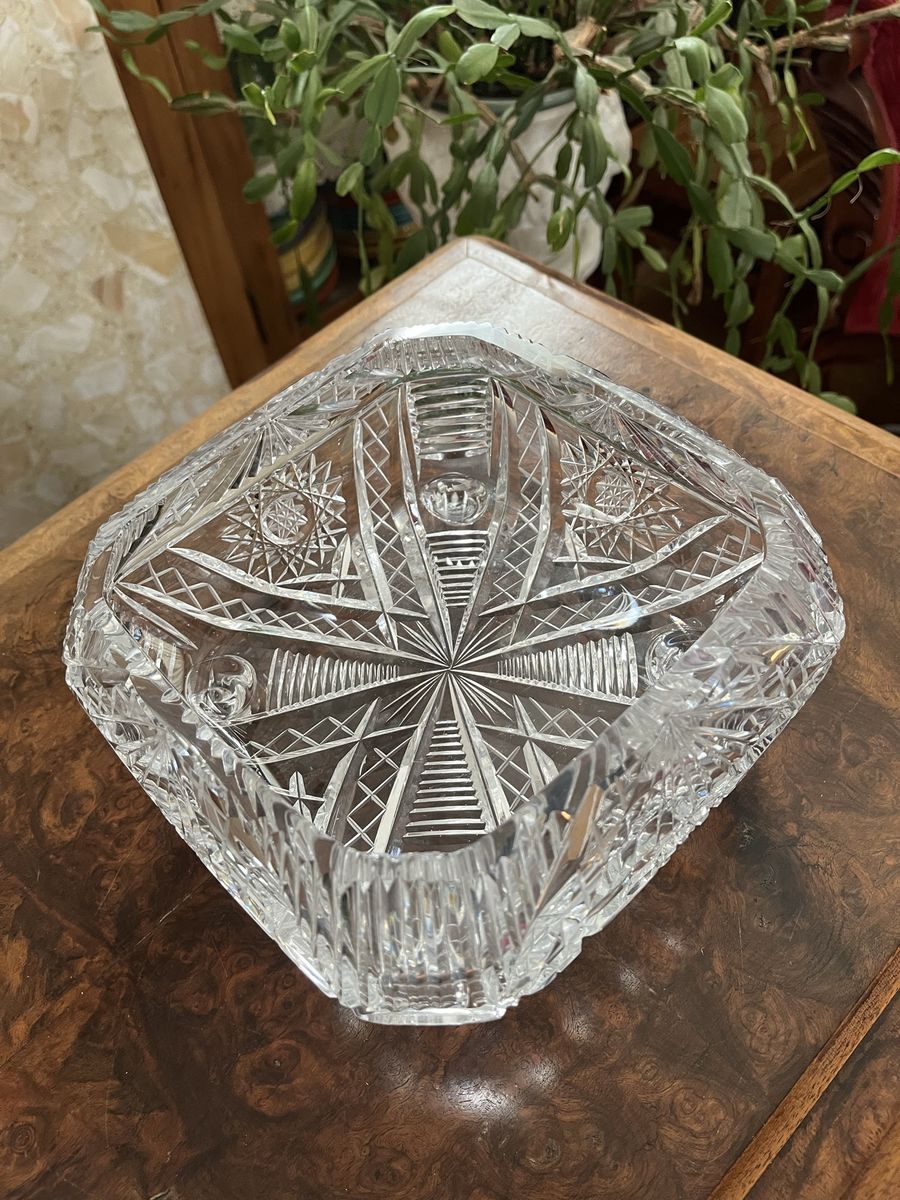 VenmoThis is one gorgeous and stunning piece of crystal. If you love quality, this is for you. Way to pretty to put in a china cabinet. It needs to be displayed. It is a heavy quality piece of crystal. It has a star and diamond pattern to it. Simular to the American Brilliant pattern. The top goes in slightly, for added detail. It measures 7 1/2 inches across x 4 inches tall. It sits on four curved and curled feet. I'm cleaning out some of my mom's treasures.This lovely piece she hand carried home from Ireland, along, long, time ago. Come and see this. You will love it! Price is firm.