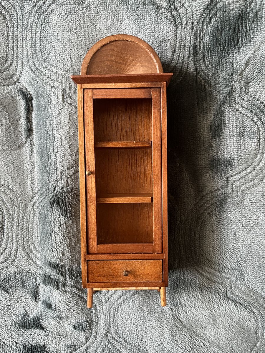 VenmoThis is a vintage piece that is made of cherrywood. It is in excellent condition. It comes in the original box. The door and drawer open and close. It is 6 tall x 2 wide x 1 deep. It has three shelves to display pretty items, plus a bottom drawer. There is no glass on the door. A very lovely display piece. Must see. Price is firm.
