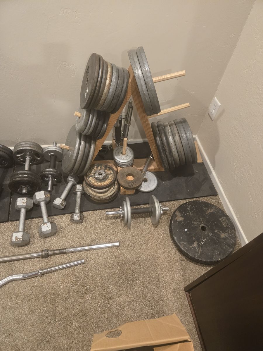 For the 1-in adjustable dumbbells, I have 11 handles, 13 2.5lb plates, 17 5lb plates, 17 10lb plates, 12 25lb plates, and 2 50lb plates. There are two 2-in dumbbells with 2 35lb plates, 2 25lb plates, multiple 10 lb and 5 lb plates adding up for about 240 lb total. Then there is the straight bar and the curved bar / cheater bar for the 1 in, and a set of fixed 5 lb, 10 lb, and 20 lb dumbbells. It totals about $1,100. Asking $500