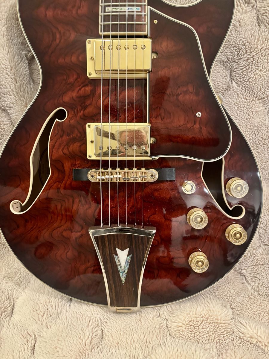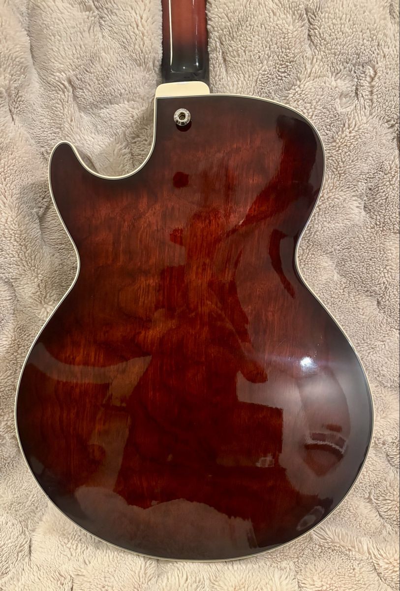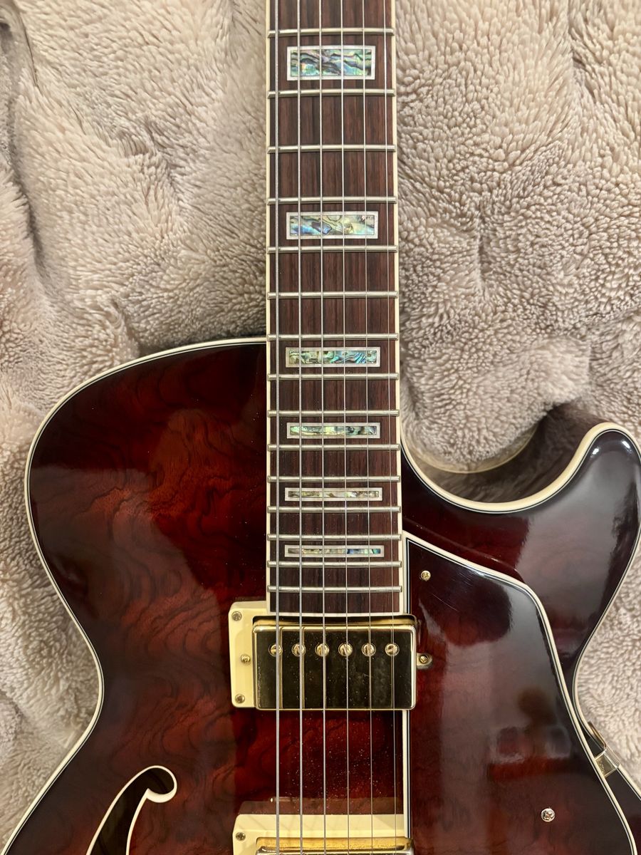 Body: Double-bound hollow body with gorgeous figured Bubinga top, back and sides in dark brown sunburst finish. Gold trapeze tailpiece with rosewood centerpiece and pearloid/abalone inlay, speed control knobs, dual “F” holes and a bound Bubinga pickguard.
