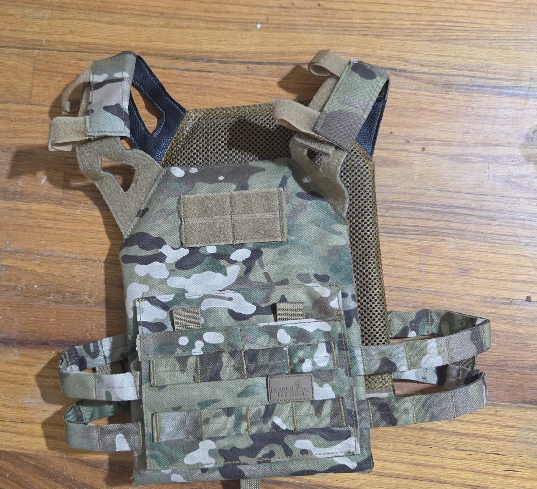 A young medium multicam, lancer tactical airsoft vest, hasn't been used to much, I think I used it i 2-3 matches, until I grew out of it. I think it's a great size to get if you have kids, or know someone who wants to give airsoft a shot. It has taken very little wear and tear. While putting it away something keeping it strapped to the back came off, so I used an elastic rope to tie them together.