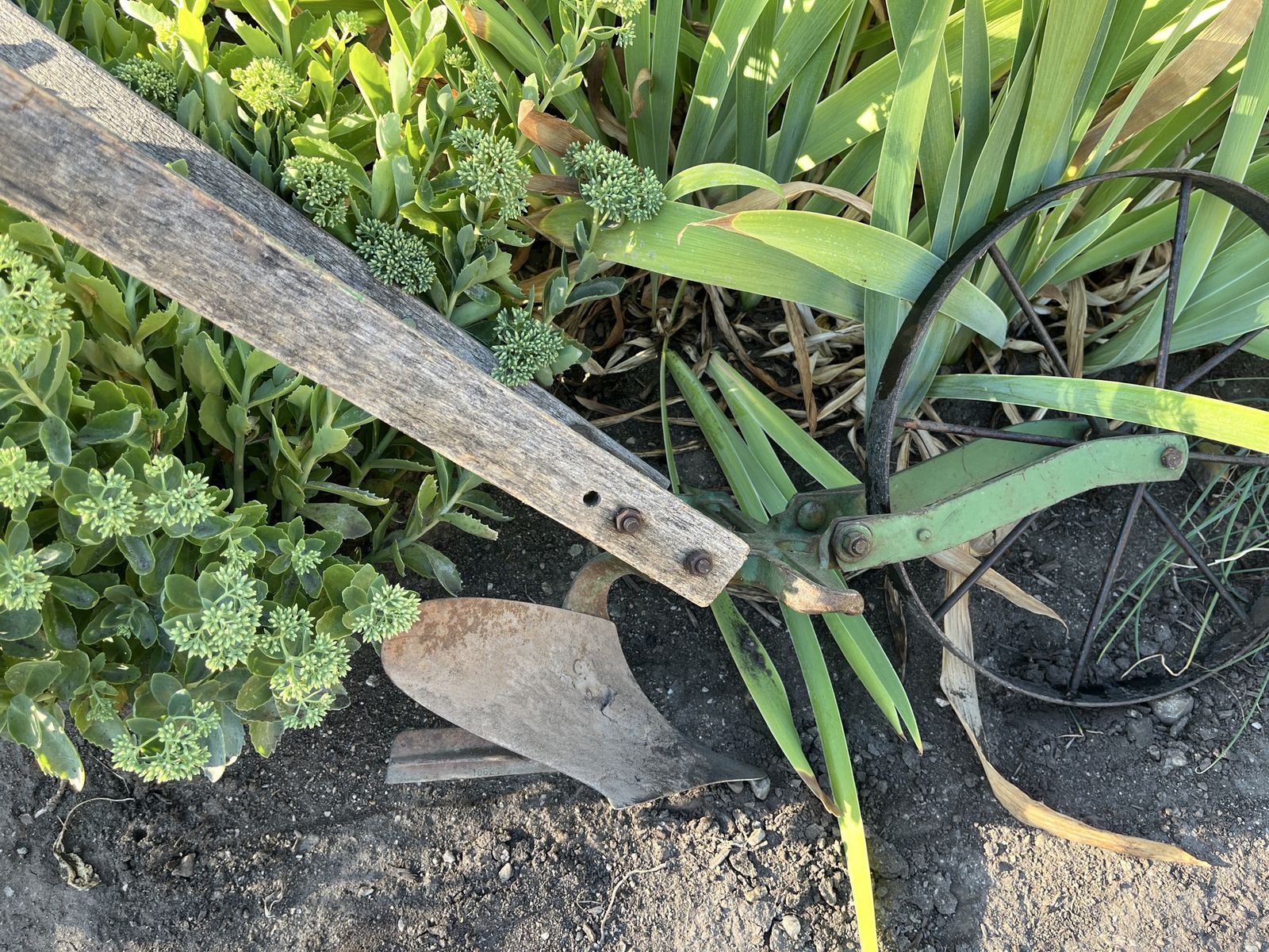 VenmoThis is a wonderful example of a antique farm tool/equipment. One piece of equipment that will do many things. This has a plow blade on it. It also comes with two cultivator pieces and two green colored weed cutters or hoes. So you have three different attachments for this wheel hoe. The metal wheel itself, is 15 inches tall. The wheel hoe is 5 feet 6 inches long x 40 inches tall. The wooden handles are made of a hardwood oak. This is a great tool to use in your garden. It could also be a display item. Price firm.