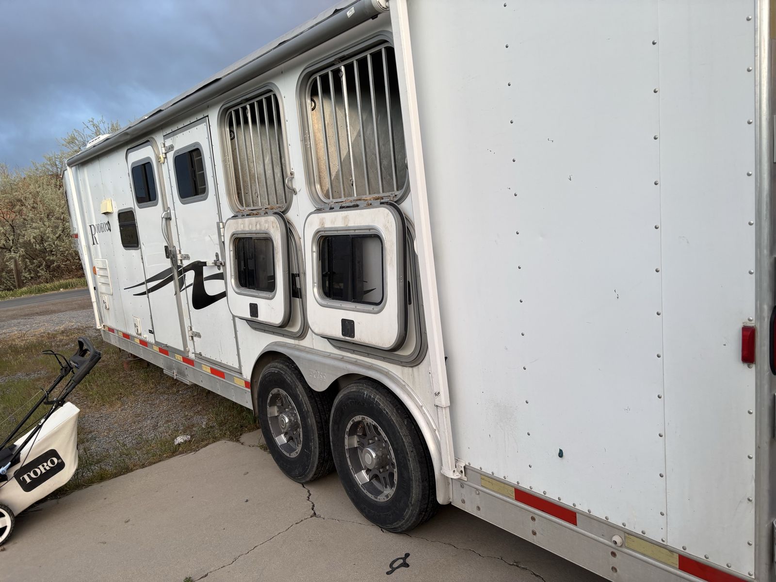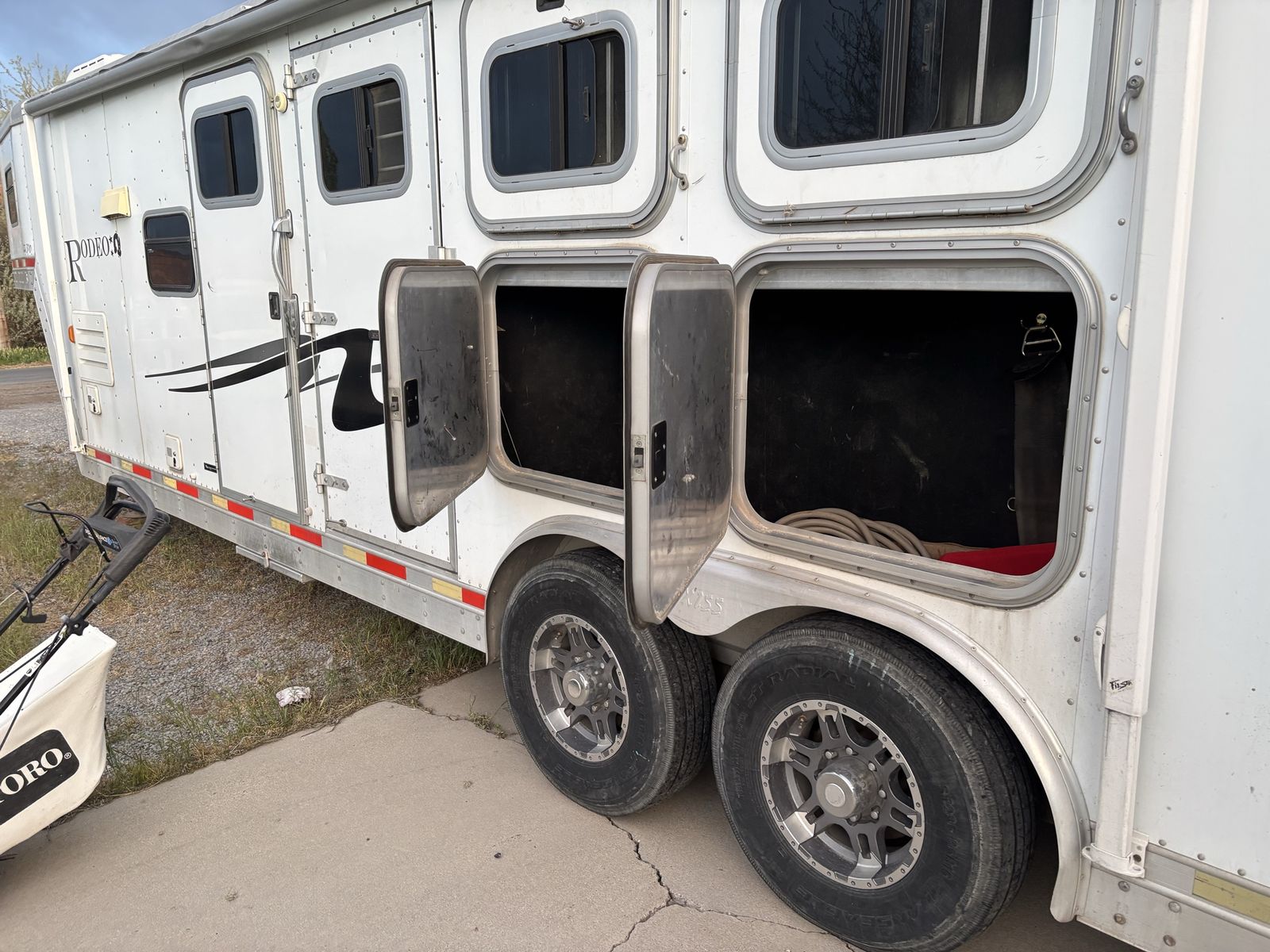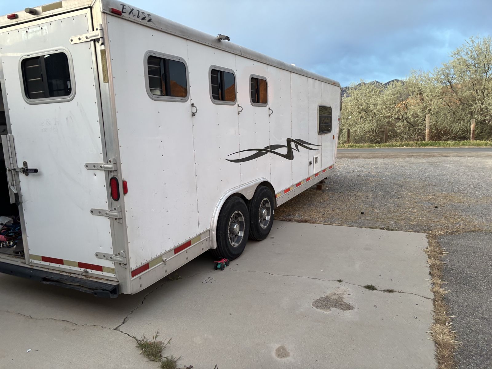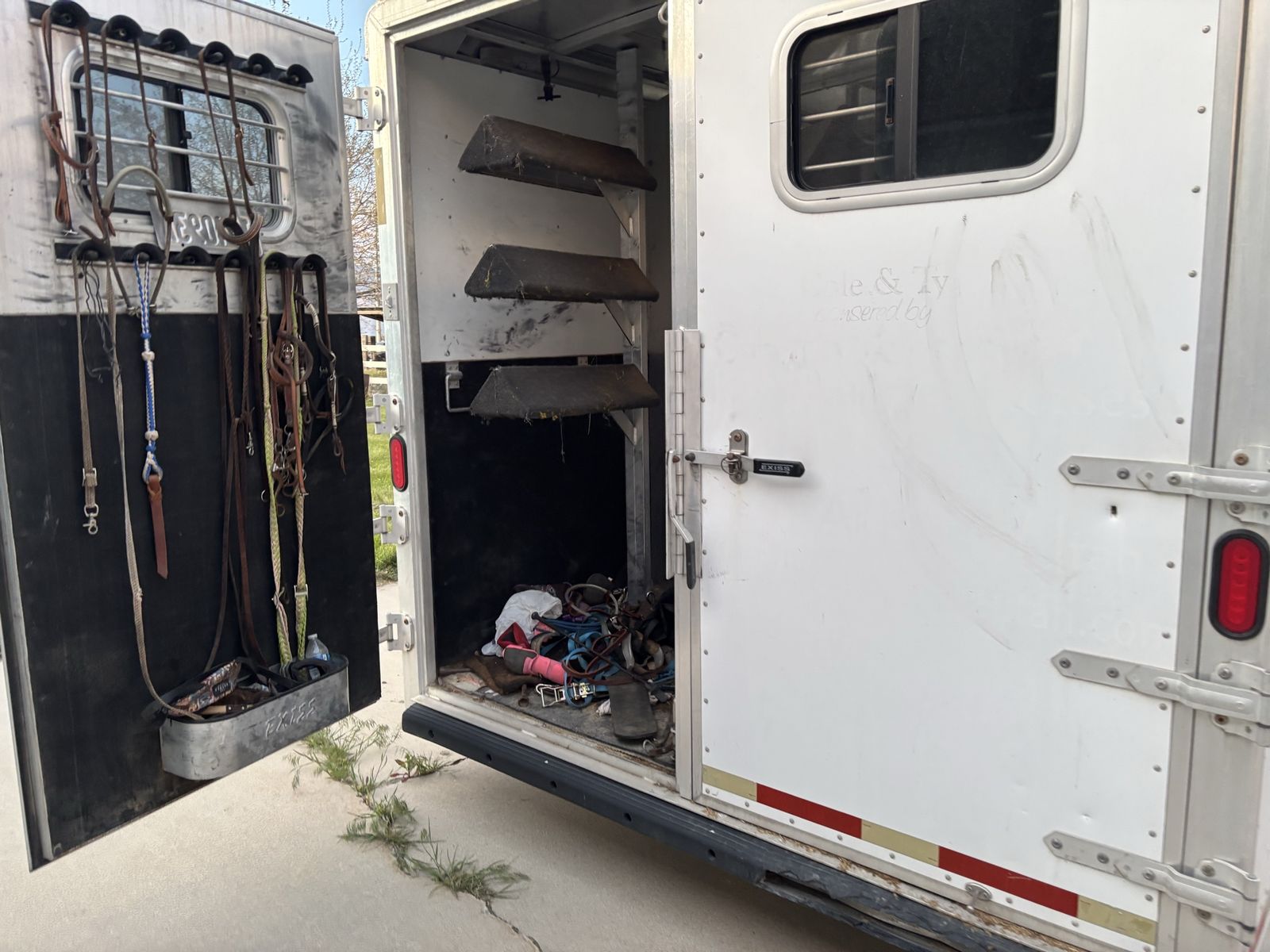 Exiss 3 horse living quarters. With stud stall, mangers, drop down windows on head side, under manger storage, wheels and tires 2 years old, 10ft short wall, 8ft wide, the interior needs finished but is usable we have upgraded and no longer need this one.