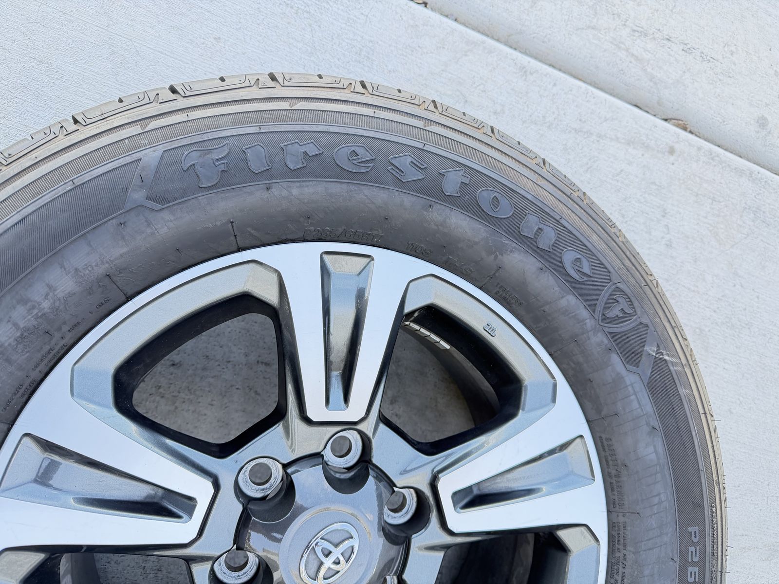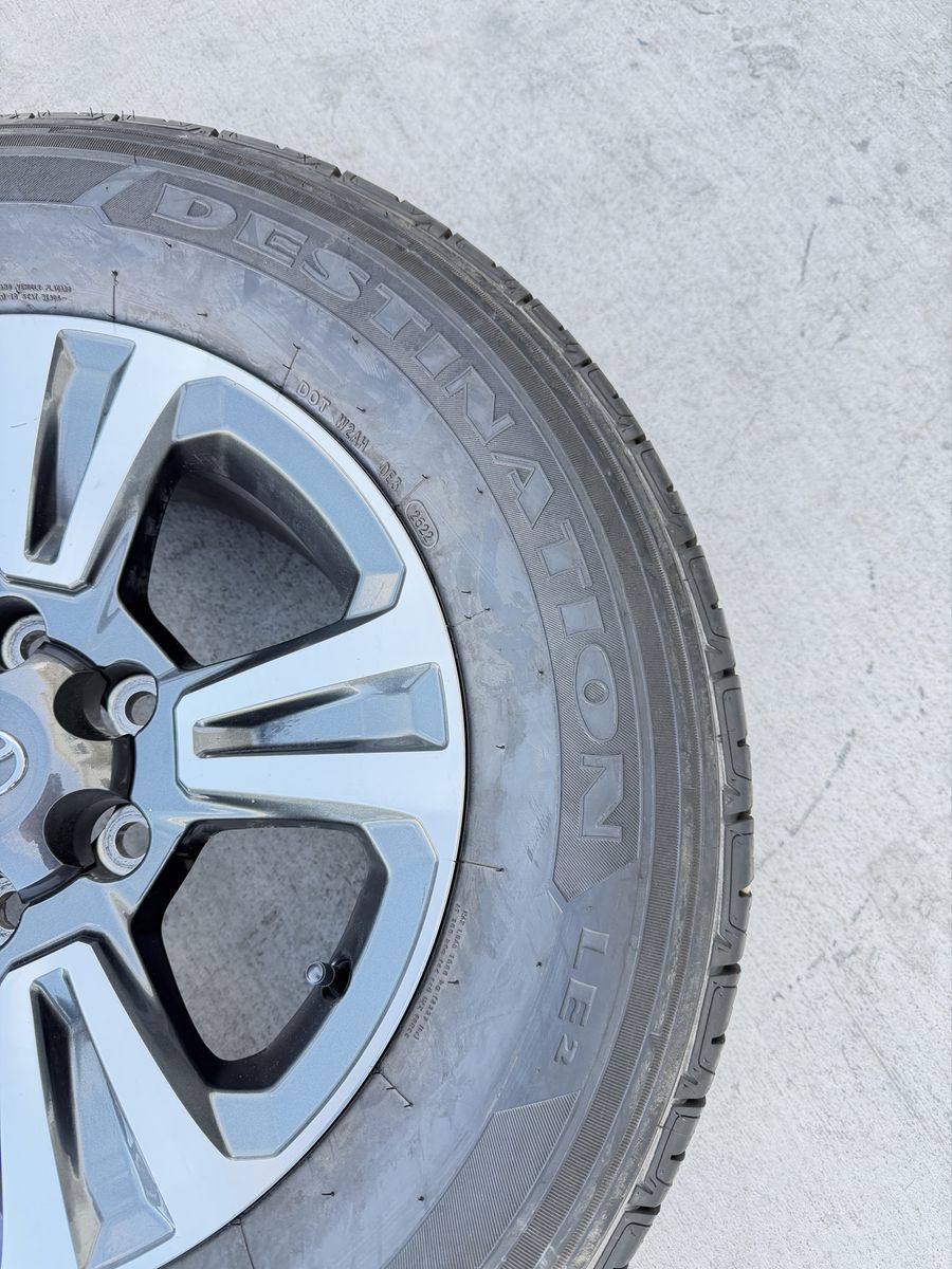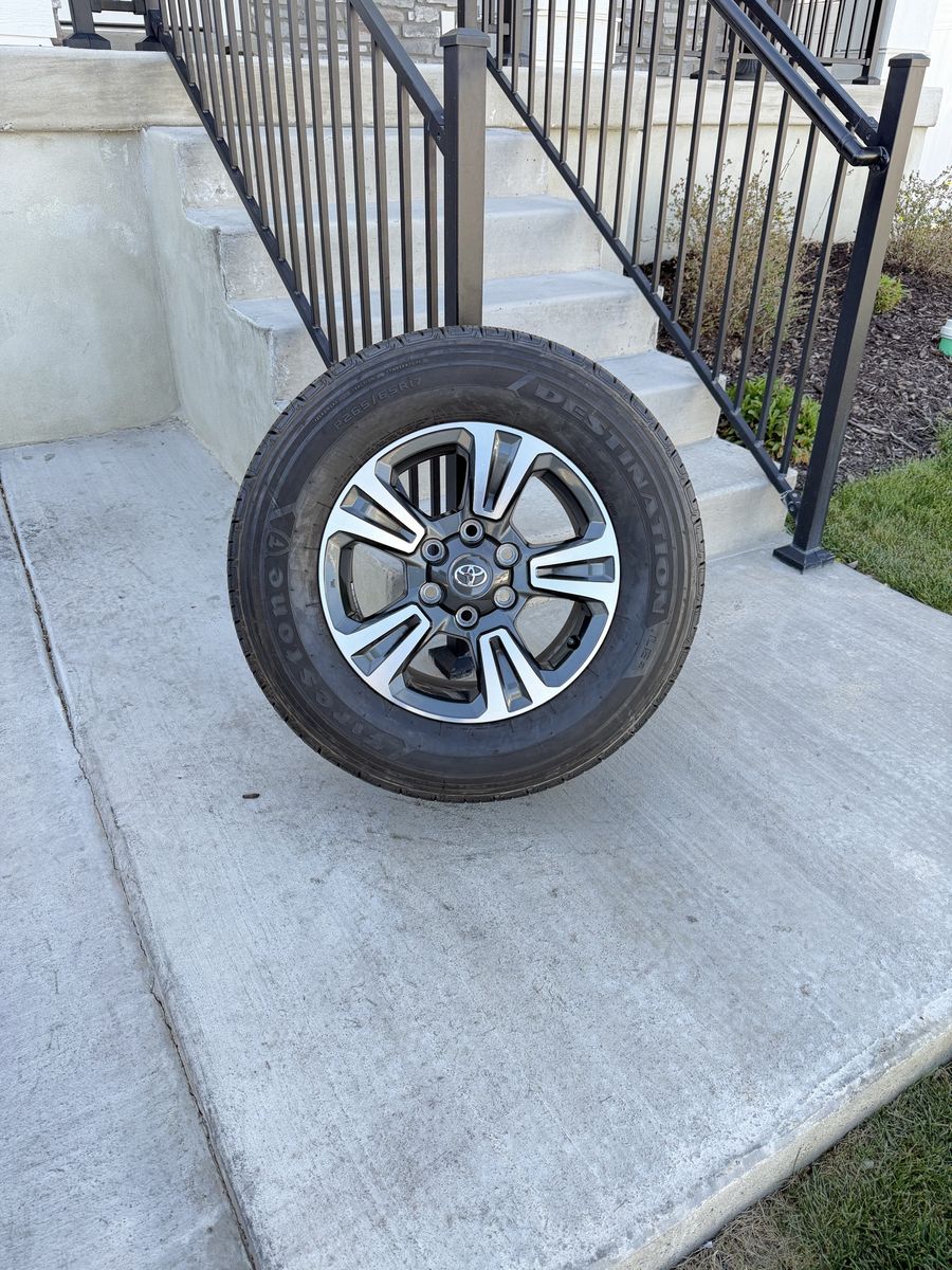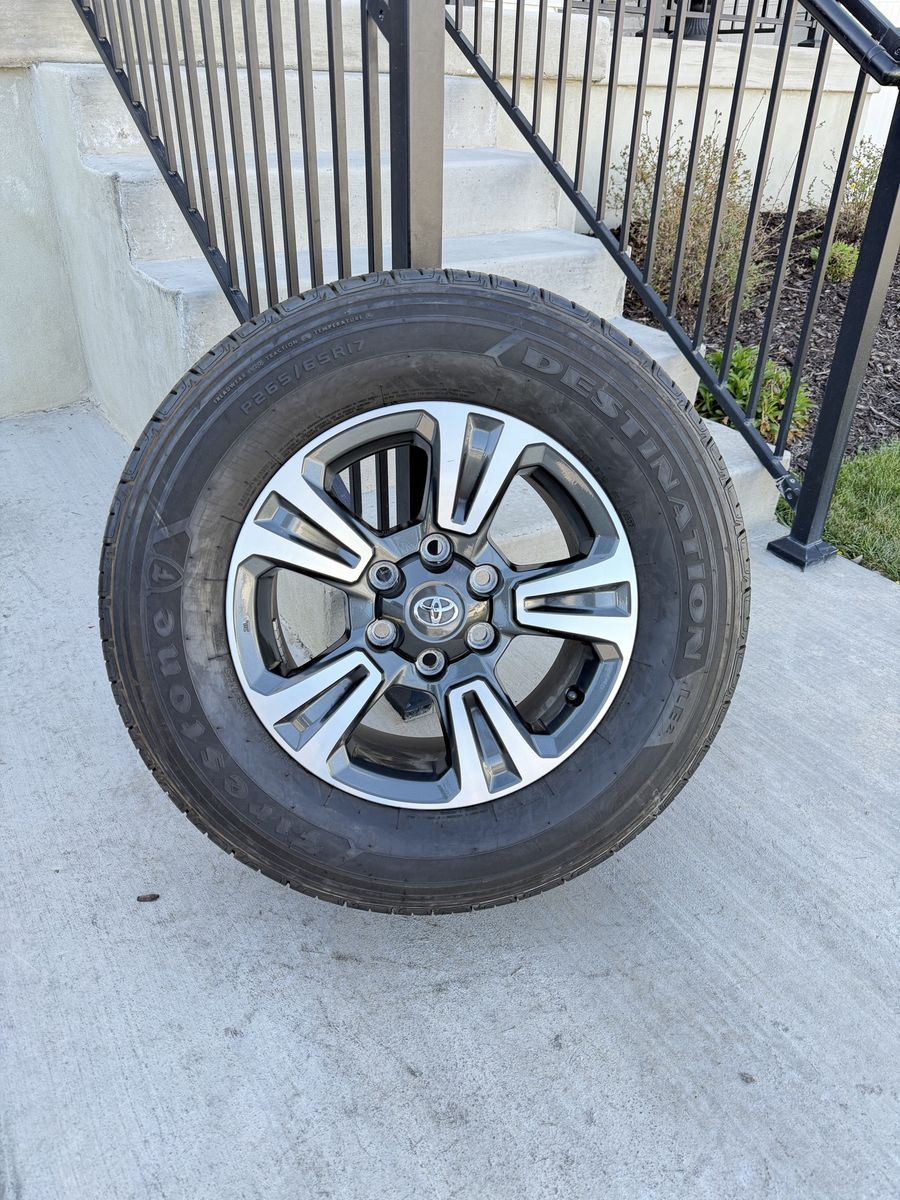 ApplePaySet of 4-Toyota Tacoma 4Runner Rims and Tires 265/65R17 Firestone Destinations like new only 2000 miles on them in excellent condition,asking $1050 obo I can sell the rims or tires separately Bolt pattern 6-5.5/6-139.7 They will fit Toyota Tacoma 4runner tundra sequoia FJ Crusier Text anytime 385-402-2292