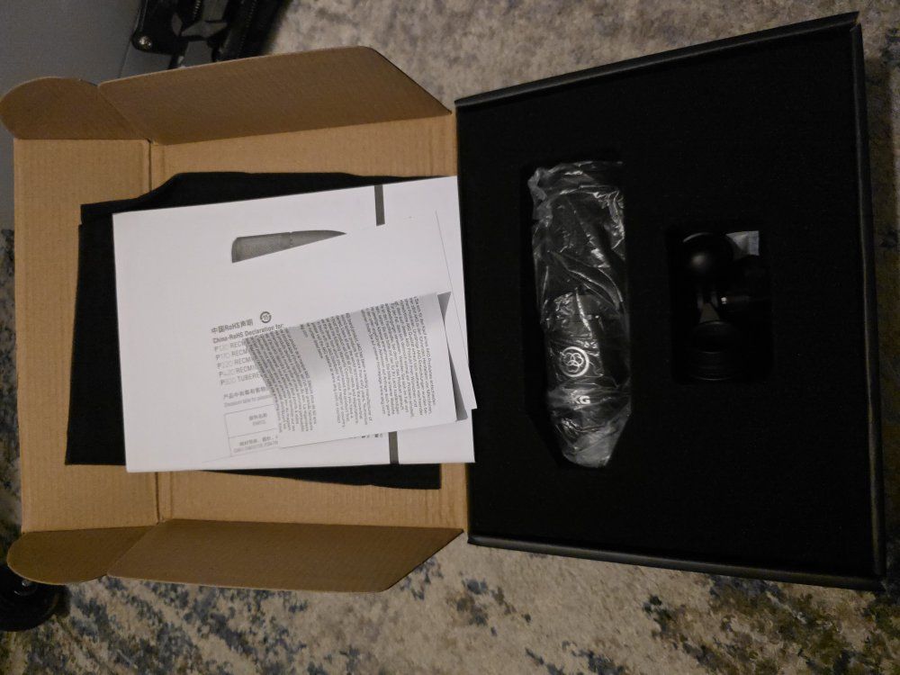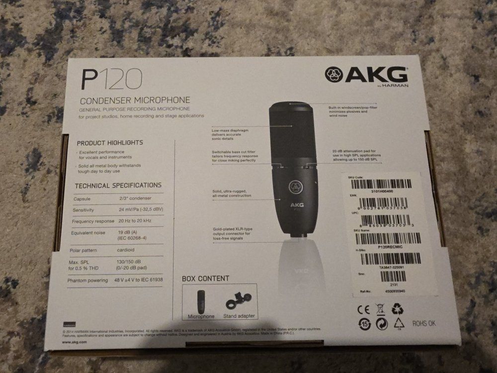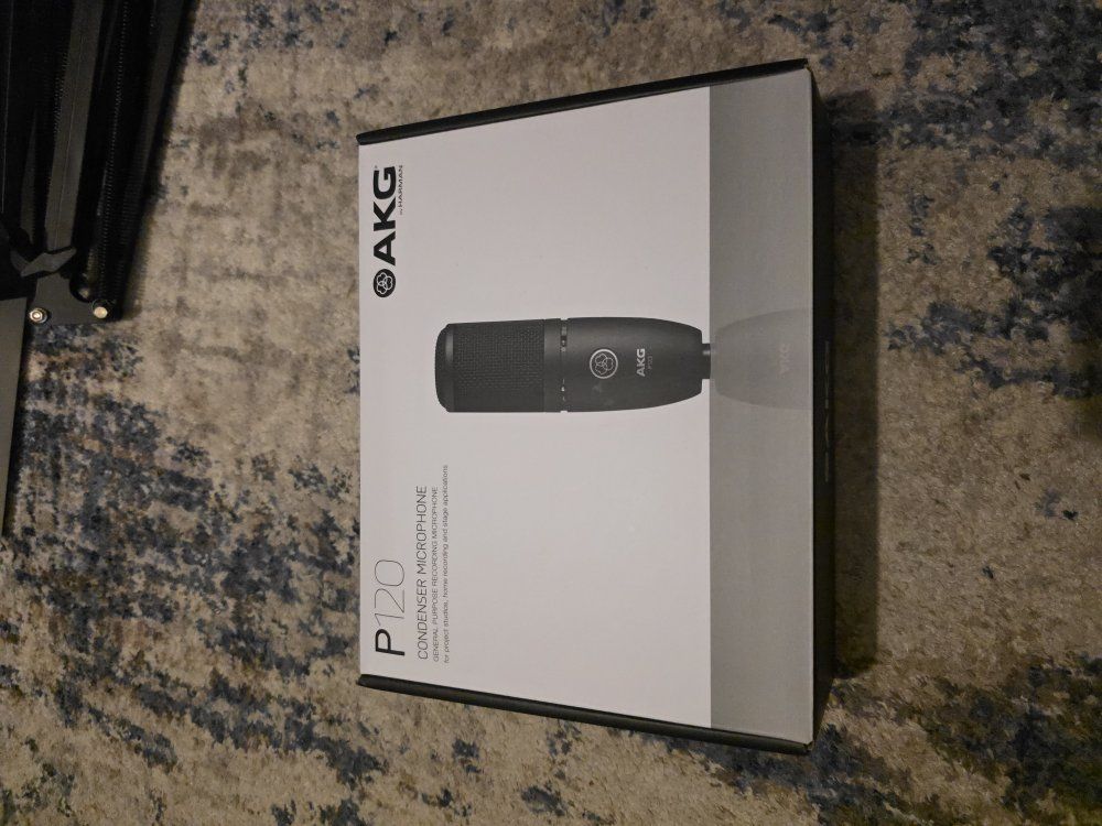 VenmoProfessional AKG P120 condenser microphone comes with original box and manual. Bundle includes adjustable black metal boom arm stand and pop shield for recording. Microphone has cardioid polar pattern and switchable bass cut filter. All items are in great shape and ready for a studio setup.