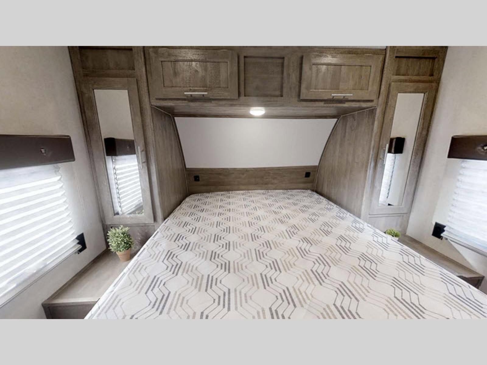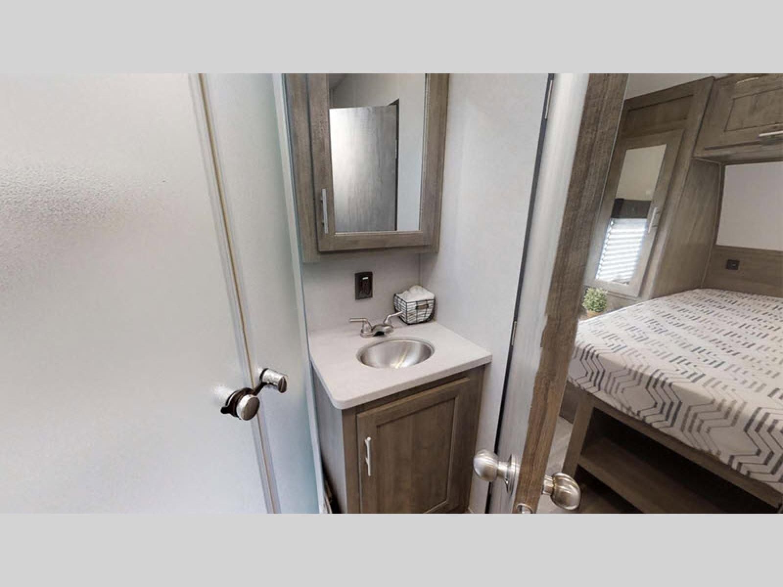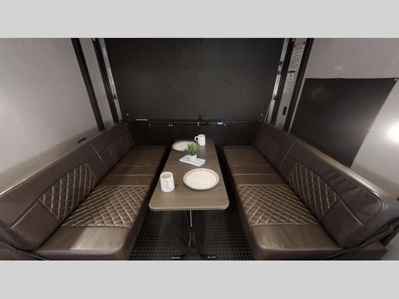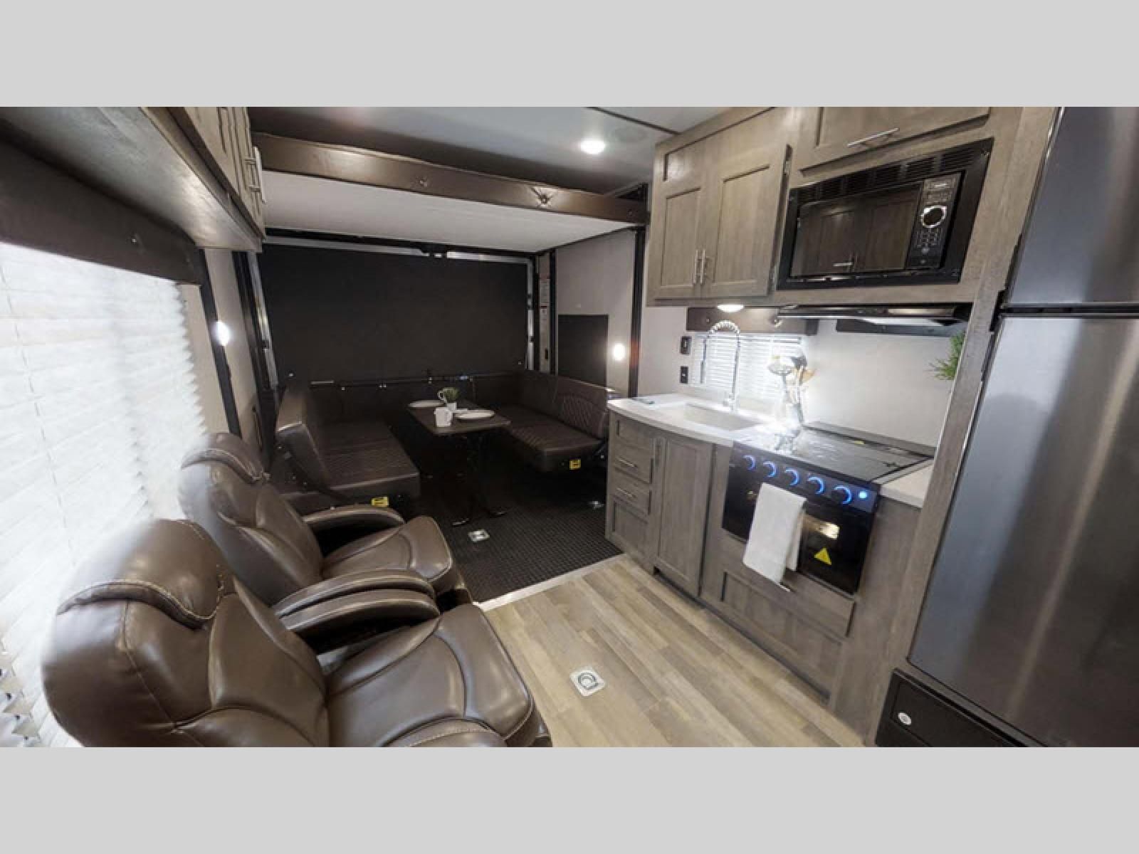 You will love how easy it is to access the dual entry bathroom from the front private bedroom in this toy hauler! Maximize your camping experience with friends and family by adding the optional electric bed and max clearance dinette to the rear and the optional Euro chairs near the fireplace in the living/kitchen area. The kitchen has a three burner cooktop so you can enjoy home cooked meals while camping and a 10 cu. ft. black stainless steel refrigerator to keep your beverages nice and cold!