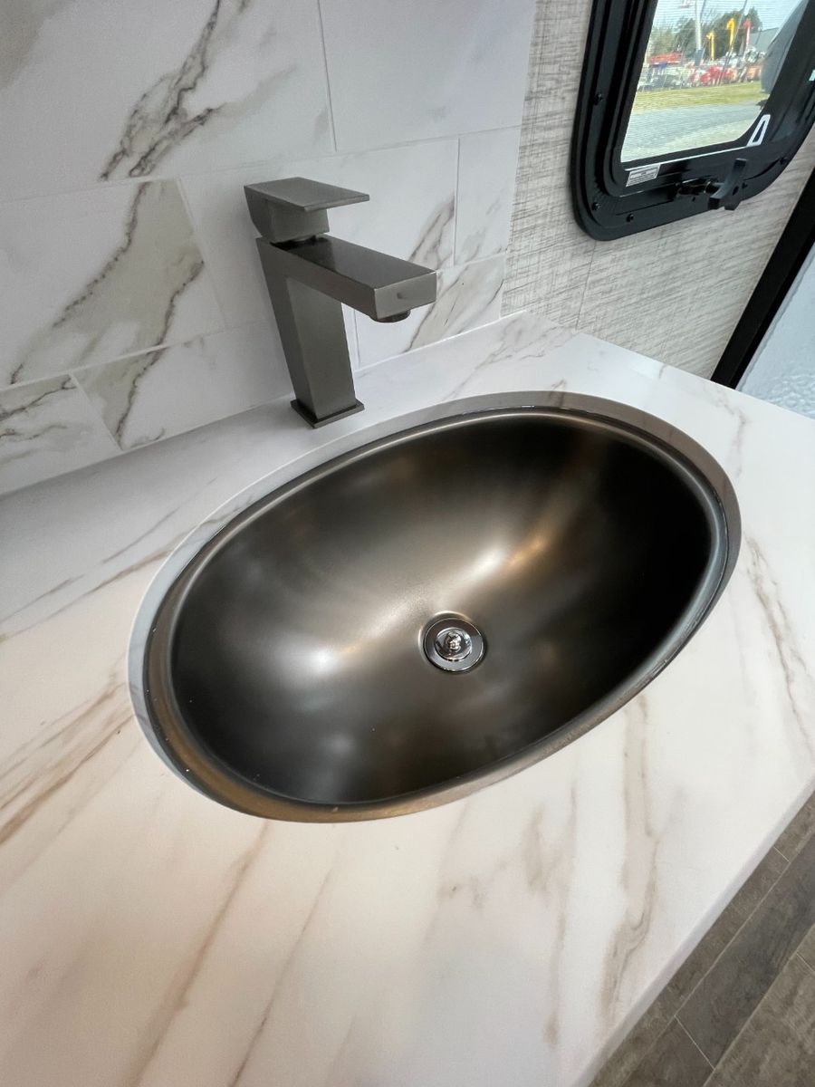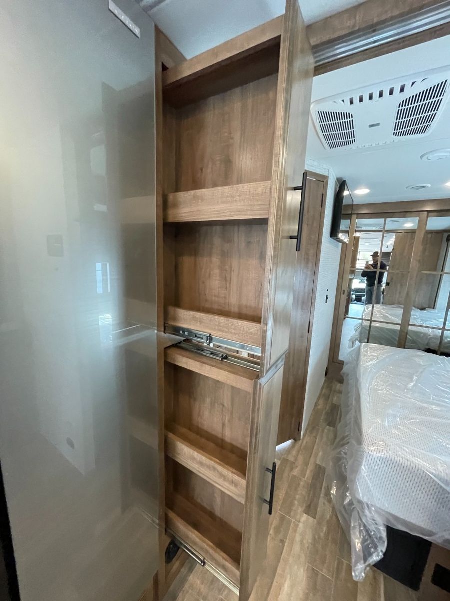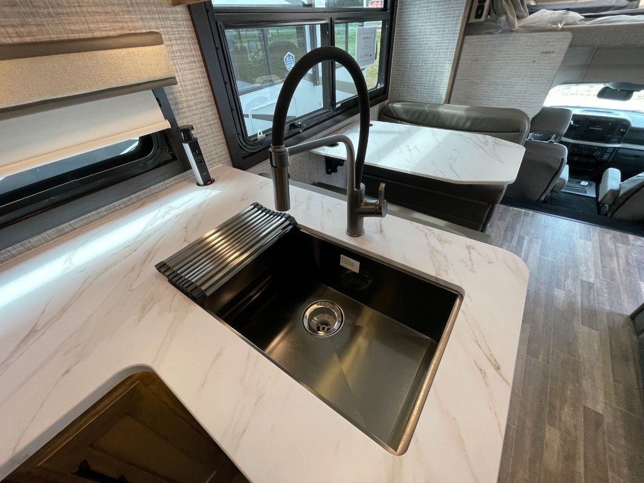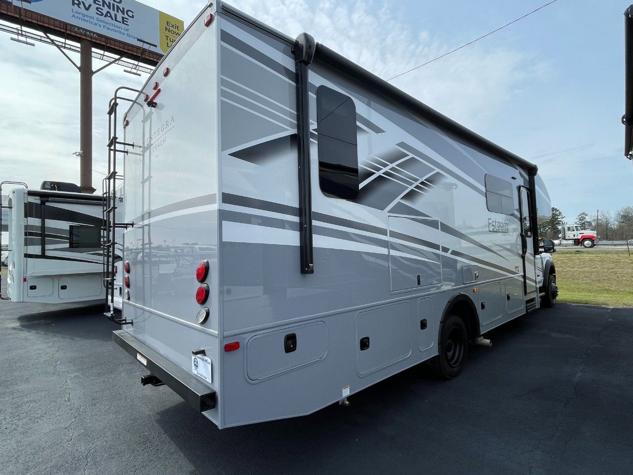 Entegra Coach Esteem XL - Super C Diesel 32U highlights: Rear Corner Bedroom Cab Over Bunk Exterior Entertainment Center Stainless Steel Sinks At the front of the unit, you’ll find two comfortable power driver seats in the cockpit, perfect for relaxing during your journey, along with a cab-over bunk that provides additional sleeping space complete with a privacy curtain and safety net. Moving toward the center, the living and kitchen area offers a welcoming space to unwind, featuring a 68" jackknife sofa to lounge on after a long day, a 10 cu. ft. refrigerator for your groceries, and a pantry for dry goods and snacks. Across from this area, a slide-out expands the space and houses the kitchen, which is fully equipped with an all-in-one cooktop and oven, a residential-sized microwave, and a recessed stainless steel sink with covers, while a nearby 42" x 70" dinette provides the perfect spot for meals or games. Toward the rear, one corner features a full bathroom with a 30" x 36" shower, a foot-flush toilet, and a stainless steel sink for added convenience, while the opposite rear corner offers a bedroom with a 66" x 77" king bed in a slide-out, giving you both comfort and extra walking space, along with a spacious wardrobe for all your belongings and essentials. Built for those who demand both power and comfort, the Esteem XL - Golden State Edition Super C diesel motorhomes by Entegra Coach are engineered to elevate every journey. Equipped with a 6,000W diesel generator with auto-gen start, you’ll enjoy reliable energy wherever you travel, while the 200W solar panel with dual controller and second house battery adds sustainable, off-grid capability. The automatic hydraulic leveling jacks ensures effortless setup at any destination, giving you stability and convenience in minutes. Inside, a 15,000 BTU air conditioning system with heat pump maintains the perfect climate year-round, while the Firefly Multiplex Command Center puts full control of your coach’s systems at your fingertips through an intuitive touchscreen or mobile app bringing together smart technology, comfort, and independence in one seamless experience.