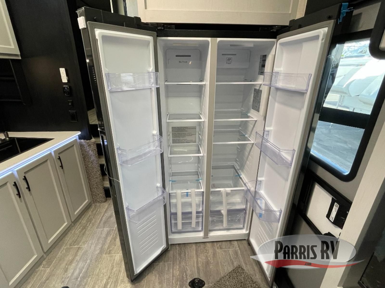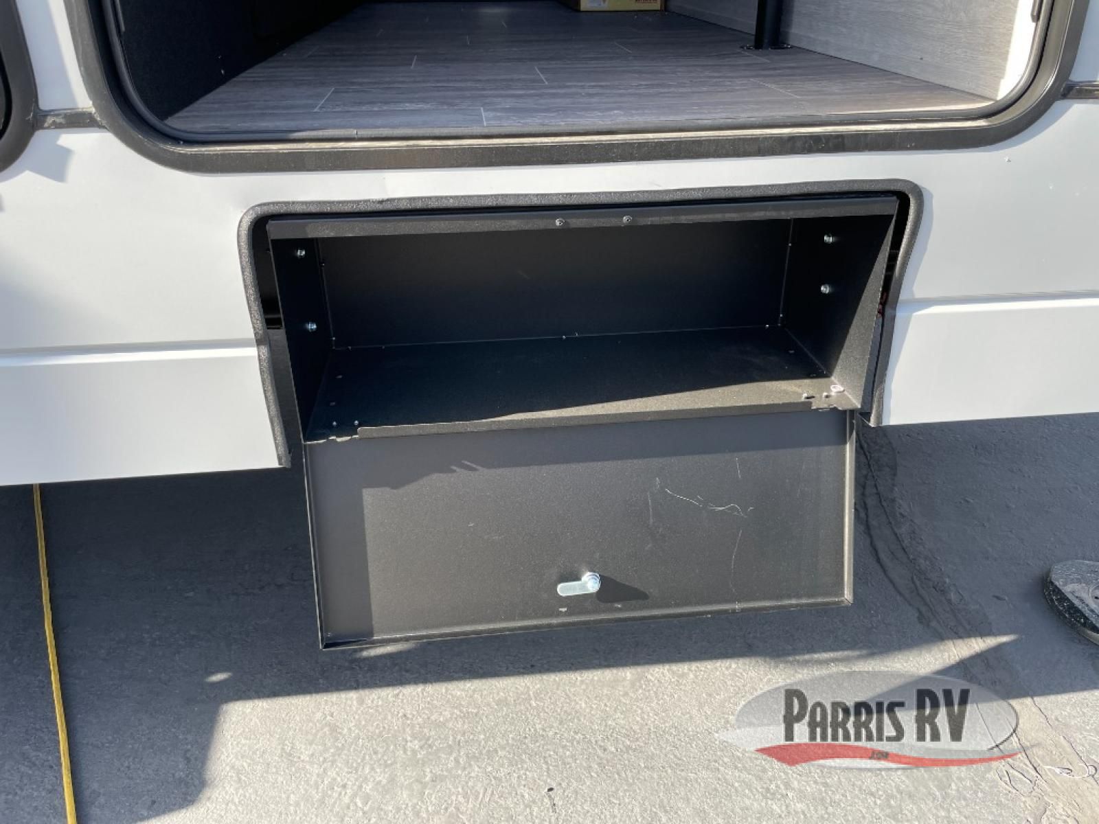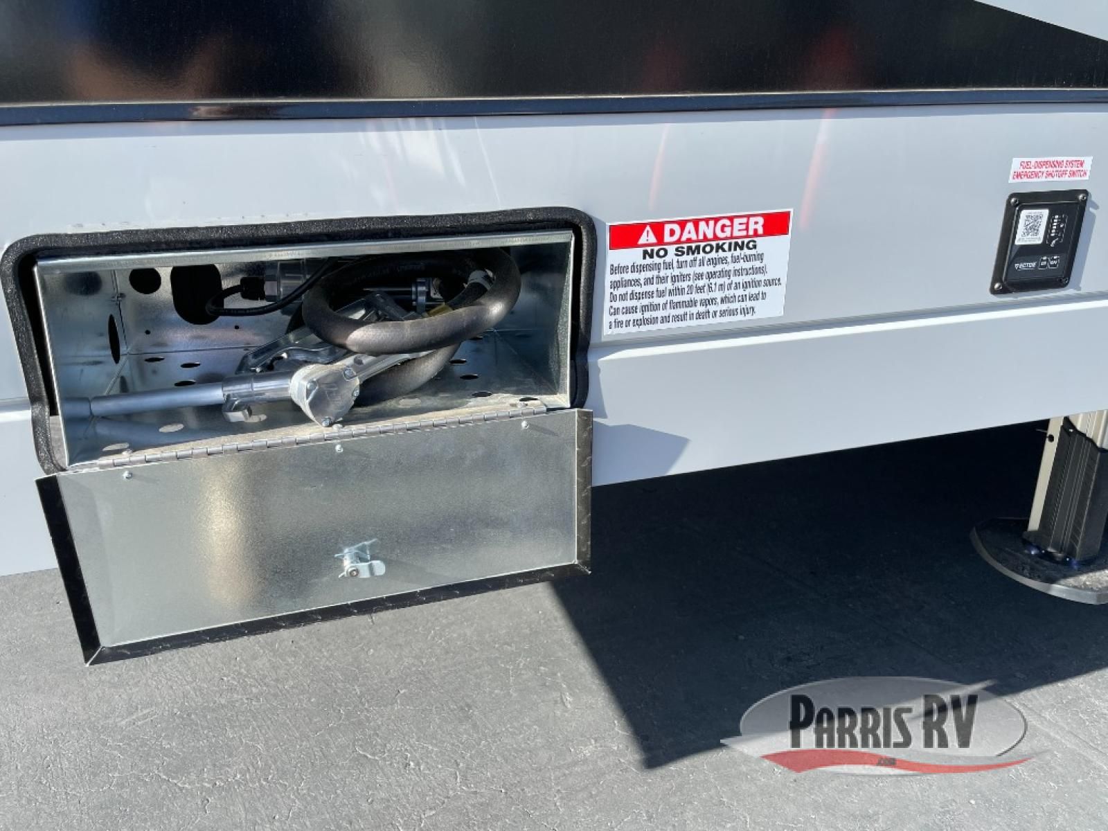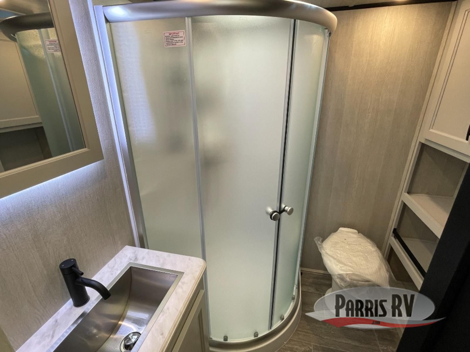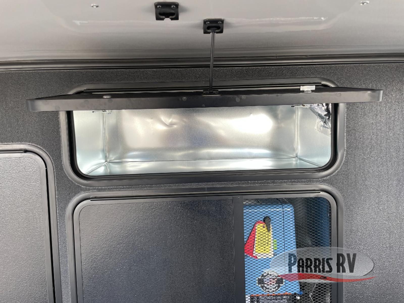 This toy hauler with an angled kitchen will be perfect for all your outdoor adventures. The 17' 6" cargo length and 102" wide body design can easily store your toys on the way to the lake, and the beaver tail ramp door will make unloading a breeze. There is a power sofa bed and dual swivel/rocker chairs to relax on, plus a power queen bed if you have guests stay over. Everyone can freshen up in the spacious full bath and you'll love the front private bedroom with an RV king bed and a vanity/wardrobe slide out to keep your clothes tidy. This model also includes a full kitchen with a three burner cooktop, an extra large over-the-range residential microwave, plus an 8 cu. ft. extra large double door refrigerator!