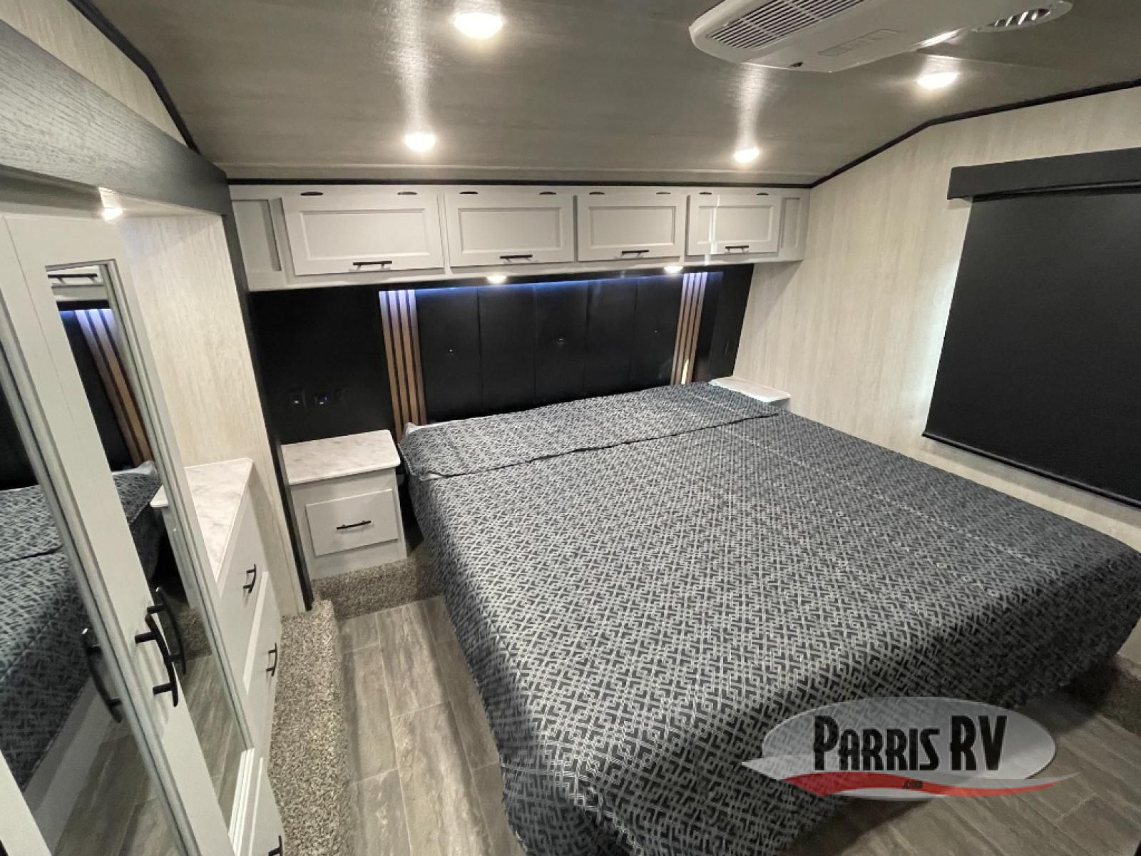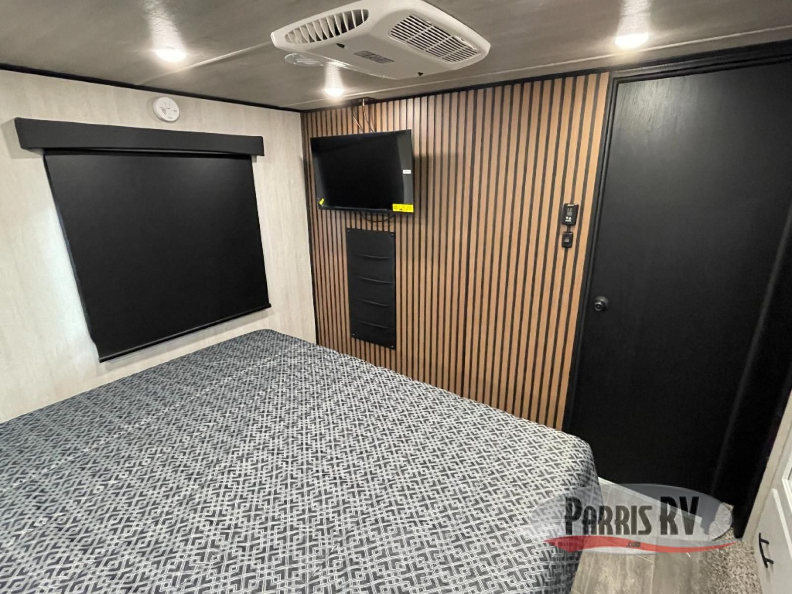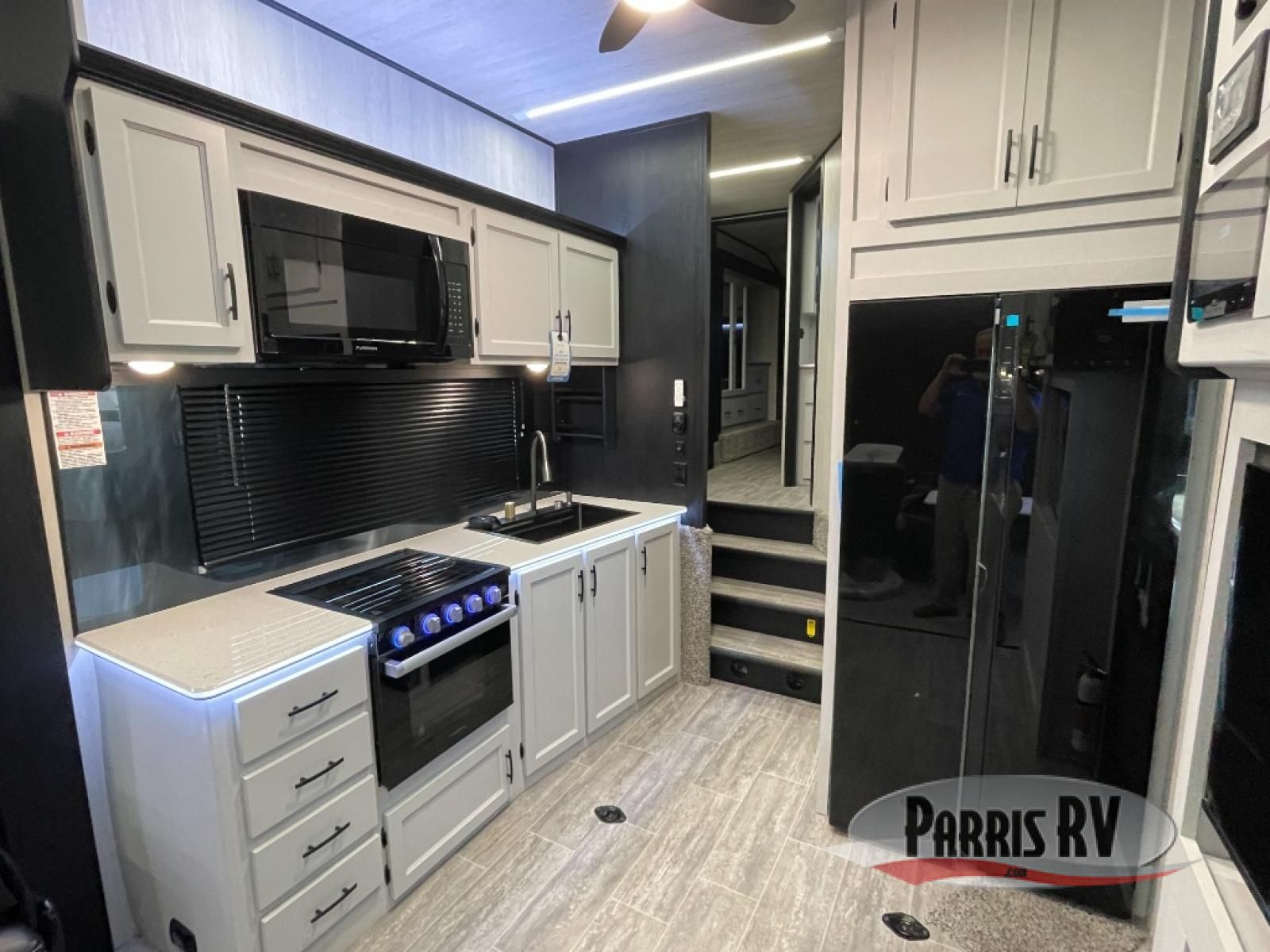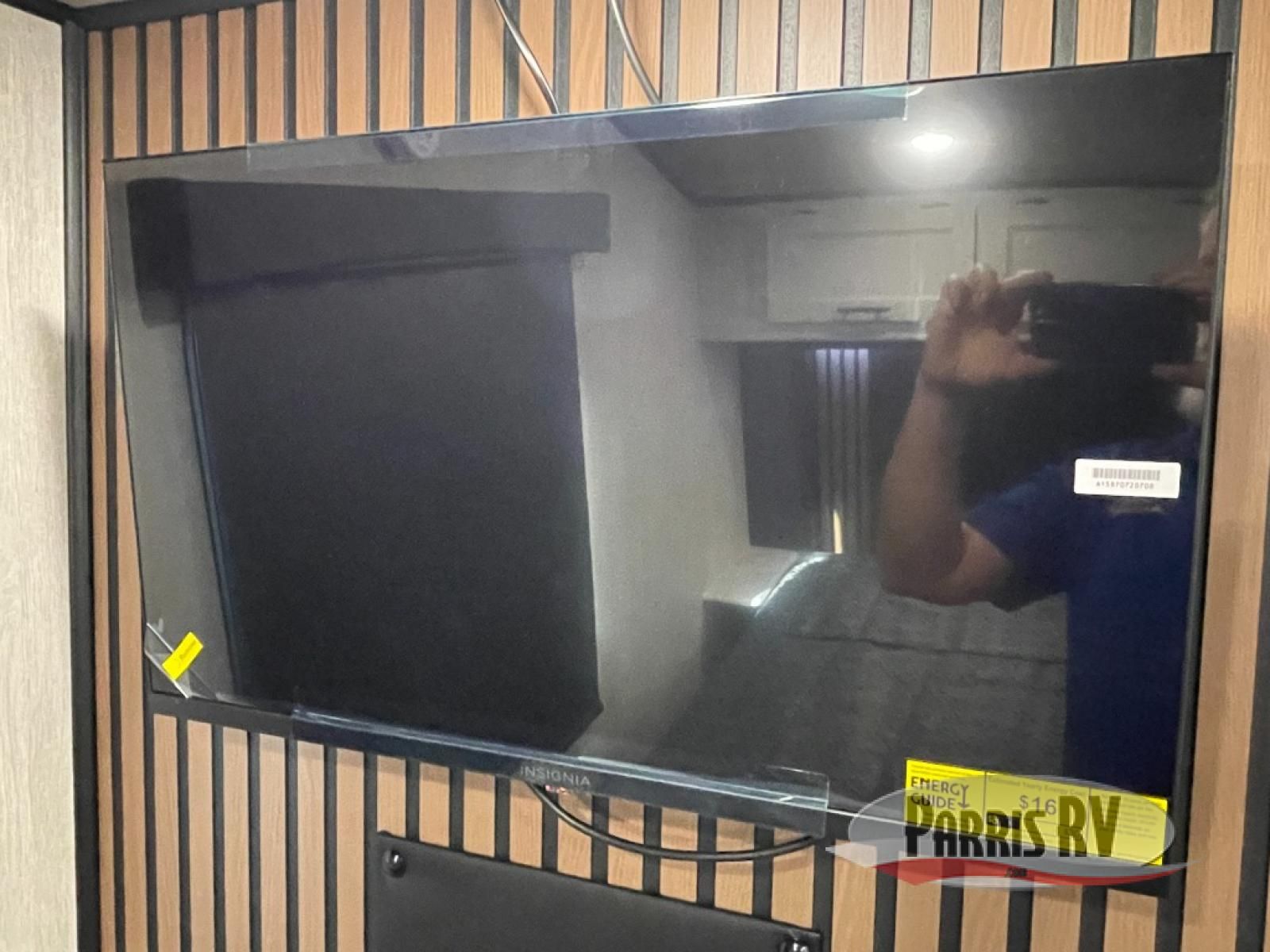 This toy hauler with an angled kitchen will be perfect for all your outdoor adventures. The 17' 6" cargo length and 102" wide body design can easily store your toys on the way to the lake, and the beaver tail ramp door will make unloading a breeze. There is a power sofa bed and dual swivel/rocker chairs to relax on, plus a power queen bed if you have guests stay over. Everyone can freshen up in the spacious full bath and you'll love the front private bedroom with an RV king bed and a vanity/wardrobe slide out to keep your clothes tidy. This model also includes a full kitchen with a three burner cooktop, an extra large over-the-range residential microwave, plus an 8 cu. ft. extra large double door refrigerator!