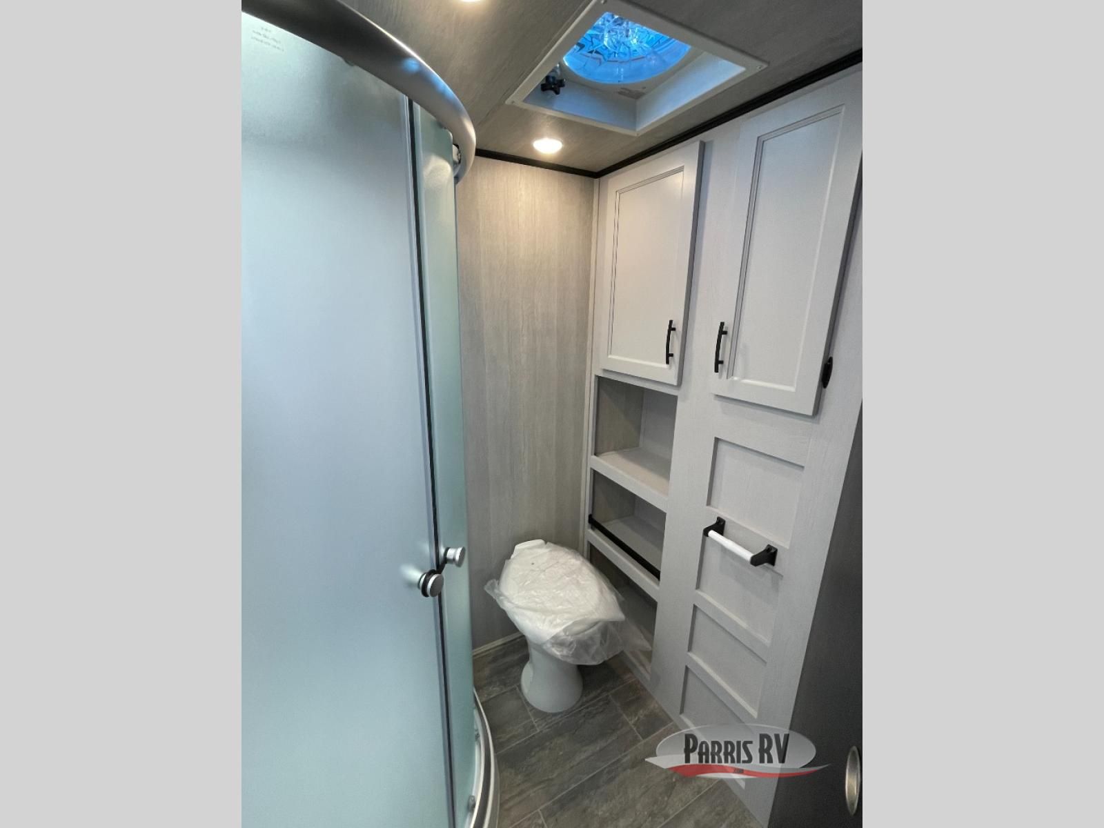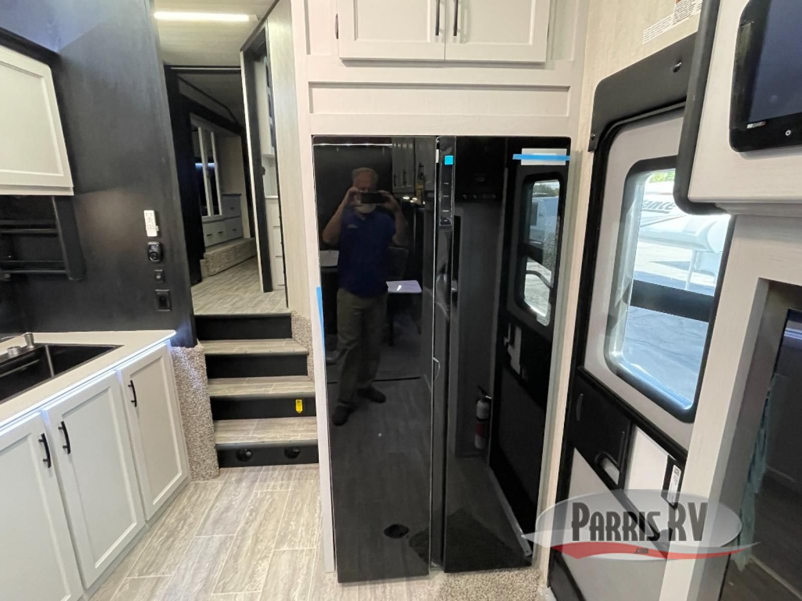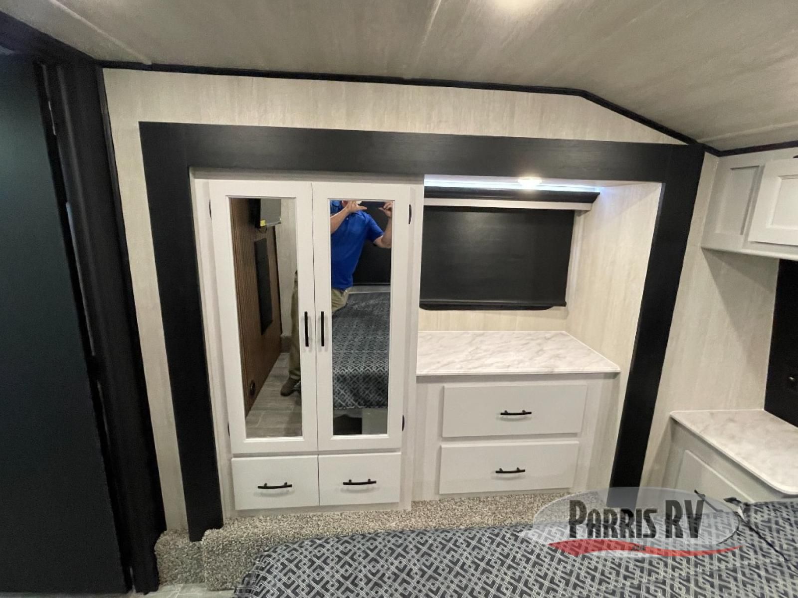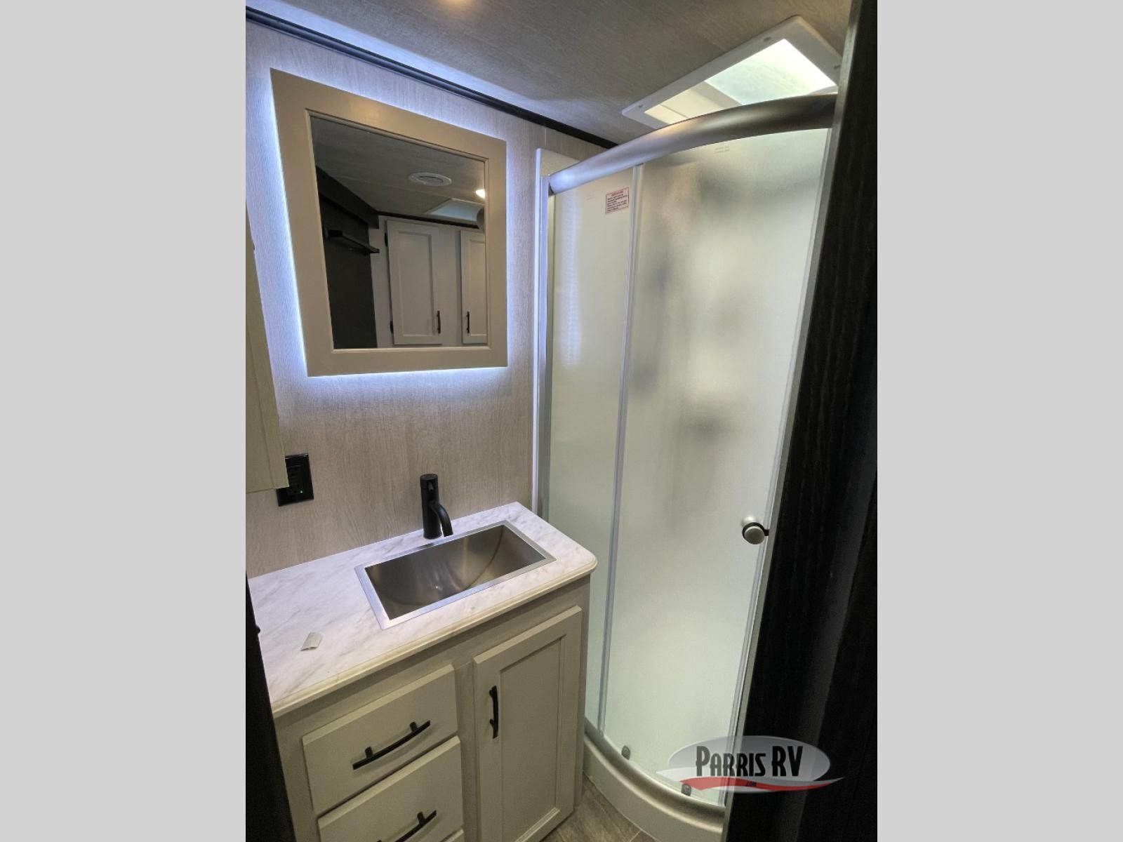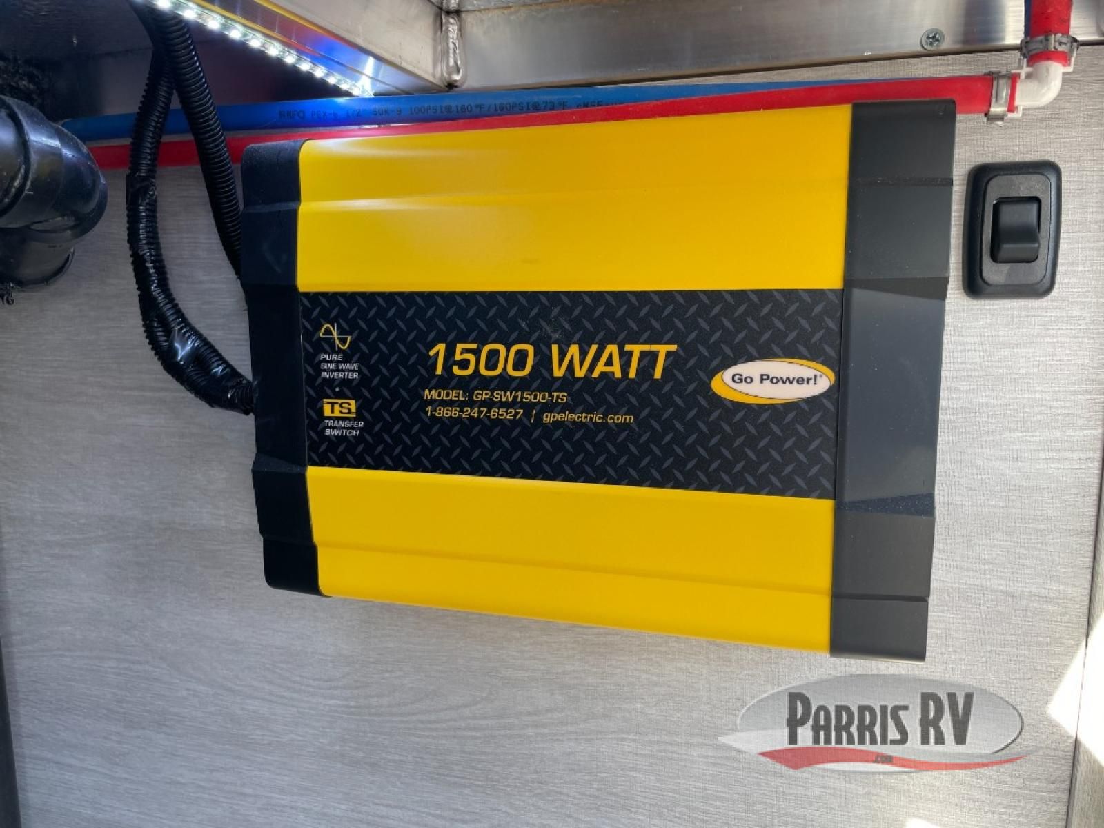 This toy hauler with an angled kitchen will be perfect for all your outdoor adventures. The 17' 6" cargo length and 102" wide body design can easily store your toys on the way to the lake, and the beaver tail ramp door will make unloading a breeze. There is a power sofa bed and dual swivel/rocker chairs to relax on, plus a power queen bed if you have guests stay over. Everyone can freshen up in the spacious full bath and you'll love the front private bedroom with an RV king bed and a vanity/wardrobe slide out to keep your clothes tidy. This model also includes a full kitchen with a three burner cooktop, an extra large over-the-range residential microwave, plus an 8 cu. ft. extra large double door refrigerator!