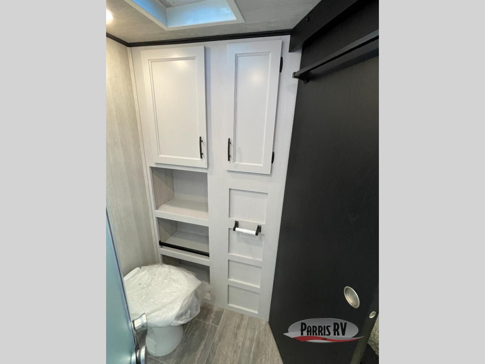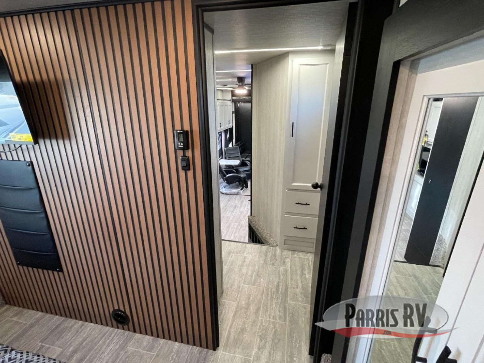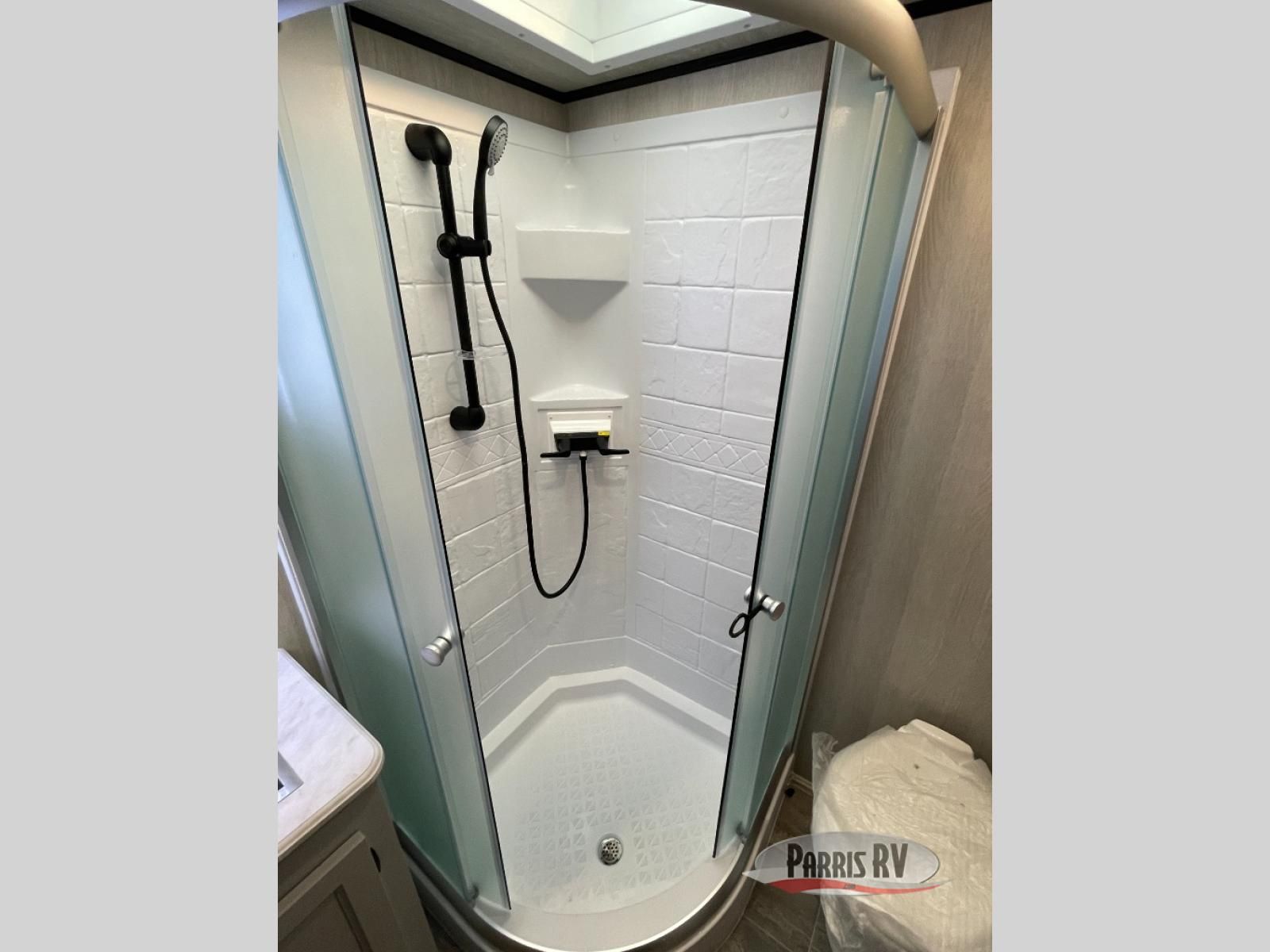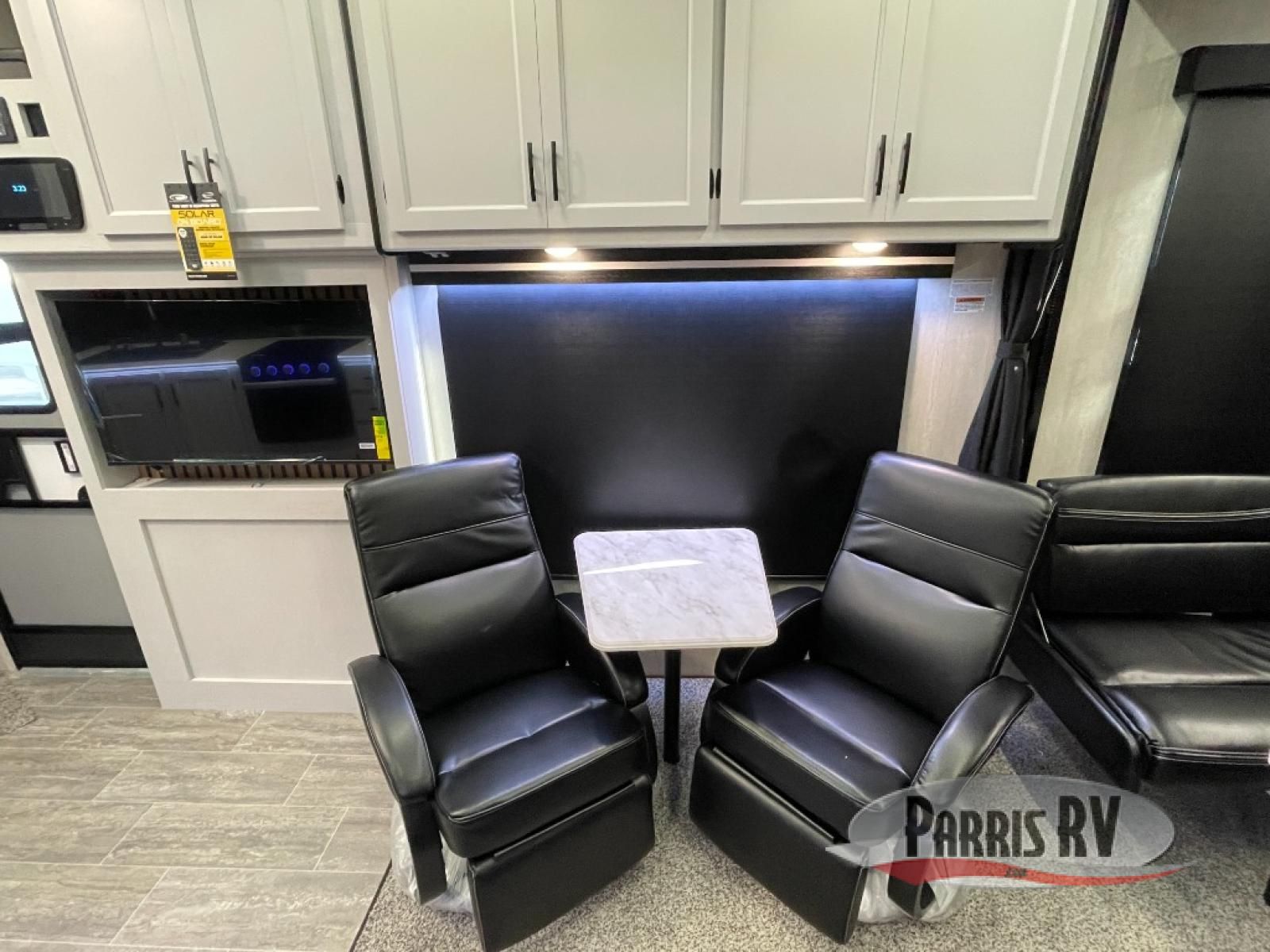 This toy hauler with an angled kitchen will be perfect for all your outdoor adventures. The 17' 6" cargo length and 102" wide body design can easily store your toys on the way to the lake, and the beaver tail ramp door will make unloading a breeze. There is a power sofa bed and dual swivel/rocker chairs to relax on, plus a power queen bed if you have guests stay over. Everyone can freshen up in the spacious full bath and you'll love the front private bedroom with an RV king bed and a vanity/wardrobe slide out to keep your clothes tidy. This model also includes a full kitchen with a three burner cooktop, an extra large over-the-range residential microwave, plus an 8 cu. ft. extra large double door refrigerator!