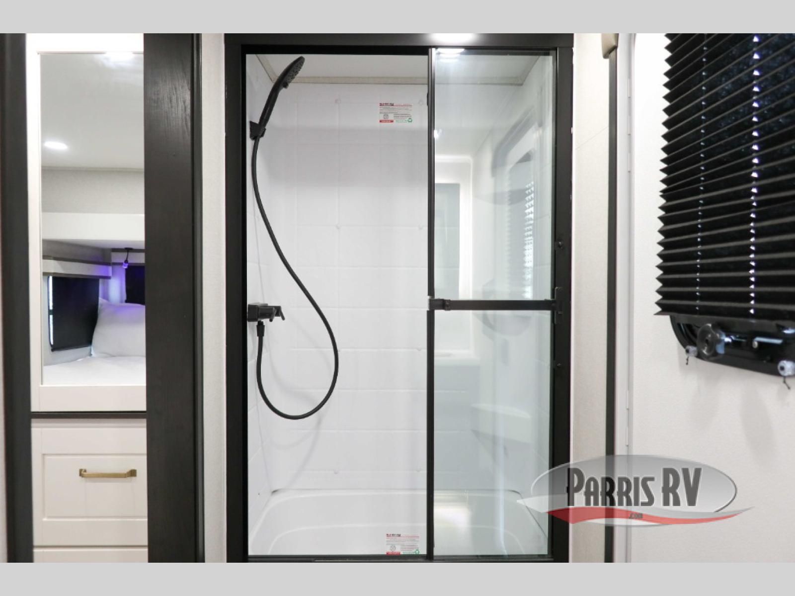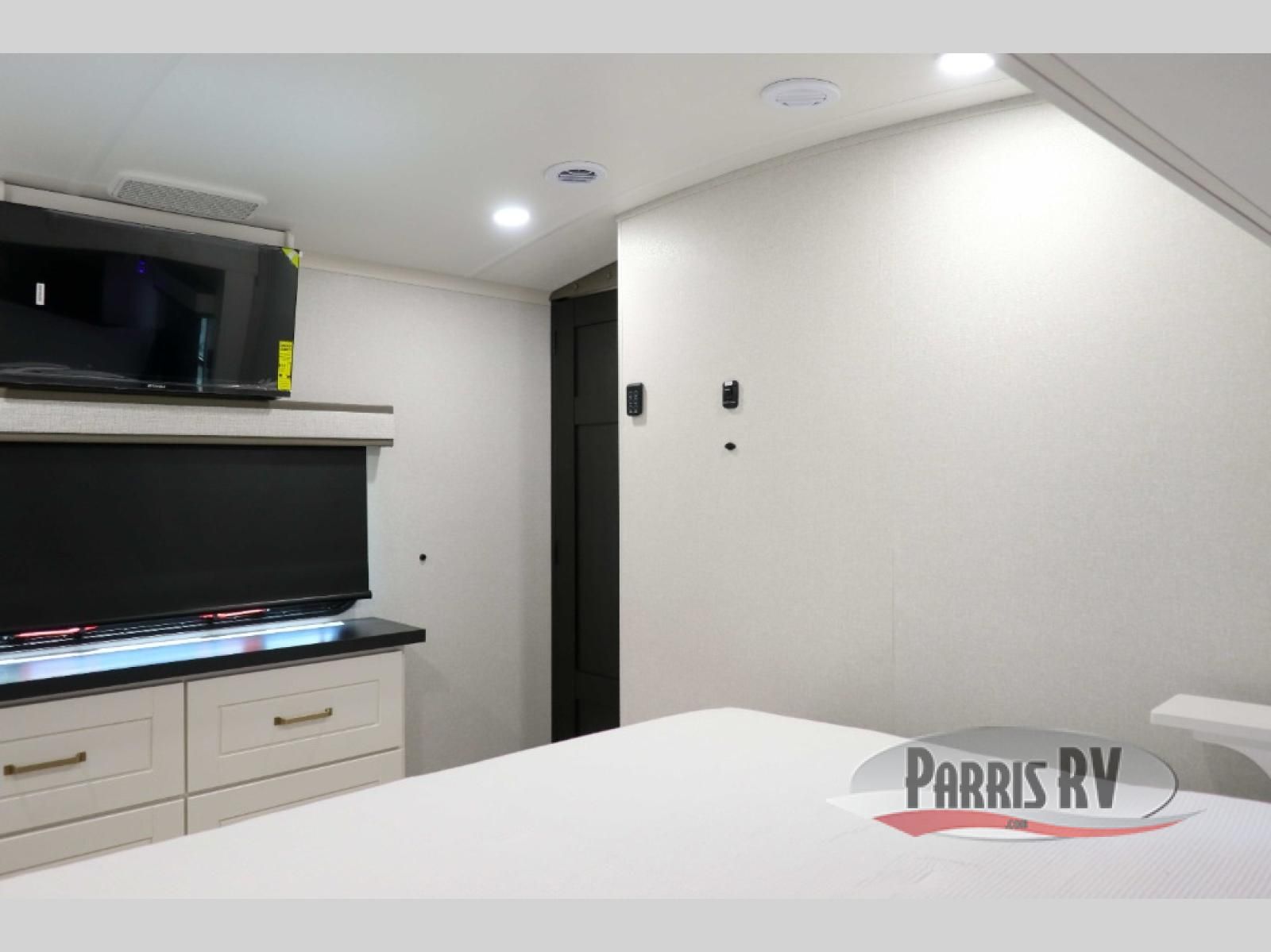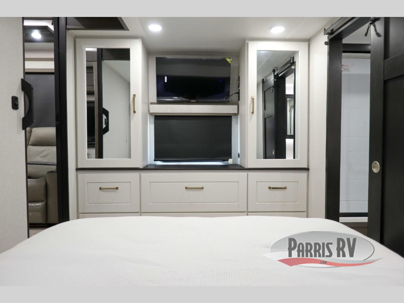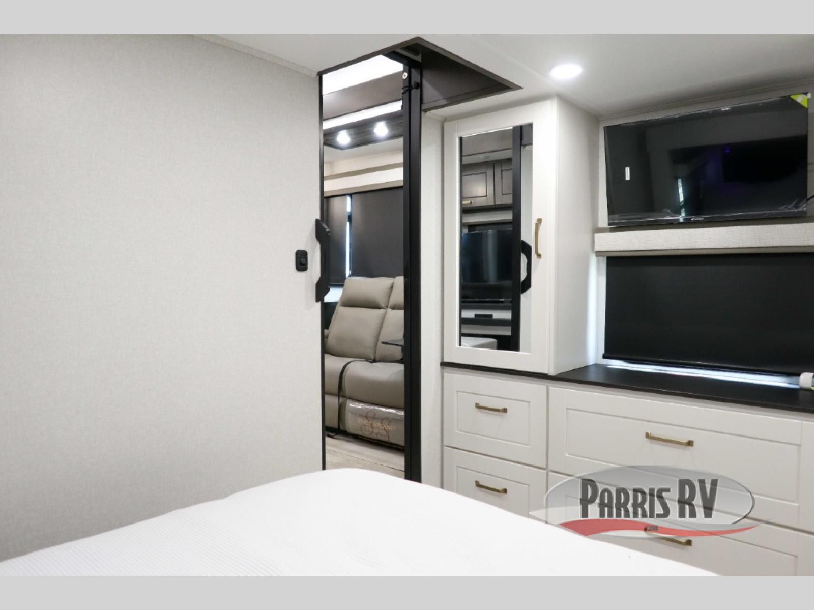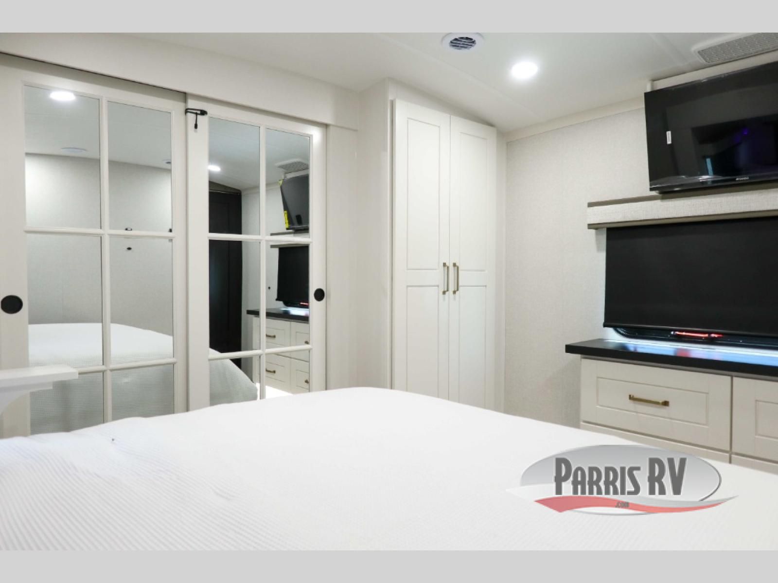 At the front of the 40DB fifth wheel, you'll find the inviting front bedroom featuring a spacious 72" x 80" king bed, perfect for a restful night's sleep. This room also includes a wardrobe and a flip-up dresser with a TV above, providing plenty of storage for clothing and essentials. Moving down the hall, one of two full bathrooms offers a 36" x 48" shower with a built-in seat for added accessibility, along with linen shelves for extra storage. At the center of the trailer, the main living area opens up with dual opposing slides for maximum comfort and room to move. One slide houses a 21-cu. ft. residential refrigerator and a 30" space-saving convection microwave with a built-in air fryer, while the central kitchen island includes a sink and pull-out cutting board, everything you need to prepare meals on the go. Across the way, the opposite slide features a roll-out table and theater seating, creating the perfect space to dine and relax after a long day. At the rear, the second bedroom includes a 60" x 80" queen bed in a slide-out with two wardrobes opposite for ample storage, plus a private full bathroom complete with a tub/shower combo and its own exterior exit for added convenience. Above it all, the loft provides three 30" x 80" bed mats and a loft cabinet, offering extra-sleeping space or additional storage for the whole family's adventures.